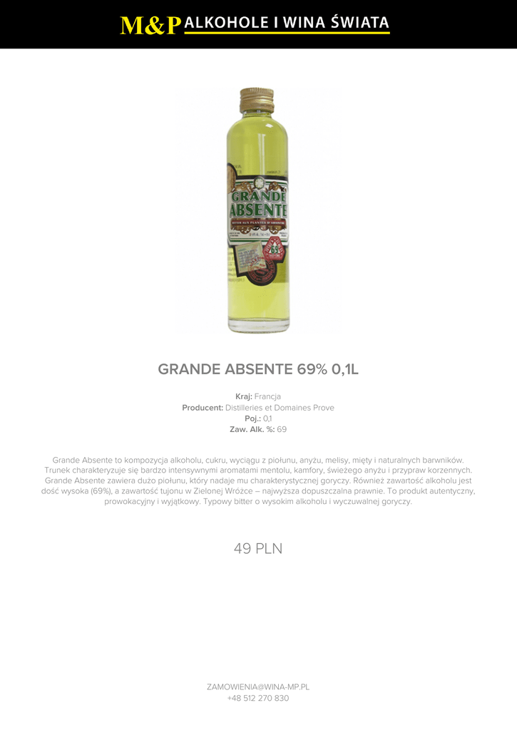 GRANDE ABSENTE 69% 0,1L Kraj: Francja Producent: Distilleries et Domaines Prove Poj.: 0,1 Zaw. Alk. %: 69 Grande Absente to kompozycja alkoholu, cukru, wyciągu z piołunu, anyżu, melisy, mięty i naturalnych barwników. Trunek charakteryzuje się bardzo intensywnymi aromatami mentolu, kamfory, świeżego anyżu i przypraw korzennych. Grande Absente zawiera dużo piołunu, który nadaje mu charakterystycznej goryczy. Również zawartość alkoholu jest dość wysoka (69%), a zawartość tujonu w Zielonej Wróżce – najwyższa dopuszczalna prawnie. To produkt autentyczny, prowokacyjny i wyjątkowy. Typowy bitter o wysokim alkoholu i wyczuwalnej goryczy. 49 PLN [email protected] +48 512 270 830