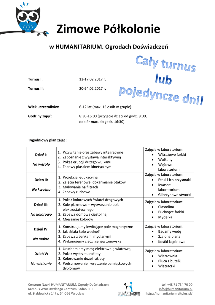 Zimowe Półkolonie w HUMANITARIUM. Ogrodach Doświadczeń Turnus I: 13-17.02.2017 r. Turnus II: 20-24.02.2017 r. Wiek uczestników: 6-12 lat (max. 15 osób w grupie) Godziny zajęć: 8:30-16:00 (przyjęcie dzieci od godz. 8:00, odbiór max. do godz. 16:30) Tygodniowy plan zajęć: Dzień I: Na wesoło Dzień II: Na kwaśno Dzień III: Na kolorowo Dzień IV: Na mokro Dzień V: Na wietrznie 1. 2. 3. 4. Przywitanie oraz zabawy integracyjne Zapoznanie z wystawą interaktywną Pokaz erupcji dużego wulkanu Zabawy piaskiem kinetycznym 1. 2. 3. 4. Projekcja edukacyjna Zajęcia terenowe: dokarmianie ptaków Malowanie na filtrach Zabawy ruchowe Zajęcia w laboratorium: Witrażowe farbki Wulkany Wężowe laboratorium Zajęcia w laboratorium: Ptaki i ich przysmaki Kwaśne laboratorium Glicerynowe stworki 1. Pokaz kolorowych świateł drogowych 2. Kule plazmowe – wytwarzanie pola elektrostatycznego 3. Zabawa domową ciastoliną 4. Mieszanie kolorów Zajęcia w laboratorium: Ciastolina Puchnące farbki Mydełka 1. 2. 3. 4. Konstruujemy lewitujące pole magnetyczne Jak działa koło wodne? Zabawa z bańkami mydlanymi Wykonujemy ciecz nienewtonowską Zajęcia w laboratorium: Badamy wodę Szalona piana Kostki kąpielowe 1. 2. 3. 4. Uruchamiamy małą elektrownię wiatrową Pokaz wystrzału rakiety Kolorowanie dużej rakiety Podsumowanie i wręczenie pamiątkowych dyplomów Zajęcia w laboratorium: Wiatrownia Płuca z butelki Wiatraczki Centrum Nauki HUMANITARIUM. Ogrody Doświadczeń Kampus Wrocławskiego Centrum Badań EIT+ ul. Stabłowicka 147a, 54-066 Wrocław tel. +48 71 734 70 00 [email protected] http://humanitarium.eitplus.pl/ HUMANITARIUM oferuje: opiekę wykwalifikowanej kadry pedagogicznej, interesujące zajęcia o dużej wartości edukacyjnej. Istnieje możliwość wykupienia opcji z cateringiem . Przykładowe menu : Śniadanie Obiad - jajko gotowane - zupa pomidorowa z ryżem - plasterek szynki - 2 plastry schabu pieczonego - plasterek pomidora ze szczypiorkiem z czystym sosem pieczeniowym - 2 kromki chleba lub kajzerka - kulka ziemniaczana z koperkiem - masełko - dwie surówki ze świeżych warzyw - herbata lub kakao - woda lub kompot Woda z cytryną dostępna przez cały dzień zajęć Deser - galaretka z owocami Cena: Cena za 1 turnus Cena Zajęcia 430 zł* Catering 120 zł RAZEM Dane do przelewu Wrocławskie Centrum Badań EIT+ Sp. z o.o. ul. Stabłowicka 147, 54-066 Wrocław BZ WBK 42 1090 2473 0000 0001 2107 9664 KINIA Kinga Pisulak ul. Tkacka 67/4, 54-138 Wrocław PKO BP 68 1020 5242 0000 2502 0288 6976 550 zł *UWAGA: 10% zniżki na zajęcia przy zapisaniu 2 dzieci lub więcej. 10% zniżki dla stałych klientów półkolonii w HUMANITARIUM. Cena za 1 dzień** Cena Zajęcia 96 zł Catering 24 zł RAZEM Dane do przelewu Wrocławskie Centrum Badań EIT+ Sp. z o.o. ul. Stabłowicka 147, 54-066 Wrocław BZ WBK 42 1090 2473 0000 0001 2107 9664 KINIA Kinga Pisulak ul. Tkacka 67/4, 54-138 Wrocław PKO BP 68 1020 5242 0000 2502 0288 6976 120 zł **W zależności od dostępności miejsc. Warunki uczestnictwa: 1. Dokonanie rezerwacji telefonicznie (71 734 70 00) lub mailowo ([email protected]). 2. Zapoznanie się z Regulaminem Półkolonii. 3. Uregulowanie 100% należności. 4. Dostarczenie wypełnionej Karty Kwalifikacyjnej Uczestnika Półkolonii oraz dowodu dokonania płatności. Centrum Nauki HUMANITARIUM. Ogrody Doświadczeń Kampus Wrocławskiego Centrum Badań EIT+ ul. Stabłowicka 147a, 54-066 Wrocław tel. +48 71 734 70 00 [email protected] http://humanitarium.eitplus.pl/