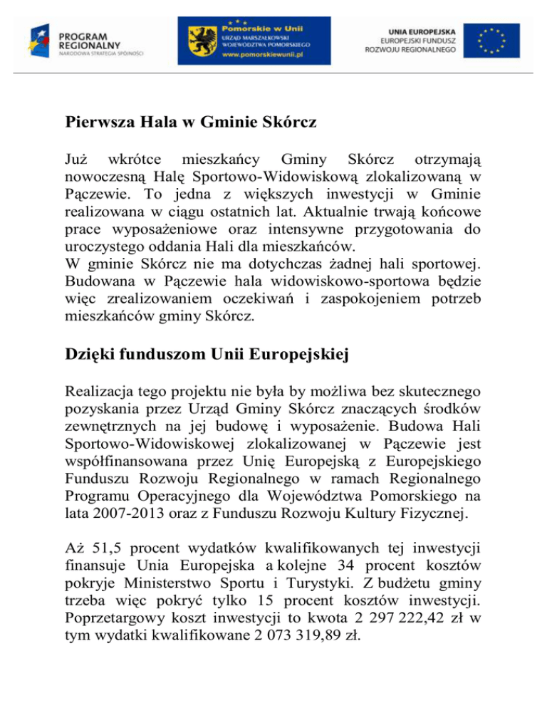 Za Unijne fundusze Pierwsza Hala w Gminie Skórcz Już wkrótce mieszkańcy Gminy Skórcz otrzymają nowoczesną Halę Sportowo-Widowiskową zlokalizowaną w Pączewie. To jedna z większych inwestycji w Gminie realizowana w ciągu ostatnich lat. Aktualnie trwają końcowe prace wyposażeniowe oraz intensywne przygotowania do uroczystego oddania Hali dla mieszkańców. W gminie Skórcz nie ma dotychczas żadnej hali sportowej. Budowana w Pączewie hala widowiskowo-sportowa będzie więc zrealizowaniem oczekiwań i zaspokojeniem potrzeb mieszkańców gminy Skórcz. Dzięki funduszom Unii Europejskiej Realizacja tego projektu nie była by możliwa bez skutecznego pozyskania przez Urząd Gminy Skórcz znaczących środków zewnętrznych na jej budowę i wyposażenie. Budowa Hali Sportowo-Widowiskowej zlokalizowanej w Pączewie jest współfinansowana przez Unię Europejską z Europejskiego Funduszu Rozwoju Regionalnego w ramach Regionalnego Programu Operacyjnego dla Województwa Pomorskiego na lata 2007-2013 oraz z Funduszu Rozwoju Kultury Fizycznej. Aż 51,5 procent wydatków kwalifikowanych tej inwestycji finansuje Unia Europejska a kolejne 34 procent kosztów pokryje Ministerstwo Sportu i Turystyki. Z budżetu gminy trzeba więc pokryć tylko 15 procent kosztów inwestycji. Poprzetargowy koszt inwestycji to kwota 2 297 222,42 zł w tym wydatki kwalifikowane 2 073 319,89 zł. Na miarę marzeń Realizacja tego ważnego zadania przyczyni się do podniesienia poziomu sprawności i kondycji sportowej, poszerzenia oferty aktywnego spędzania wolnego czasu i promocji zdrowego trybu życia. Pozwoli na rozwiązanie problemu niedostatecznej infrastruktury sportowej w Gminie Skórcz, gdyż z wybudowanego obiektu korzystać będą nie tylko uczniowie szkół gminnych, ale także wszyscy mieszkańcy Gminy Skórcz. Stworzone zostaną warunki do organizowania sportowych zajęć pozalekcyjnych. Hala stanowić będzie doskonałe zaplecze sportowe dla Klubu Sportowego „Szpak” oraz innych lokalnych stowarzyszeń. Główna część obiektu to sala widowiskowo-sportowa. która może pełnić rolę jako sala gimnastyczna, scena teatralna, sala wykładowa bądź sala zabaw. We wszystkich tych przypadkach zapewnione jest pełne zaplecze socjalne. Niebagatelne znaczenie ma także fakt, ze obiekt będzie łatwo dostępny dla osób niepełnosprawnych. Najnowocześniejsza technologicznie Zasadniczą część projektowanej hali sportowo-widowiskowej stanowi sala o powierzchni 558,12 m2 połączona z widownią na 130 miejsc siedzących. Przyjęte założenia techniczne to rozwiązania wykorzystujące najnowsze technologie w tej dziedzinie. Cała konstrukcja jest drewniana. Tego typu dźwigary i pokrycie dają korzystny układ akustyczny. Inaczej mówiąc, uderzenia piłką nie wywołują takiego hałasu jak w konstrukcjach zbudowanych ze stali. Dodajmy do tego jeszcze garść innych informacji. Wysokość 8,98 m, powierzchnia zabudowy 735,74 m2, powierzchnia całkowita 960,53 m2, powierzchnia użytkowa 886,44 m2 i kubatura 5779,16 m3. Sala będzie dobrze doświetlona poprzez przeszklenia na bocznej, pochylonej ścianie budynku. Dodatkowo zainstalowano 15 lamp, każda o mocy 400 Wat. Konstrukcja ramowa hali z drewna klejonego (ramy, rygle, płatwie) malowanego bezbarwnie tak, by widoczny był rysunek drewna, jest w sali oraz nad widownią odsłonięta, stanowiąc element wystroju wnętrza. Przed halą wykonany jest parking na 3 autobusy i 15 samochodów osobowych. Hala Sportowo-Widowiskowa połączona jest z budynkiem Zespołu Szkół Publicznych w Pączewie specjalnym, funkcjonalnym łącznikiem i tworzy z tym budynkiem integralną całość. Sas Podpisy pod foto: 1. Tak będzie wyglądała pierwsza w Gminie Skórcz Hala Sportowo-Widowiskowa zlokalizowana w Pączewie. 2. Wójt Gminy Skórcz, Sławomir Czechowski bardzo często wizytował gospodarsko budowę Hali. 3. Tak wyglądała główna hala sportowo-widowiskowa jeszcze w czerwcu bieżącego roku. Już wkrótce w wygodnych fotelikach będzie mogło zasiąść 130 widzów i kulturalnie kibicować lub uczestniczyć w wydarzeniach kulturalnych czy też wykładach. Projekt finansowany w ramach Regionalnego Programu Operacyjnego dla Województwa Pomorskiego na lata 2007 – 2013. DANE TELEADRESOWE BENEFICJENTA GMINA SKÓRCZ ul. Dworcowa 6 83-220 Skór cz e-mail: [email protected]