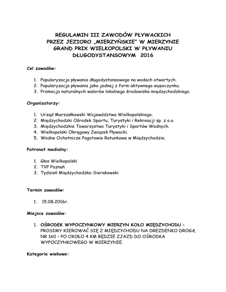 REGULAMIN III ZAWODÓW PŁYWACKICH PRZEZ JEZIORO „MIERZYŃSKIE” W MIERZYNIE GRAND PRIX WIELKOPOLSKI W PŁYWANIU DŁUGODYSTANSOWYM 2016 Cel zawodów: 1. Popularyzacja pływania długodystansowego na wodach otwartych. 2. Popularyzacja pływania jako jednej z form aktywnego wypoczynku. 3. Promocja naturalnych walorów lokalnego środowiska międzychodzkiego. Organizatorzy: 1. 2. 3. 4. 5. Urząd Marszałkowski Województwa Wielkopolskiego. Międzychodzki Ośrodek Sportu, Turystyki i Rekreacji sp. z o.o. Międzychodzkie Towarzystwo Turystyki i Sportów Wodnych. Wielkopolski Okręgowy Związek Pływacki. Wodne Ochotnicze Pogotowie Ratunkowe w Międzychodzie. Patronat medialny: 1. Głos Wielkopolski 2. TVP Poznań 3. Tydzień Międzychodzko-Sierakowski Termin zawodów: 1. 15.08.2016r. Miejsce zawodów: 1. OŚRODEK WYPOCZYNKOWY MIERZYN KOŁO MIĘDZYCHODU – PROSIMY KIEROWAĆ SIĘ Z MIĘDZYCHODU NA DREZDENKO DROGĄ NR 160 – PO OKOŁO 4 KM BĘDZIE ZJAZD DO OŚRODKA WYPOCZYNKOWEGO W MIERZYNIE. Kategorie wiekowe: 1. Dystans główny - zawodnicy urodzeni w roku 2003 i starsi. Dystanse: 1. Trasa główna 3000 m oznaczona wyraźnymi bojami. Meta wszystkich kategorii na wysokości kąpieliska plaży w Mierzynie. Uczestnictwo: 1. W zawodach na dystansie głównym mogą uczestniczyć osoby, które w roku 2016 ukończą 13 lat. Warunkiem uczestnictwa jest dokonanie pisemnego zgłoszenia na kartach przygotowanych przez organizatora. 2. Każdy uczestnik startuje na własną odpowiedzialność. 3. W przypadku zawodników niepełnoletnich obowiązkowa jest pisemna zgoda rodziców (prawnych opiekunów) na udział w zawodach. Przepisy Techniczne: 1. Zawody zostaną przeprowadzone zgodnie z przepisami PZP, dozwolone są tylko stroje tekstylne. 2. Zawodnicy uczestniczący w Grand Prix mają prawo: - pokryć ciało warstwą substancji zabezpieczających przed obniżeniem jego temperatury w wodzie; - użyć okularków wodoszczelnych, klipsów na nos i zatyczek do uszu; - wycofać się z zawodów na własną prośbę. 3. Zawodnicy biorący udział w Grand Prix Wielkopolski nie mogą: - korzystać w czasie wyścigu ze sprzętu ułatwiającego pływanie; - używać pianek; - korzystać z pomocy osób niezwiązanych z wyścigiem w czasie jego trwania. 4. Zawodnicy biorący udział w Grand Prix Wielkopolski zobowiązani są do: - okazania dowodu tożsamości przy rejestracji; podporządkowania się decyzjom komisji sędziowskiej; przestrzegania regulaminu zawodów; wpisania na widocznym miejscu numeru startowego. - podpisania własnoręcznie oświadczenia przygotowanego przez organizatora, w którym stwierdzają swoją zdolność do udziału w zawodach Grand Prix, oraz że startują na własną odpowiedzialność i nie będą wnosić żadnych pretensji do organizatorów w razie ewentualnego uszczerbku na zdrowiu w wyniku startu w zawodach – dotyczy zawodników pełnoletnich; - zawodnicy niepełnoletni zobowiązani są do dostarczenia pisemnej zgody rodziców lub opiekunów prawnych na udział w zawodach oraz oświadczenia jak dla zawodników pełnoletnich, podpisanego przez rodziców lub opiekunów prawnych. Komisja sędziowska: 1. Zawody sędziują, sędziowie wyznaczeni przez Wielkopolskie Kolegium Sędziów. Zgłoszenia: Drogą elektroniczną do dnia 14.08.2016 godz. 12.00 : [email protected] W biurze zawodów 15.08.2016 zgodnie z programem minutowym. Nagrody: 1. Każdy zawodnik, który ukończy wyścig otrzymuje pamiątkowy medal. 2. Dla zwycięzców we wszystkich kategoriach wiekowych (zgodnych z regulaminem Grand Prix Wielkopolski w Pływaniu Długodystansowym 2016) z podziałem na mężczyzn i kobiety medale, dyplomy i statuetki. 3. Przewidziano wyróżnienie dla najstarszego i najmłodszego uczestnika zawodów. Postanowienia końcowe: 1. Wszelkie sprawy sporne rozstrzyga komisja sędziowska. 2. Organizator nie ubezpiecza zawodników od następstw nieszczęśliwych wypadków. 3. Organizator zapewnia opiekę medyczną. 4. Za bezpieczeństwo uczestników odpowiadają ratownicy WOPR. 5. Uczestników wyścigu głównego obowiązuje regulamin ogólny Grand Prix Wielkopolski w Pływaniu Długodystansowym 2016. 6. Ostateczna interpretacja regulaminu i rozstrzyganie kwestii spornych należy do organizatora, oraz Komisji Sędziowskiej w ramach ich uprawnień. Dane kontaktowe organizatora: 1. Międzychodzki Ośrodek Sportu, Turystyki i Rekreacji sp. z o. o. ul. Dworcowa 22 64-400 Międzychód tel. 95 748 15 25 / 95 748 54 71 [email protected] Program minutowy zawodów: 11:00 – 12:45 - zgłoszenia zawodników do wyścigu na dystansie głównym 11:30 – 12:30 – zawody dla dzieci 13:00 - start wyścigu głównego 15:00 – dekoracje we wszystkich kategoriach wiekowych