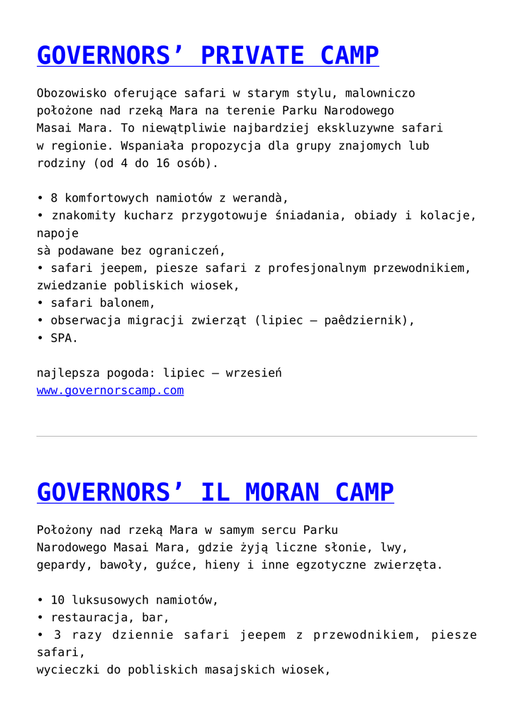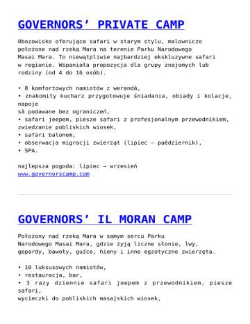 GOVERNORS’ PRIVATE CAMP Obozowisko oferujące safari w starym stylu, malowniczo położone nad rzeką Mara na terenie Parku Narodowego Masai Mara. To niewątpliwie najbardziej ekskluzywne safari w regionie. Wspaniała propozycja dla grupy znajomych lub rodziny (od 4 do 16 osób). • 8 komfortowych namiotów z werandà, • znakomity kucharz przygotowuje śniadania, obiady i kolacje, napoje sà podawane bez ograniczeń, • safari jeepem, piesze safari z profesjonalnym przewodnikiem, zwiedzanie pobliskich wiosek, • safari balonem, • obserwacja migracji zwierząt (lipiec – paêdziernik), • SPA. najlepsza pogoda: lipiec – wrzesień www.governorscamp.com GOVERNORS’ IL MORAN CAMP Położony nad rzeką Mara w samym sercu Parku Narodowego Masai Mara, gdzie żyją liczne słonie, lwy, gepardy, bawoły, guźce, hieny i inne egzotyczne zwierzęta. • 10 luksusowych namiotów, • restauracja, bar, • 3 razy dziennie safari jeepem z przewodnikiem, piesze safari, wycieczki do pobliskich masajskich wiosek, • możliwość lotu balonem, • możliwość lotu małym samolotem nad Jezioro Wiktoria z noclegiem w Mfangano Island Camp, • odlipca do października: możliwość obserwacji wielkiej migracji zwierząt. najlepsza pogoda: lipiec – październik, grudzień – luty www.governorscamp.com COBBLERS COVE Położony na północno-zachodnim wybrzeżu, w poblżu miasteczka Speightstown, gdzie znajduje się przystań jachtowa. Biały piasek, błękitne morze oraz znakomita kuchnia sprawiają, że klienci powracają do tego hotelu wielokrotnie. • • • • 40 eleganckich apartamentów z sypialnią i salonem, renomowana restauracja, bar, basen, korty tenisowe, sala fitness, sporty wodne. najlepsza pogoda: październik – maj www.cobblerscove.com CORAL REEF CLUB Położony na spokojnym zachodnim wybrzeżu, niezwykle elegancki hotel utrzymany w tradycyjnym kreolskim stylu. Renomowana restauracja, przestronne, ze smakiem urządzone pokoje oraz świetna obsługa, gwarantują udany pobyt. • • • • • • 88 pokoi w bungalowach, 2 wille (6-8 osób), restauracja, bar, 2 baseny, korty tenisowe, sporty wodne, sala fitnes, przejażdżki konne, SPA. najlepsza pogoda: październik – maj www.coralreefbarbados.com PETIT ST. VINCENT RESORT Romantyczna, prywatna wysepka otoczona rafą koralową, prawdziwy raj dla osób poszukujàcych spokoju, białych plaży i pięknych widoków. • • • • • 22 luksusowe bungalowy, 2 restauracje, bar, korty tenisowe, joga, masaże, sporty wodne, wycieczki na pobliskie wyspy, łowienie ryb. najlepsza pogoda: grudzień – kwiecień www.psvresort.com MUSTIQUE HOTEL COTTON HOUSE Leży na prywatnej wyspie Mustique. Hotel został zaprojektowany przez znakomitego architekta, który wykorzystał elementy osiemnastowiecznego młyna. • 12 bungalowów, 6 apartamentów, 4 apartamenty i 1 willa z prywatnymi basenami, • 2 restauracje, 4 bary, • basen, • sporty wodne, sala fitness, przejażdżki konne, • wycieczki na pobliskie wyspy. najlepsza pogoda: grudzień – kwiecień www: www.cottonhouse.net CAP EST LAGOON RESOR T & SPA Znakomity hotel położony na wschodnim wybrzeżu wyspy w ogromnym, tropikalnym ogrodzie, przyniedużej prywatnej plaży. Ekskluzywność, luksus, architektura kreolska i znakomity serwis, to główne atuty tego modnego miejsca. Z wysp St. Barthélemy i Martyniki można zorganizować ciekawe wycieczki jednodniowe na Gwadelupę i St. Martin. • • • • 19 przestronnych pokoi, 24 apartamenty z prywatnym, małym basenem, 7 dużych apartamentów z prywatnym basenem, 2 restauracje, 2 bary, • ogromny basen, • sporty wodne, • • • • • • sala fitness, korty tenisowe, SPA/Guerlain, wycieczki na pobliskie wyspy jachtem lub helikopterem, łowienie ryb, pole golfowe 18 dołków. najlepsza pogoda: grudzień – maj www.capest.com HOTEL LE GUANAHANI Położony malowniczo na cyplu na nieskazitelnej, białej plaży, gwarantuje dyskretny luksus, spokój i prywatność. • • • • • • • 50 pokoi z widokiem na morze lub ogród, 10 apartamentów z prywatnym basenem, 1 willa z 3 sypialniami i prywatnym basenem, 3 restauracje (w tym jedna o światowej renomie), 3 bary, 2 baseny, jacuzzi, sporty wodne, sala fitness, SPA/Clarins. najlepsza pogoda: listopad – czerwiec www.leguanahani.com HOTEL ISLE DE FRANCE Położony w Zatoce Flamandów, przy jednej z najpiękniejszych plaż wyspy. Atmosfera relaksu, francuski szyk, znakomita restauracja z widokiem na zatokę oraz cotygodniowy pokaz mody, zapewniają hotelowi stałych klientów. • 33 pokoje o różnym standardzie, niektóre z prywatnym basenem, • restauracja, 2 bary, • basen, jacuzzi, • sala fitness, • SPA. najlepsza pogoda: listopad – czerwiec www.isle-de-france.com HOTEL CASA COLONIAL BEACH & SPA Leży w północnej części wyspy przy Playa Dorada i znakomicie jednoczy nowoczesny komfort z tradycyjną architekturą kolonialną. • 50 pokoi z 1 i 2-ma sypialniami, • restauracja, bar, • basen, joga, pilates, • sporty wodne, • pole golfowe (18 dołków) w pobliżu, • SPA. najlepsza pogoda: listopad – maj www.casacolonialhotel.com