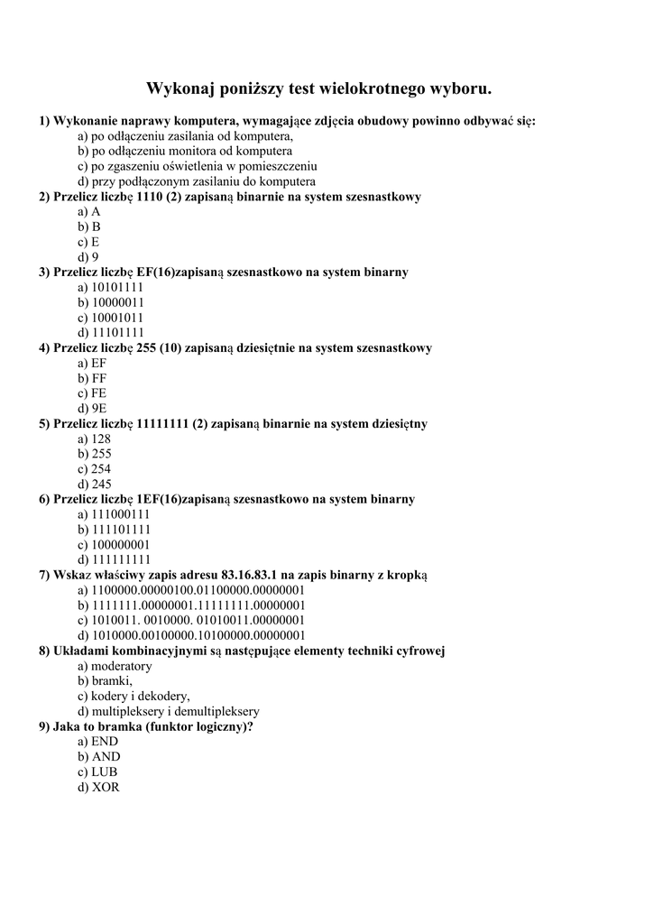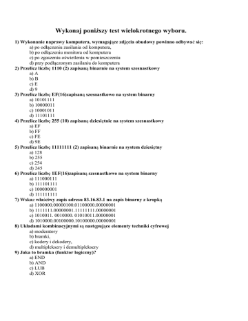 Wykonaj poniższy test wielokrotnego wyboru. 1) Wykonanie naprawy komputera, wymagające zdjęcia obudowy powinno odbywać się: a) po odłączeniu zasilania od komputera, b) po odłączeniu monitora od komputera c) po zgaszeniu oświetlenia w pomieszczeniu d) przy podłączonym zasilaniu do komputera 2) Przelicz liczbę 1110 (2) zapisaną binarnie na system szesnastkowy a) A b) B c) E d) 9 3) Przelicz liczbę EF(16)zapisaną szesnastkowo na system binarny a) 10101111 b) 10000011 c) 10001011 d) 11101111 4) Przelicz liczbę 255 (10) zapisaną dziesiętnie na system szesnastkowy a) EF b) FF c) FE d) 9E 5) Przelicz liczbę 11111111 (2) zapisaną binarnie na system dziesiętny a) 128 b) 255 c) 254 d) 245 6) Przelicz liczbę 1EF(16)zapisaną szesnastkowo na system binarny a) 111000111 b) 111101111 c) 100000001 d) 111111111 7) Wskaz właściwy zapis adresu 83.16.83.1 na zapis binarny z kropką a) 1100000.00000100.01100000.00000001 b) 1111111.00000001.11111111.00000001 c) 1010011. 0010000. 01010011.00000001 d) 1010000.00100000.10100000.00000001 8) Układami kombinacyjnymi są następujące elementy techniki cyfrowej a) moderatory b) bramki, c) kodery i dekodery, d) multipleksery i demultipleksery 9) Jaka to bramka (funktor logiczny)? a) END b) AND c) LUB d) XOR 10)CPU to: a) Central Processing Unit b) Central Placed Uniwersal c) Centralny Poziom Ustawień d) Angielska nazwa mikroprocesora 11)Rodzaje pamięci RAM a) synfazowe b) dynamiczne c) statyczne d) soketowe 12)Obudowa komputera typu Desktop to: a) obudowa pionowa b) obudowa pozioma c) obudowa mieszana d) obudowa do wieszania 13) Liczba 10(10) ma wartość szesnastkowo: a) A b) B c) C d) D 14) Liczba 10001(2) to szesnastkowo: a) 11 b) 12 c) 13 d) 14 15) Pamięć ROM po wyłączeniu zasilania a) traci zapisane w pamięci dane b) przechowuje dalej dane c) nie ma znaczenia czy napięcie istnieje d) traci na zawsze wszystkie dane 16) EPROM to: a) pamięć stała nie dająca się zmienić b) pamięć programowana prądem wielokrotnie (kilkadziesiąt razy) - kasowana promieniami ultrafioletowymi, c) nie ma czegoś takiego d) Emulowana pamięć systemu operacyjnego 17) FEPROM to: a) pamięć stała nie dająca się zmienić b) pamięć zapisywana i kasowana prądem bez ograniczeń - wykonana z elementów ferroelektrycznych. c) pamięć nie zapisywalna przechowująca BIOS d) pamięć stosowana w systemie linux – nowy rodzaj w tym systemie 18) PROM to: a) pamięć programowana prądem jednorazowo b) pamięć nigdy nie zmieniana c) pamięć stosowana do kalkulatorów d) pamięć zmienna okresowo 19)Dla jakich wartości bramki OR (LUB) przyjmie na wyjściu Y wartość prawdy (1) ABY a00 b01 c10 d11 20) Taśma kontrolera EIDE do łączenia dysków HDD i CDROM-ów może mieć: a) 40-pinów b) 120-pinów c) 80-pinów d) 34-pinów 21) Taśma kontrolera SCSI do łączenia dysków HDD może mieć: a) 80-pinów b) 40-pinów c) 50-pinów d) 68-pinów 22) BIOS to: a) rodzaj pamięci Używanej na płycie głównej b) podstawowy program, który uruchamia się na płycie głównej po włączeniu napięcia c) podstawowy program uruchamiany z dysku twardego d) podstawowy zestaw naprawczy systemu operacyjnego 23) Zasilacz jednostki spełnia następujące funkcje: a) przetwarza prąd zmienny 230V na niskie napięcia +5V,-5V b) przetwarza prąd zmienny na niskie napięcie +12V, -12V c) zapewnia ciągły dopływ energii elektrycznej nawet gdy brak go w sieci d) spełnia funkcję porządkującą w systemie operacyjnym 24)Gniazdo procesorów SLOT to: a) Używane do procesora PENTIUM IV b) to gniazdo w którym procesor montowany jest w postaci karty rozszerzającej. c) Używane do procesora PENTIUM II d) Używane do procesora AMD ATHLON 64 25)COM1 i COM2 to: a) porty równoległe b) porty szeregowe c) porty mieszane d) porty twardych dysków 26) PS/2 to: a) port równoległy b) port szeregowy c) port mieszany d) port twardych dysków 27) Port USB1 i USB2 to: a) jest standardem zewnętrznej magistrali szeregowej b) korzystając z interfejsu USB do jednego komputera możemy podłączyć do 127 urządzeń, takich jak drukarki, skanery, monitory, klawiatury, manipulatory do gier, kamery internetowe c) Maksymalna długość kabla pomiędzy dwoma urządzeniami pracującymi z pełną szybkością 12 Mb/s lub pomiędzy urządzeniem a koncentratorem nie może przekraczać pięciu metrów przy Użyciu ekranowanej skrętki o oznaczeniu 20 d) Maksymalna długość kabla pomiędzy dwoma urządzeniami pracującymi z pełną szybkością 12 Mb/s lub pomiędzy urządzeniem a koncentratorem nie może przekraczać dziesięciu metrów przy Użyciu ekranowanej skrętki o oznaczeniu 20 28) Interfejs IEEE 1394 to: a) inaczej nazywany FireWire b) Do pojedynczego kontrolera IEEE 1394 można podłączyć do 63 urządzeń połączonych w łańcuch c) podobnie jak USB umożliwia podłączanie urządzeń w trakcie pracy systemu, bez potrzeby restartu d) stosuje przewód 6 Żyłowy 29)Magistrala PCI a) ang.Peripheral Component Interconnect b) umożliwia 32-bitową transmisję danych c) ang.Post Communicator International d) może przesyłać dane z prędkością do 132 MB/s 30)Dla jakich wartości bramka AND ( I ) przyjmie na wyjściu Y wartość prawdy (1) ABY a00 b01 c10 d11 31)Najbardziej znani producenci BIOS-u a) AWARD b) AMI c) MICROTIK d) SUSE 32)Czy za pomocą BIOS-u można: a) ustawiać parametry procesora b) zarządzać kontrolą antywirusową c) ustawiać parametry zaawansowanego zarządzania energią d) rozpoznawać i ustawiać parametry dysków twardych 33)Kontroler FDD jest połączony za pomocą taśmy: a) 32-pinowej b) 34-pinowej c) 80-pinowej d) 40-pinowej 34)Gniazdo magistrali ISA to: a) ang. Industry Standard Architecture b) jest 8-bitowym starego typu gniazdem c) stosowane są w najnowszych płytach głównych produkowanych w 2007 roku d) umieszczane w nich są procesory Celeron 35)ALU to: a) Blok arytmetyczno-logiczny ALU (ang. arithmetic-logical unit) jest często nazywany uk