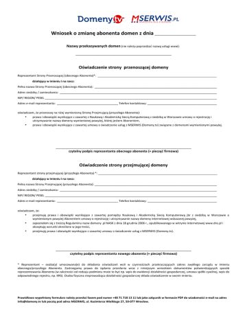 Wniosek o zmianę abonenta domen z dnia _________________________ Nazwy przekazywanych domen (nie należy poprzedzać nazwą usługi www): __________________________________________________________ Oświadczenie strony przenoszącej domeny Reprezentant Strony Przenoszącej (obecnego Abonenta)*: ________________________________________________________________________ działający w imieniu i na rzecz: Pełna nazwa Strony Przenoszącej (obecnego Abonenta): __________________________________________________________________________ Adres siedziby / zamieszkania: _______________________________________________________________________________________________ NIP/ REGON/ PESEL ________________________________________________________________________________________________________ Adres e-mail reprezentanta: _____________________________________ Telefon kontaktowy: __________________________________________ oświadczam, że przenoszę na niżej wymienioną Stronę Przejmującą (przyszłego Abonenta): • prawa i obowiązki wynikające z zawartej z Naukową i Akademicką Siecią Komputerową z siedzibą w Warszawie umowy o rejestrację i utrzymywanie nazwy domeny wymienionej powyżej, której jestem Abonentem, • prawa i obowiązki wynikające z zawartej umowy o świadczenie usług z MSERWIS (Domeny.tv) związane z domenami wymienionymi powyżej. __________________________________________________________________________________ czytelny podpis reprezentanta obecnego abonenta (+ pieczęć firmowa) Oświadczenie strony przejmującej domeny Reprezentant strony przejmującej (przyszłego Abonenta) *: ________________________________________________________________________ działający w imieniu i na rzecz: Pełna nazwa Strony Przejmującej (przyszłego Abonenta): __________________________________________________________________________ Adres siedziby / zamieszkania: _______________________________________________________________________________________________ NIP/ REGON/ PESEL ________________________________________________________________________________________________________ Adres e-mail reprezentanta: _____________________________________ Telefon kontaktowy: __________________________________________ oświadczam, że: • przejmuję prawa i obowiązki wynikające z zawartej pomiędzy Naukową i Akademicką Siecią Komputerową jbr z siedzibą w Warszawie a wymienionym powyżej Abonentem umowy o rejestrację i utrzymywanie nazwy domeny internetowej wskazanej powyżej, • zapoznałem się z treścią Regulaminu nazw domeny .pl NASK z dnia 18 grudnia 2006 r., opublikowanego w witrynie internetowej www.dns.pl i akceptuję warunki określone w jego treści, • przejmuję prawa i obowiązki wynikające z zawartej umowy o świadczenie usług z MSERWIS (Domeny.tv). __________________________________________________________________________________ czytelny podpis reprezentanta nowego abonenta (+ pieczęć firmowa) * Reprezentant – osoba(y) umocowana(e) do składania oświadczeń woli w czynnościach przekraczających zakres zwykłego zarządu w imieniu obecnego/przyszłego Abonenta. Zastrzegamy prawo do żądania przesłania wraz z niniejszym wnioskiem dokumentów potwierdzających sposób reprezentowania Abonenta (w zależności od rodzaju podmiotu może to być np. wpis do ewidencji działalności gospodarczej, umowa spółki cywilnej, wpis do odpowiedniego rejestru, np. KRS). Osoba fizyczna nieprowadząca działalności gospodarczej składa oświadczenie w swoim imieniu. Prawidłowo wypełniony formularz należy przesłać faxem pod numer +48 71 718 13 11 lub jako załącznik w formacie PDF do wiadomości e-mail na adres [email protected] lub pocztą pod adres MSERWIS, ul. Kazimierza Wielkiego 27, 50-077 Wrocław.