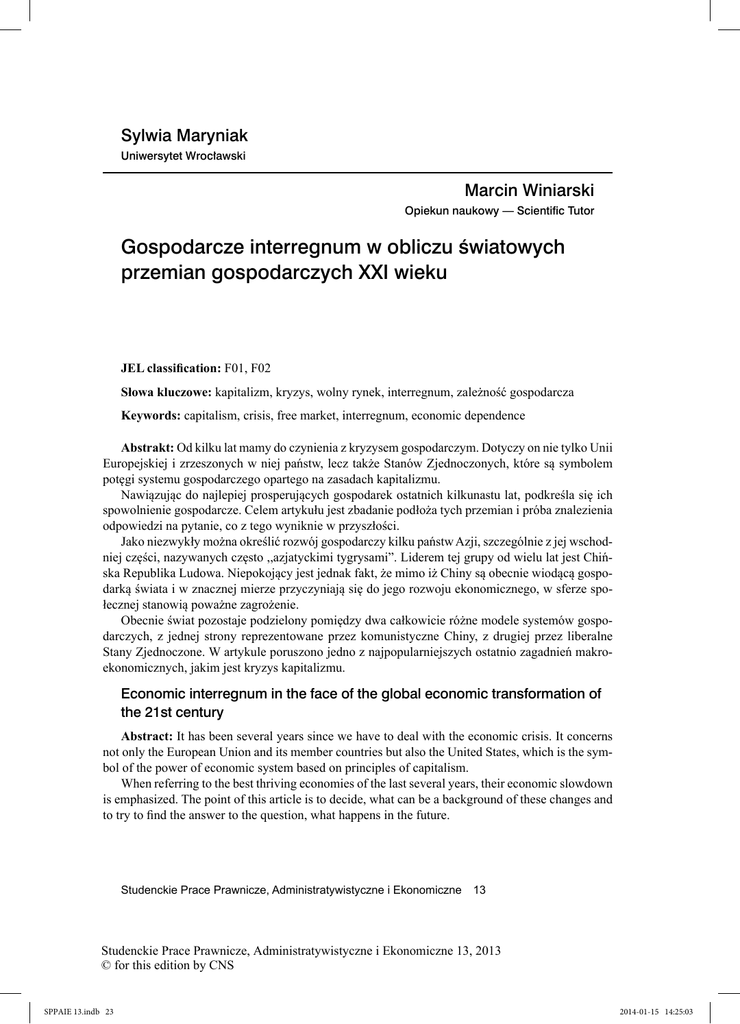 Sylwia Maryniak Uniwersytet Wrocławski Marcin Winiarski Opiekun naukowy — Scientific Tutor Gospodarcze interregnum w obliczu światowych przemian gospodarczych XXI wieku JEL classification: F01, F02 Słowa kluczowe: kapitalizm, kryzys, wolny rynek, interregnum, zależność gospodarcza Keywords: capitalism, crisis, free market, interregnum, economic dependence Abstrakt: Od kilku lat mamy do czynienia z kryzysem gospodarczym. Dotyczy on nie tylko Unii Europejskiej i zrzeszonych w niej państw, lecz także Stanów Zjednoczonych, które są symbolem potęgi systemu gospodarczego opartego na zasadach kapitalizmu. Nawiązując do najlepiej prosperujących gospodarek ostatnich kilkunastu lat, podkreśla się ich spowolnienie gospodarcze. Celem artykułu jest zbadanie podłoża tych przemian i próba znalezienia odpowiedzi na pytanie, co z tego wyniknie w przyszłości. Jako niezwykły można określić rozwój gospodarczy kilku państw Azji, szczególnie z jej wschodniej części, nazywanych często ,,azjatyckimi tygrysami”. Liderem tej grupy od wielu lat jest Chińska Republika Ludowa. Niepokojący jest jednak fakt, że mimo iż Chiny są obecnie wiodącą gospodarką świata i w znacznej mierze przyczyniają się do jego rozwoju ekonomicznego, w sferze społecznej stanowią poważne zagrożenie. Obecnie świat pozostaje podzielony pomiędzy dwa całkowicie różne modele systemów gospodarczych, z jednej strony reprezentowane przez komunistyczne Chiny, z drugiej przez liberalne Stany Zjednoczone. W artykule poruszono jedno z najpopularniejszych ostatnio zagadnień makroekonomicznych, jakim jest kryzys kapitalizmu. Economic interregnum in the face of the global economic transformation of the 21st century Abstract: It has been several years since we have to deal with the economic crisis. It concerns not only the European Union and its member countries but also the United States, which is the symbol of the power of economic system based on principles of capitalism. When referring to the best thriving economies of the last several years, their economic slowdown is emphasized. The point of this article is to decide, what can be a background of these changes and to try to find the answer to the question, what happens in the future. Studenckie Prace Prawnicze, Administratywistyczne i Ekonomiczne 13 Studenckie Prace Prawnicze, Administratywistyczne i Ekonomiczne 13, 2013 © for this edition by CNS SPPAIE 13.indb 23 2014-01-15 14:25:03 24 | SYLWIA MARYNIAK The economic development of several Asian countries, especially those from East Asia, which are frequently called the Asian Tigers, can be considered as unusual. The People’s Republic of China has been the leader of this group for many years. What is distressing, though, is the fact that despite being the leading world economy and contributing considerably to the world’s economic growth, China poses a threat in the social sphere. Currently, the world is still divided into two polar models of economic systems — on the one side represented by communist China and on the other by the liberal United States. The article concerns one of the recently most popular macroeconomic issues, which is the crisis of capitalism. Wprowadzenie Artykuł stanowi analizę jednego z najpopularniejszych ostatnio zagadnień ekonomicznych, jakim jest kryzys gospodarczy. W chwili obecnej mamy do czynienia z kilkoma wiodącymi gospodarkami na arenie międzynarodowej. Nie można jasno i definitywnie określić, że istnieje jeden lider gospodarczy. Na miano to niewątpliwie zasługują zarówno Stany Zjednoczone, jak i Chińska Republika Ludowa. Oba państwa reprezentują całkowicie odmienny model prowadzenia polityki. Istotne znaczenie dla omawianego zagadnienia mają również ruchy migracyjne oraz narastające niepokoje społeczne w wielu krajach świata. Liczne narody europejskie borykają się z procesem wymierania. Ustanowienie stałej tendencji tych zmian jest wręcz niemożliwe, a ich następstwa są trudne do sprecyzowania. W artykule zaprezentowano próbę wskazania głównych prowokatorów tych zmian oraz czyniona jest aluzja do prognozy ich przyszłości. Czy obecne załamanie gospodarcze jest wynikiem normalnego cyklu koniunkturalnego wpisanego w istotę kapitalizmu? Coraz częściej można zaobserwować wyraźne oznaki kresu świetności wolnego rynku. Od kilku lat o kryzysie wiodących systemów gospodarczych świata mówi wielu naukowców, m.in. Immanuel Wallerstein oraz laureat Nagrody Nobla w dziedzinie ekonomii Jospeh E. Stiglitz. Socjalistyczna gospodarka ZSRR nie przetrwała jednego wieku, a Stany Zjednoczone jako najlepiej prosperująca gospodarka oparta na kapitalizmie powoli ustępują z tronu gospodarczego lidera. Czas jednak nie potrafi wyłonić godnego następcy. Immanuel Wallerstein już kilka lat temu opisał ukazujące się oznaki nowego systemu gospodarczego. Gospodarka socjalistyczna nie przetrwała czasu, gospodarka kapitalistyczna od kilku lat również nie radzi sobie z kryzysem. Nasuwa się więc pytanie, czy istnieje jakaś alternatywa dla tych systemów? A jeśli tak, to czy będzie ona w stanie utrzymać wzrost gospodarczy przy zachowaniu praw człowieka i uszanowaniu środowiska naturalnego? Problematyczna wydaje się próba określenia momentu ewolucji, w którym dzisiaj znajduje się świat. Obecne załamanie może być różnie interpretowane. Z jednej strony trwający kryzys gospodarczy może być tylko chwilową niedyspozycyjnością, z drugiej jednak może być również przełomem pomiędzy starym a nowym systemem, którego poszlaki widać już w interwencjonizmie krajów liberalnych i reformach quasi-wolnorynkowych w gospodarkach socjalistycznych. Wydawać by się mogło, Studenckie Prace Prawnicze, Administratywistyczne i Ekonomiczne 13, 2013 © for this edition by CNS SPPAIE 13.indb 24 2014-01-15 14:25:03 GOSPODARCZE INTERREGNUM W OBLICZU ŚWIATOWYCH PRZEMIAN GOSPODARCZYCH | 25 że światowe potęgi gospodarcze, tak