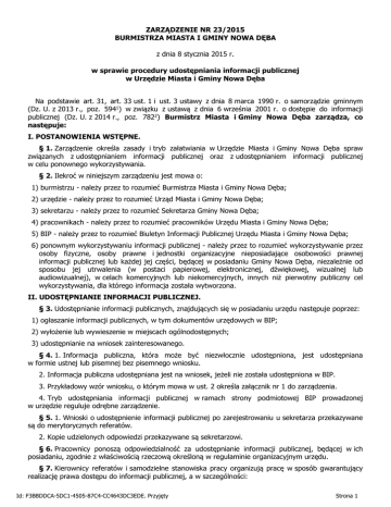 ZARZĄDZENIE NR 23/2015 BURMISTRZA MIASTA I GMINY NOWA DĘBA z dnia 8 stycznia 2015 r. w sprawie procedury udostępniania informacji publicznej w Urzędzie Miasta i Gminy Nowa Dęba Na podstawie art. 31, art. 33 ust. 1 i ust. 3 ustawy z dnia 8 marca 1990 r. o samorządzie gminnym (Dz. U. z 2013 r., poz. 5941) w związku z ustawą z dnia 6 września 2001 r. o dostępie do informacji publicznej (Dz. U. z 2014 r., poz. 7822) Burmistrz Miasta i Gminy Nowa Dęba zarządza, co następuje: I. POSTANOWIENIA WSTĘPNE. § 1. Zarządzenie określa zasady i tryb załatwiania w Urzędzie Miasta i Gminy Nowa Dęba spraw związanych z udostępnianiem informacji publicznej oraz z udostępnianiem informacji publicznej w celu ponownego wykorzystywania. § 2. Ilekroć w niniejszym zarządzeniu jest mowa o: 1) burmistrzu - należy przez to rozumieć Burmistrza Miasta i Gminy Nowa Dęba; 2) urzędzie - należy przez to rozumieć Urząd Miasta i Gminy Nowa Dęba; 3) sekretarzu - należy przez to rozumieć Sekretarza Gminy Nowa Dęba; 4) pracownikach - należy przez to rozumieć pracowników Urzędu Miasta i Gminy Nowa Dęba; 5) BIP - należy przez to rozumieć Biuletyn Informacji Publicznej Urzędu Miasta i Gminy Nowa Dęba; 6) ponownym wykorzystywaniu informacji publicznej - należy przez to rozumieć wykorzystywanie przez osoby fizyczne, osoby prawne i jednostki organizacyjne nieposiadające osobowości prawnej informacji publicznej lub każdej jej części, będącej w posiadaniu Gminy Nowa Dęba, niezależnie od sposobu jej utrwalenia (w postaci papierowej, elektronicznej, dźwiękowej, wizualnej lub audiowizualnej), w celach komercyjnych lub niekomercyjnych, innych niż pierwotny publiczny cel wykorzystywania, dla którego informacja została wytworzona. II. UDOSTĘPNIANIE INFORMACJI PUBLICZNEJ. § 3. Udostępnianie informacji publicznych, znajdujących się w posiadaniu urzędu następuje poprzez: 1) ogłaszanie informacji publicznych, w tym dokumentów urzędowych w BIP; 2) wyłożenie lub wywieszenie w miejscach ogólnodostępnych; 3) udostępnianie na wniosek zainteresowanego. § 4. 1. Informacja publiczna, która może być niezwłocznie udostępniona, jest udostępniana w formie ustnej lub pisemnej bez pisemnego wniosku. 2. Informacja publiczna udostępniana jest na wniosek, jeżeli nie została udostępniona w BIP. 3. Przykładowy wzór wniosku, o którym mowa w ust. 2 określa załącznik nr 1 do zarządzenia. 4. Tryb udostępniania informacji publicznej w ramach strony podmiotowej BIP prowadzonej w urzędzie reguluje odrębne zarządzenie. § 5. 1. Wnioski o udostępnienie informacji publicznej po zarejestrowaniu u sekretarza przekazywane są do merytorycznych referatów. 2. Kopie udzielonych odpowiedzi przekazywane są sekretarzowi. § 6. Pracownicy ponoszą odpowiedzialność za udostępnianie informacji publicznej, będącej w ich posiadaniu, zgodnie z właściwością rzeczową określoną w regulaminie organizacyjnym urzędu. § 7. Kierownicy referatów i samodzielne stanowiska pracy organizują pracę w sposób gwarantujący realizację prawa dostępu do informacji publicznej, a w szczególności: Id: F3BBDDCA-5DC1-4505-87C4-CC4643DC3EDE. Przyjęty Strona 1 1) dokonują kwalifikacji informacji publicznej i określają sposób jej udostępnienia, a w przypadkach, o których mowa w § 3 ust. 2 wyznaczają miejsce i termin wyłożenia lub wywieszenia informacji publicznej; 2) zapewniają wgląd do dokumentów urzędowych, w tym sporządzania w obecności pracownika urzędu odpisów i notatek. § 8. Pracownicy oceniają, czy urząd jest w posiadaniu określonej we wniosku informacji publicznej. W przypadku nieposiadania przez urząd tej informacji, powiadamia się wnioskodawcę o braku możliwości jej udostępnienia. § 9. Jeżeli udostępnienie informacji publicznej wymaga współdziałania kilku referatów urzędu, sekretarz wyznacza referat wiodący, który jest odpowiedzialny za opracowanie odpowiedzi na złożony wniosek. § 10. Jeżeli przedmiotem wniosku jest udostępnienie informacji publicznej zawartej w aktach przechowywanych w archiwum zakładowym urzędu, niezbędną dokumentację należy wypożyczyć w celu udostępnienia jej zainteresowanemu, bądź też udostępnić ją bezpośrednio w lokalu archiwum zakładowego urzędu na zasadach określonych w przepisach prawa. § 11. Kierownicy referatów i samodzielne stanowiska pracy zobowiązani są do: 1) zapewnienia prawidłowej organizacji udostępniania informacji publicznej oraz terminowości załatwiania wniosków o udostępnienie informacji publicznej w ramach właściwości rzeczowej; 2) przedkładania na wniosek burmistrza lub sekretarza sprawozdań i informacji na temat realizacji prawa dostępu do informacji publicznej. III. PONOWNE WYKORZYSTYWANIE INFORMACJI PUBLICZNEJ. § 12. 1. Pracownicy udostępniają informację publiczną w celu ponownego wykorzystywania. 2. Udostępnianie w urzędzie poprzez: informacji publicznej w celu ponownego wykorzystywania odbywa się 1) udostępnienie informacji publicznej na stronie podmiotowej BIP; 2) udostępnienie informacji publicznej w sposób inny niż w BIP; 3) przekazanie informacji publicznej na wniosek o ponowne wykorzystywanie informacji publicznej. 2. Wzór wniosku o ponowne wykorzystywanie informacji publicznej określa załącznik nr 2 do zarządzenia (wzór wniosku o ponowne wykorzystywanie informacji publicznej określony jest w rozporządzeniu Ministra Administracji i Cyfryzacji z dnia 17 stycznia 2012 r. w sprawie wzoru wniosku o ponowne wykorzystywanie informacji publicznej - Dz. U. z 2012 r., poz. 94). § 13. 1. Informacja publiczna udostępniana jest na wniosek w celu ponownego wykorzystywania, w przypadkach, gdy: 1) informacja publiczna nie została udostępniona w BIP, chyba że została udostępniona w inny sposób i zostały określone warunki ponownego wykorzystywania; 2) wnioskodawca zamierza wykorzystywać informację publiczną na warunkach innych niż zostały d