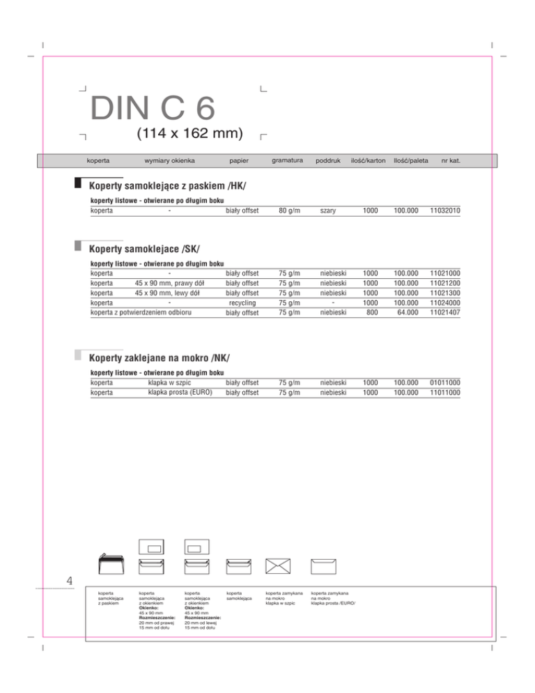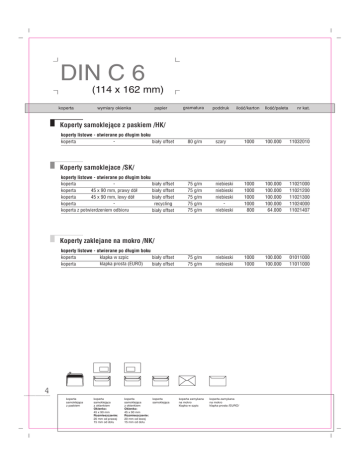 DIN C 6 (114 x 162 mm) koperta papier wymiary okienka gramatura poddruk 80 g/m szary 1000 100.000 11032010 75 g/m 75 g/m 75 g/m 75 g/m 75 g/m niebieski niebieski niebieski niebieski 1000 1000 1000 1000 800 100.000 100.000 100.000 100.000 64.000 11021000 11021200 11021300 11024000 11021407 75 g/m 75 g/m niebieski niebieski 1000 1000 100.000 100.000 01011000 11011000 iloœæ/karton Iloœæ/paleta nr kat. Koperty samoklej¹ce z paskiem /HK/ koperty listowe - otwierane po d³ugim boku koperta bia³y offset Koperty samoklejace /SK/ koperty listowe - otwierane po d³ugim boku koperta bia³y offset 45 x 90 mm, prawy dó³ koperta bia³y offset 45 x 90 mm, lewy dó³ koperta bia³y offset koperta recycling koperta z potwierdzeniem odbioru bia³y offset Koperty zaklejane na mokro /NK/ koperty listowe - otwierane po d³ugim boku klapka w szpic koperta bia³y offset klapka prosta (EURO) koperta bia³y offset 4 koperta samoklej¹ca z paskiem koperta samoklej¹ca z okienkiem Okienko: 45 x 90 mm Rozmieszczenie: 20 mm od prawej 15 mm od do³u koperta samoklej¹ca z okienkiem Okienko: 45 x 90 mm Rozmieszczenie: 20 mm od lewej 15 mm od do³u koperta samoklej¹ca koperta zamykana na mokro klapka w szpic koperta zamykana na mokro klapka prosta /EURO/ DIN DL (110 x 220 mm) koperta papier wymiary okienka gramatura poddruk 80 g/m 80 g/m 80 g/m szary szary szary 1000 1000 1000 84.000 84.000 84.000 11232010 11232210 11232310 75 g/m 75 g/m 75 g/m 75 g/m niebieski niebieski niebieski - 1000 1000 1000 1000 84.000 84.000 84.000 84.000 11221000 11221200 11221300 11224000 75 g/m niebieski 1000 84.000 01211000 iloœæ/karton Iloœæ/paleta nr kat. Koperty samoklej¹ce z paskiem /HK/ koperty listowe - otwierane po d³ugim boku koperta bia³y offset koperta bia³y offset 45 x 90 mm, prawy dó³ koperta bia³y offset 45 x 90 mm, lewy dó³ Koperty samoklej¹ce /SK/ koperty listowe - otwierane po d³ugim boku koperta bia³y offset koperta 45 x 90 mm, prawy dó³ bia³y offset 45 x 90 mm, lewy dó³ koperta bia³y offset koperta recycling Koperty zaklejane na mokro /NK/ koperty listowe - otwierane po d³ugim boku klapka w szpic koperta bia³y offset 5 koperta samoklej¹ca z paskiem koperta samoklej¹ca z paskiem z okienkiem Okienko: 45 x 90 mm Rozmieszczenie: 20 mm od prawej 15 mm od do³u koperta samoklej¹ca z paskiem z okienkiem Okienko: 45 x 90 mm Rozmieszczenie: 20 mm od lewej 15 mm od do³u koperta samoklej¹ca koperta samoklejaca z okienkiem Okienko: 45 x 90 mm Rozmieszczenie: 20 mm od prawej 15 mm od do³u koperta samoklejaca z okienkiem Okienko: 45 x 90 mm Rozmieszczenie: 20 mm od lewej 15 mm od do³u koperta zamykana na mokro klapka w szpic DIN C5 (162 x 229 mm) gramatura poddruk iloœæ/karton koperty listowe - otwierane po d³ugim boku koperta bia³y offset koperta 45 x 90 mm, prawy œrodek bia³y offset 80 g/m 80 g/m szary szary 500 500 48.000 48.000 11432020 11432220 koperty aktowe - otwierane po krótkim boku koperta bia³y offset koperta 45 x 90 mm, lewy/prawy œrodek bia³y offset koperta br¹zowy 90 g/m 90 g/m 90 g/m szary szary - 500 500 500 48.000 48.000 48.000 31432020 31432120 31433020 250 15.000 41433057 koperta papier wymiary okienka nr kat. Iloœæ/paleta Koperty samoklej¹ce z paskiem /HK/ koperty aktowe z rozszerzanymi bokami i spodem RBD, otwierane po krótkim boku 120 g/m koperta 162 x 229 x 32 br¹zowy Koperty samoklej¹ce /SK/ koperty listowe - otwierane d³ugim boku koperta koperta 45 x 90 mm, prawy œrodek bia³y offset bia³y offset 80 g/m 80 g/m niebieski niebieski 500 500 49.000 49.000 11427098 11427198 koperty aktowe - otwierane po krótkim boku koperta bia³y offset koperta 45 x 90 mm, lewy/prawy œrodek bia³y offset koperta br¹zowy 90 g/m 90 g/m 90 g/m niebieski niebieski - 500 500 500 49.000 49.000 49.000 31421020 31421120 31423020 90 g/m 90 g/m - 500 500 48.000 48.000 31410020 31413020 Koperty zaklejane na mokro /NK/ koperty aktowe - otwierane po krótkim boku koperta bia³y offset koperta br¹zowy 6 koperta samoklej¹ca z paskiem koperta samoklej¹ca z paskiem Okienko: 45 x 90 mm Rozmieszczenie: 20 mm od prawej 65 mm od do³u koperta samoklej¹ca z paskiem koperta samoklej¹ca z paskiem Okienko: 45 x 90 mm Rozmieszczenie: 20 mm od lewej 60 mm od do³u koperta samoklej¹ca z paskiem RBD koperta samoklej¹ca koperta samoklej¹ca koperta samoklej¹ca z okienkiem Okienko: 45 x 90 mm Rozmieszczenie: 20 mm od lewej 60 mm od do³u koperta zamykana na mokro DIN B5 (176 x 250 mm) koperta wymiary okienka papier gramatura poddruk iloœæ/karton 90 g/m 90 g/m szary - 500 500 42.000 42.000 31532020 31533020 250 14.000 41533057 nr kat. Iloœæ/paleta Koperty samoklej¹ce z paskiem /HK/ koperty aktowe - otwierane po krótkim boku koperta bia³y offset koperta br¹zowy koperty aktowe z rozszerzanymi bokami i spodem RBD, otwierane po krótkim boku 120 g/m koperta 176 x 250 x 32 br¹zowy Koperty samoklej¹ce /SK/ koperty aktowe - otwierane po krótkim boku koperta bia³y offset koperta br¹zowy 90 g/m 90 g/m niebieski - 500 500 42.000 42.000 31521020 31523020 90 g/m 90 g/m - 500 500 42.000 42.000 31510020 31513020 Koperty zaklejane na mokro /NK/ koperty aktowe - otwierane po krótkim boku koperta bia³y offset koperta br¹zowy 7 koperta samoklej¹ca z paskiem koperta samoklej¹ca z paskiem RBD koperta samoklej¹ca koperta zamykana na mokro DIN C4 (229 x 324 mm) gramatura poddruk iloœæ/karton koperty aktowe - otwierane po d³ugim boku koperta bia³y offset 100 g/m szary 500 15.000 11632037 koperty aktowe - otwierane po krótkim boku koperta bia³y offset 55 x 90 mm, prawa góra koperta bia³y offset 55 x 90 mm, lewa góra koperta bia³y offset koperta br¹zowy koperta bia³y offset 90 g/m 90 g/m 90 g/m 90 g/m 120 g/m szary szary szary szary 250 250 250 250 250 24.000 24.000 24.000 24.000 17.500 31632020 31632220 31632320 31633020 31632057 250 250 7.500 7.500 41630077 41633067 koperta wymiary okienka papier Iloœæ/paleta nr kat. Koperty samoklej¹ce z paskiem /HK/ koperty aktowe z rozszerzanymi b