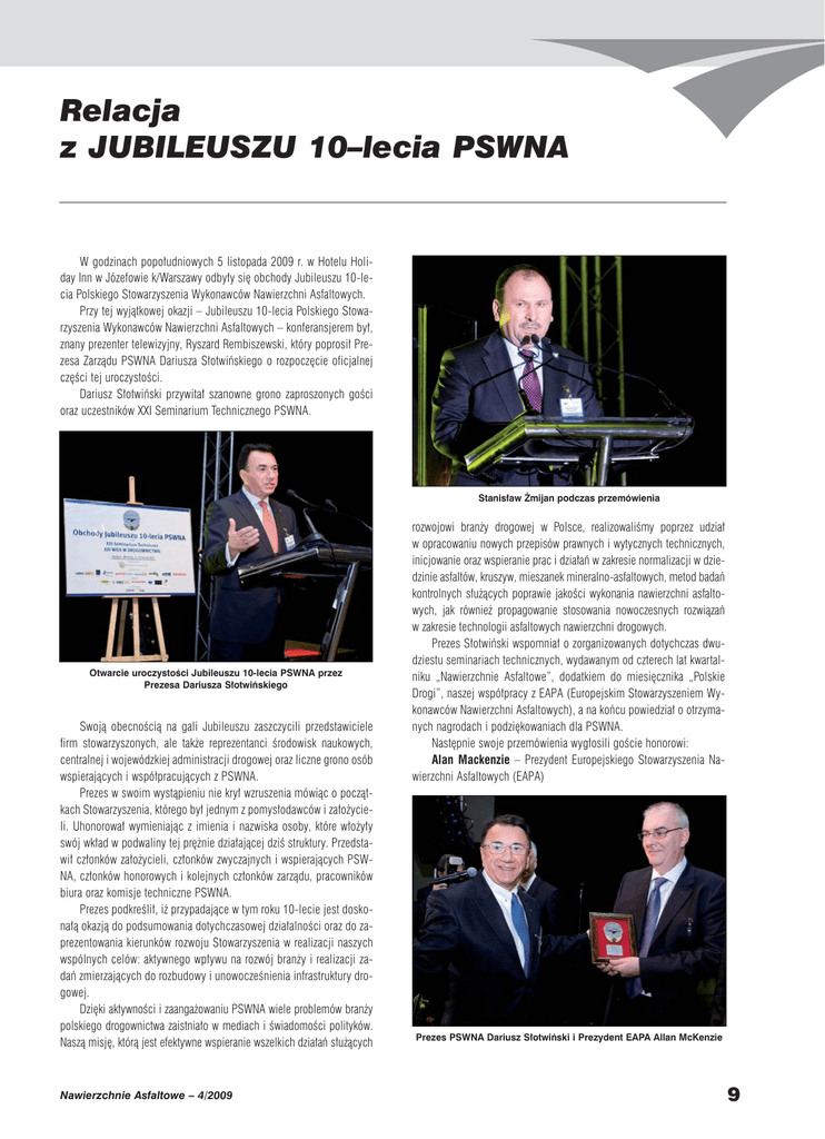 Relacja z JUBILEUSZU 10–lecia PSWNA W godzinach popołudniowych 5 listopada 2009 r. w Hotelu Holiday Inn w Józefowie k/Warszawy odbyły się obchody Jubileuszu 10-lecia Polskiego Stowarzyszenia Wykonawców Nawierzchni Asfaltowych. Przy tej wyjątkowej okazji – Jubileuszu 10-lecia Polskiego Stowarzyszenia Wykonawców Nawierzchni Asfaltowych – konferansjerem był, znany prezenter telewizyjny, Ryszard Rembiszewski, który poprosił Prezesa Zarządu PSWNA Dariusza Słotwińskiego o rozpoczęcie oficjalnej części tej uroczystości. Dariusz Słotwiński przywitał szanowne grono zaproszonych gości oraz uczestników XXI Seminarium Technicznego PSWNA. Stanisław Żmijan podczas przemówienia Otwarcie uroczystości Jubileuszu 10-lecia PSWNA przez Prezesa Dariusza Słotwińskiego Swoją obecnością na gali Jubileuszu zaszczycili przedstawiciele firm stowarzyszonych, ale także reprezentanci środowisk naukowych, centralnej i wojewódzkiej administracji drogowej oraz liczne grono osób wspierających i współpracujących z PSWNA. Prezes w swoim wystąpieniu nie krył wzruszenia mówiąc o początkach Stowarzyszenia, którego był jednym z pomysłodawców i założycieli. Uhonorował wymieniając z imienia i nazwiska osoby, które włożyły swój wkład w podwaliny tej prężnie działającej dziś struktury. Przedstawił członków założycieli, członków zwyczajnych i wspierających PSWNA, członków honorowych i kolejnych członków zarządu, pracowników biura oraz komisje techniczne PSWNA. Prezes podkreślił, iż przypadające w tym roku 10-lecie jest doskonałą okazją do podsumowania dotychczasowej działalności oraz do zaprezentowania kierunków rozwoju Stowarzyszenia w realizacji naszych wspólnych celów: aktywnego wpływu na rozwój branży i realizacji zadań zmierzających do rozbudowy i unowocześnienia infrastruktury drogowej. Dzięki aktywności i zaangażowaniu PSWNA wiele problemów branży polskiego drogownictwa zaistniało w mediach i świadomości polityków. Naszą misję, którą jest efektywne wspieranie wszelkich działań służących Nawierzchnie Asfaltowe – 4/2009 rozwojowi branży drogowej w Polsce, realizowaliśmy poprzez udział w opracowaniu nowych przepisów prawnych i wytycznych technicznych, inicjowanie oraz wspieranie prac i działań w zakresie normalizacji w dziedzinie asfaltów, kruszyw, mieszanek mineralno-asfaltowych, metod badań kontrolnych służących poprawie jakości wykonania nawierzchni asfaltowych, jak również propagowanie stosowania nowoczesnych rozwiązań w zakresie technologii asfaltowych nawierzchni drogowych. Prezes Słotwiński wspomniał o zorganizowanych dotychczas dwudziestu seminariach technicznych, wydawanym od czterech lat kwartalniku „Nawierzchnie Asfaltowe”, dodatkiem do miesięcznika „Polskie Drogi”, naszej współpracy z EAPA (Europejskim Stowarzyszeniem Wykonawców Nawierzchni Asfaltowych), a na końcu powiedział o otrzymanych nagrodach i podziękowaniach dla PSWNA. Następnie swoje przemówienia wygłosili goście honorowi: Alan Mackenzie – Prezydent Europejskiego Stowarzyszenia Nawierzchni Asfaltowych (EAPA) Prezes PSWNA Dariusz Słotwiński i Prezydent EAPA Allan McKenzie 9 Stanisław Żmijan – Poseł na Sejm RP (Przewodniczący Komisji Infrastruktury) Radosław Stępień – Podsekretarz Stanu Ministerstwa Infrastruktury Zbigniew Kotlarek – Prezes Polskiego Kongresu Drogowego (PKD) Krystyna Łazarz – Prezydent Ogólnopolskiej Izby Gospodarczej Drogownictwa (OIGD) Leszek Rafalski – Dyrektor Instytutu Badawczego Dróg i Mostów (IBDiM) Antoni Szydło – Prezes Stowarzyszenia Inżynierów i Techników Komunikacji RP Podczas gali Jubileuszu wyróżniono osoby zasłużone dla PSWNA. Poseł Stanisław Żmijan wraz z dyrektorem Tomaszem Rudnickim z GDDKiA wręczyli odznaczenia resortowe „Zasłużony dla Drogownictwa”. Wręczenie odznaki Członka Honorowego Dariuszowi Sybilskiemu Odznaczeni zostali: Lech Biały Erwin Filipczyk Konrad Jabłoński Paweł Ludwig Aldona Mizgalska Piotr Motyka Tadeusz Owsiak Witold Szrajber Jerzy Wójcik Andrzej Wyszyński Następnie medalami okolicznościowymi PSWNA wyróżniono następujące osoby: Alan Mackenzie – Prezydent EAPA Cezary Grabarczyk – Minister Infrastruktury RP Stanisław Żmijan – Poseł na Sejm RP Lech Witecki – Dyrektor Generalny GDDKiA Kazimierz Furtak – Prezes Związku Mostowców RP Józef Judycki – Politechnika Gdańska Zbigniew Kotlarek – Prezes PKD Krystyna Łazarz – Prezydent OIGD Marek Michałowski – Prezes PZPB (Polskiego Związku Pracodawców Budownictwa) Jerzy Piłat – Politechnika Warszawska Piotr Radziszewski – Politechnika Warszawska Leszek Rafalski – Dyrektor IBDiM Uhoronowani odnaczeniem „Zasłużony dla Drogownictwa” Krótkie podziękowania w imieniu odznaczonych wygłosiła Aldona Mizgalska. Kolejnym uroczystym momentem gali Jubileuszu było nadanie statusu członka honorowego PSWNA oraz wręczenie odznaki prof. Dariuszowi Sybilskiemu, za zasługi na rzecz Stowarzyszenia. Uchwała o nadaniu Dariuszowi Sybilskiemu statusu członka honorowego PSWNA została podjęta na Nadzwyczajnym Walnym Zebraniu Członków PSWNA w dniu 4 listopada 2009 r. Dariusz Sybilski jest dopiero trzecim, po Konradzie Jabłońskim oraz nieżyjącym już Bohdanie Żurku, członkiem honorowym w 10-letniej historii PSWNA. 10 Wyróżnieni medalami okolicznościowymi z okazji Jubileuszu PSWNA Antoni Szydło – Prezes SITK RP Wręczeń medali okolicznościowych i dyplomów dokonali Dariusz Słotwiński i Jerzy Wójcik. Kolejnym punktem programu gali było wręczenie medali okolicznościowych i dyplomów członkom honorowym PSWNA Konradowi Jabłońskiemu oraz Dariuszowi Sybilskiemu przez Dariusza Słotwińskiego oraz Adama Wojczuka. Nawierzchnie Asfaltowe – 4/2009 Wręczeń medali okolicznościowych i dyplomów – członkom zwyczajnym PSWNA dokonali Dariusz Słotwiński oraz Andrzej Wyszyński. Otrzymali je: 1. Biały Lech 2. Buk