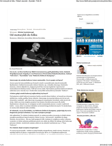 Od motocykli do folku • Robert Jaworski - Żywiołak • Folk 24 1z5 http://www.folk24.pl/wywiady/od-motocykli-do-folku/ Zapisz się na cotygodniowy newsletter folkowy Email: REKLAMA Jesteś tutaj: Strona główna Wywiady Od motocykli do folku WYWIADY Michał Amielańczyk Od motocykli do folku Rozmowa z Robertem Jaworskim, liderem Żywiołaka 9 czerwca 2012 Michał Amielańczyk Zobacz moje artykuły Fot. Kamil Piotrowski Gra m.in. na lirze korbowej, fideli renesansowej, gęśli gdańskiej, lutni, dudach. Współpracował z Kapelą ze wsi Warszawa i Percivalem Schuttenbachem. Założył "Ich troLe", "Żywiołaka" oraz "Roberto Delira & Kompany". Interesuje cię sztuka ludowa i stare motocykle. Czy te pasje coś łączy? Jeszcze parę lat temu jeździłem po licznych wsiach w poszukiwaniu starych motocykli. Spotkaniom z ludźmi towarzyszyły ciekawe historie, np. o dziadku obecnego właściciela maszyny, ostrym odjazdowcu, mającym przed laty zwyczaj regularnie wparowywać motocyklem do lokalnej remizy. Folk był zawsze obok. Opowiadane językiem ludowym historie nabierały życia i stawały się w środowisku naszej kliki motocyklowej niemalże "kultowe". Student dziennikarstwa oraz bezpieczeństwa wewnętrznego na Uniwersytecie Warszawskim, od kilku lat pisze dla magazynu "CD-Action". W słuchawkach zawsze gra mu rock i metal - w odmianach folk-, post- i kilkunastu innych. Moja akustyczna muzyka A która gałąź sztuki ludowej najbardziej cię kręci? Pod pojęciem sztuki ludowej rozumiem bardzo szeroki obszar kultury: od muzyki po elementy stylistyczne, rzeźbę, grafikę, formy ubiorów. Interesując się muzyką ludową nie da się tych elementów rozdzielić - gdy obserwuje się grających muzykantów łowickich, widzi się też ich stroje. Jakiś czas temu mogłem przyjrzeć się strojom charakterystycznym dla okolic Sandomierza i okazało się, że występuje na nich ornamentyka jeszcze z czasów wędrówek ludów - wzory, które wcześniej widziałem na kartach ksiąg średniowiecznych. To niesłychane, że można dziś odnaleźć takie artefakty. W tekstach, czy to Żywiołaka, czy Roberto Delira & Kompany, pojawiają się m.in. fragmenty poezji Leśmiana. Czy sam czytujesz poezję? Jak najbardziej. To właśnie Leśmian sprawił, że zainteresowałem się poezją, to dzięki niemu zacząłem poszukiwać innych autorów, którzy tworzą - lub tworzyli - podobnie do niego. Niestety, nie jest łatwo - dla nas, ludzi grających folk, Leśmian to wyjątkowa osoba i odnoszę wrażenie, że chyba żadnemu polskiemu poecie nie udało się zbliżyć do takiego stylu ludowego jak jemu właśnie. Aczkolwiek ostatnio udało mi się odnaleźć natchnienie np. w "Panu Tadeuszu". Irlandzki pieśniarz i songwriter. Od lat występuje na całym świecie, zbierając pozytywne recenzje ze strony mediów i publiczności. Bardzo lubi Polskę i często tu bywa. Tym razem przyjeżdża do nas, aby zagrać w Warszawie i Lublinie! Muzyka jest dobra, albo nie No właśnie skąd czerpiesz inspiracje? To zazwyczaj przypadki - trafiam na jakąś książkę etnograficzną, tomik wierszy, fraszek czy melodię ludową na płycie z nagraniami terenowymi. Bywa, że w książkach naukowych odnajduję fragmenty tekstu odwołujące się do folkloru, np. przedchrześcijańskiego, którego wiele elementów do dzisiaj w folklorze istnieje i funkcjonuje. Maczał palce w punkrocku i w sztuce współczesnej. Grafik, artysta, projektant, producent, muzyk. Zaczynał od konkretnego nurtu, dziś nie uznaje definicji w muzyce. 2013-04-02 12:58 Od motocykli do folku • Robert Jaworski - Żywiołak • Folk 24 2z5 Folklor to dziś dla wielu archaizm i cepeliada. http://www.folk24.pl/wywiady/od-motocykli-do-folku/ terenNowy.kids. Rzeczywiście, folklor jest dla współczesnych ludzi z miasta czymś nieciekawym i niezrozumiałym. Tradycyjna muzyka skrzypcowa stała się dla nich mało ciekawa w dzisiejszych oryginalnych, wiejskich wykonaniach. Ja odgrywając te tematy pozbawiam je "niepotrzebnych" - z punktu widzenia współczesnego muzyka - "przaśnych upiększaczy" i naleciałości związanych ze sferą estetyki i mentalności ludzi dzisiejszej wsi. Gram ją po swojemu "miastowo-transowemu". Podobnie z tekstami - niektóre oryginalne teksty zmieniam, aby pozbawić je tej "zbyt dosłownej przaśności". Dla przykładu z tradycyjnej piosenki "Kto się zani" usunąłem sformułowania w rodzaju "ctery grose mam w kieseni", by dodawszy w zamian parę zwrotek uzyskać ostatecznie utwór o zupełnie nowym znaczeniu, znany jako "Femina" Żywiołaka. Wśród twoich zainteresowań znajduje się także muzyka nordycka. Czy ma ona jakiś związek z polskim folklorem? Tradycyjne utwory, np. szwedzkie, są bardzo związane z polskimi. W XVII w, prawdopodobnie w czasie m.in. potopu szwedzkiego, nastąpiła intensywna wymiana kulturowa, przeniknięcie muzyki ludowej do Szwecji. Być może miało to związek z tym, że morze lodowaciało i bywały nawet momenty, kiedy na Morzu Bałtyckim między Polską a Szwecją budowano karczmy. Polska muzyka przeniknęła do Skandynawii, Skandynawowie zaczęli grać nasze melodie. Na początku korzystali bezpośrednio z naszych utworów, potem jakoś naturalnie przyjęli taki styl grania. Żeby było śmieszniej, melodie takie zostały nazwane po prostu "polska". W podręcznikach nie akcentuje się jakoś szczególnie tych powiązań. Dowodów na ich autentyczność jest mnóstwo. Ostatnio, zainteresowawszy się bardzo specyficznym kościółkiem w okolicach Darłowa, z XIII albo XIV w., znalazłem informację, że w tamtych okolicach urodził się któryś z ówczesnych książąt Norwegii i Danii. Niestety archeologia w Polsce jest spowolniona brakiem środków na docelową naukową eksplorację. Większość badań prowadzi się w ramach "akcji ratunkowych" poprzedzających wszelkiego rodzaju inwestycje budowlane. To zresztą być może tematy mało ciekawe z punktu widzenia naszej polityki, która ma 