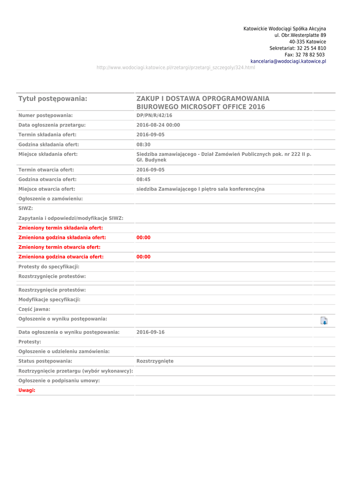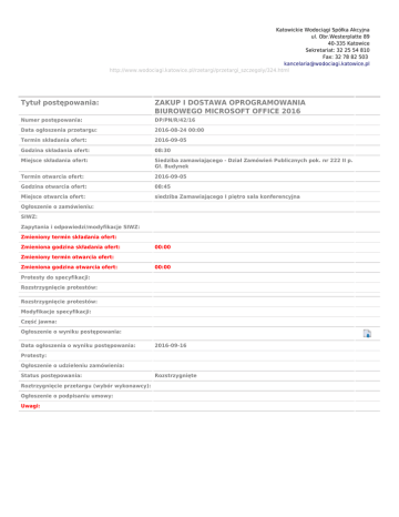 Katowickie Wodociągi Spółka Akcyjna ul. Obr.Westerplatte 89 40-335 Katowice Sekretariat: 32 25 54 810 Fax: 32 78 82 503 [email protected] http://www.wodociagi.katowice.pl/rzetargi/przetargi_szczegoly/324.html Temat Zawartość Tytuł postępowania: ZAKUP I DOSTAWA OPROGRAMOWANIA BIUROWEGO MICROSOFT OFFICE 2016 Numer postępowania: DP/PN/R/42/16 Data ogłoszenia przetargu: 2016-08-24 00:00 Termin składania ofert: 2016-09-05 Godzina składania ofert: 08:30 Miejsce składania ofert: Siedziba zamawiającego - Dział Zamówień Publicznych pok. nr 222 II p. Gł. Budynek Termin otwarcia ofert: 2016-09-05 Godzina otwarcia ofert: 08:45 Miejsce otwarcia ofert: siedziba Zamawiającego I piętro sala konferencyjna Ogłoszenie o zamówieniu: SIWZ: Zapytania i odpowiedzi/modyfikacje SIWZ: Zmieniony termin składania ofert: Zmieniona godzina składania ofert: 00:00 Zmieniony termin otwarcia ofert: Zmieniona godzina otwarcia ofert: 00:00 Protesty do specyfikacji: Rozstrzygnięcie protestów: Rozstrzygnięcie protestów: Modyfikacje specyfikacji: Część jawna: Ogłoszenie o wyniku postępowania: Data ogłoszenia o wyniku postępowania: 2016-09-16 Protesty: Ogłoszenie o udzieleniu zamówienia: Status postępowania: Roztrzygnięcie przetargu (wybór wykonawcy): Ogłoszenie o podpisaniu umowy: Uwagi: Rozstrzygnięte Pobierz