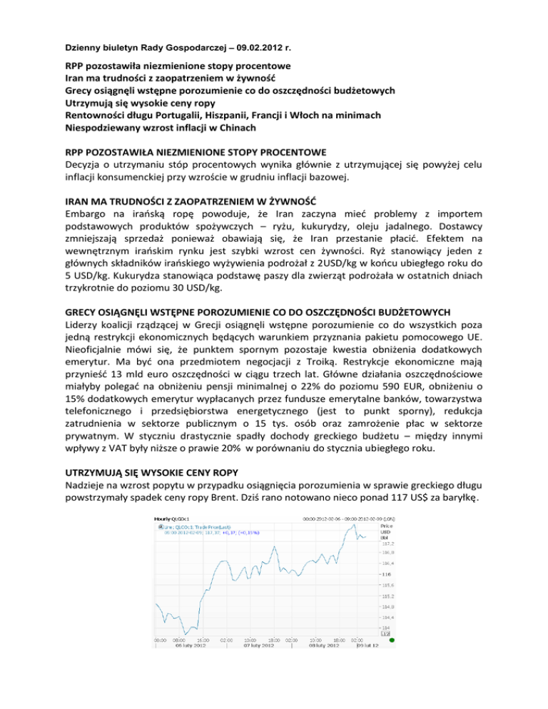 Dzienny biuletyn Rady Gospodarczej – 09.02.2012 r. RPP pozostawiła niezmienione stopy procentowe Iran ma trudności z zaopatrzeniem w żywnośd Grecy osiągnęli wstępne porozumienie co do oszczędności budżetowych Utrzymują się wysokie ceny ropy Rentowności długu Portugalii, Hiszpanii, Francji i Włoch na minimach Niespodziewany wzrost inflacji w Chinach RPP POZOSTAWIŁA NIEZMIENIONE STOPY PROCENTOWE Decyzja o utrzymaniu stóp procentowych wynika głównie z utrzymującej się powyżej celu inflacji konsumenckiej przy wzroście w grudniu inflacji bazowej. IRAN MA TRUDNOŚCI Z ZAOPATRZENIEM W ŻYWNOŚD Embargo na iraoską ropę powoduje, że Iran zaczyna mied problemy z importem podstawowych produktów spożywczych – ryżu, kukurydzy, oleju jadalnego. Dostawcy zmniejszają sprzedaż ponieważ obawiają się, że Iran przestanie płacid. Efektem na wewnętrznym iraoskim rynku jest szybki wzrost cen żywności. Ryż stanowiący jeden z głównych składników iraoskiego wyżywienia podrożał z 2USD/kg w koocu ubiegłego roku do 5 USD/kg. Kukurydza stanowiąca podstawę paszy dla zwierząt podrożała w ostatnich dniach trzykrotnie do poziomu 30 USD/kg. GRECY OSIĄGNĘLI WSTĘPNE POROZUMIENIE CO DO OSZCZĘDNOŚCI BUDŻETOWYCH Liderzy koalicji rządzącej w Grecji osiągnęli wstępne porozumienie co do wszystkich poza jedną restrykcji ekonomicznych będących warunkiem przyznania pakietu pomocowego UE. Nieoficjalnie mówi się, że punktem spornym pozostaje kwestia obniżenia dodatkowych emerytur. Ma byd ona przedmiotem negocjacji z Troiką. Restrykcje ekonomiczne mają przynieśd 13 mld euro oszczędności w ciągu trzech lat. Główne działania oszczędnościowe miałyby polegad na obniżeniu pensji minimalnej o 22% do poziomu 590 EUR, obniżeniu o 15% dodatkowych emerytur wypłacanych przez fundusze emerytalne banków, towarzystwa telefonicznego i przedsiębiorstwa energetycznego (jest to punkt sporny), redukcja zatrudnienia w sektorze publicznym o 15 tys. osób oraz zamrożenie płac w sektorze prywatnym. W styczniu drastycznie spadły dochody greckiego budżetu – między innymi wpływy z VAT były niższe o prawie 20% w porównaniu do stycznia ubiegłego roku. UTRZYMUJĄ SIĘ WYSOKIE CENY ROPY Nadzieje na wzrost popytu w przypadku osiągnięcia porozumienia w sprawie greckiego długu powstrzymały spadek ceny ropy Brent. Dziś rano notowano nieco ponad 117 US$ za baryłkę. Dzienny biuletyn Rady Gospodarczej – 09.02.2012 r. RENTOWNOŚCI DŁUGU PORTUGALII, HISZPANII, FRANCJI i WŁOCH NA MINIMACH Rentownośd Francuskich obligacji osiągnęła 4-miesięczne minimum – 2,9%. Papiery Włoch (5,6%) i Hiszpanii (5,2%) utrzymują się o okolicach 3-miesięcznego minimum. Rentownośd obligacji portugalskich po zapoczątkowanym na przełomie roku spadku z rekordowego poziomu ponad 17% obecnie zatrzymała się na 13,6%. Zmiany rentowności 10letnich obligacji: Portugalii (zielony – prawa skala), Włoch (niebieski – prawa skala), Hiszpanii (różowy – prawa skala), Francji (żółty – lewa skala) NIESPODZIEWANY WZROST INFLACJI W CHINACH Ceny detaliczne w Chinach wzrosły w styczniu o 4,5% r/r. Spodziewano się wzrostu o 4,1%, czyli na takim samym poziomie, jak w grudniu. Analitycy spodziewają się, że był to jednorazowy „wyskok” związany z wydatkami wokół święta Chioskiego Księżycowego Nowego Roku i nie oznacza początku trendu wzrostowego inflacji. Spodziewane jest utrzymanie się inflacji na poziomie 4%. Dziś: Spotkanie ministrów finansów paostw strefy euro, Francja – inwestycje przemysłowe; Wielka Brytania – produkcja przemysłowa, EBC i Bank Anglii – stopy procentowe Dane: Kurs zamknięcia 08.02.12 Zmiana dzienna (w %) WIG20 2376,65 0,08 0,09 10,83 -15,18 -13,39 DAX 6748,76 -0,08 -0,26 14,42 -8,51 -2,39 3410 -0,05 -0,52 7,92 -14,37 -10,38 DJI 12883,95 0,04 0,17 5,45 3,78 11,28 Nikkei 225* 9002,24 -0,15 0,82 6,47 -8,29 -11,99 MSCI AC World 327,29 0,36 0,67 9,28 -4,25 -1,01 Indeks CAC40 Zmiana w por. z Zmiana w por. z Zmiana w por. Zmiana w por. 03.02.12 30.12.11 z 30.06.11 (w z 31.12.10 (w %) (w %) %) (w %) Dzienny biuletyn Rady Gospodarczej – 09.02.2012 r. Waluty Zmiana w por. do Zmiana w por. Zmiana w por. Kurs zamknięcia 08.02 (w z 03.02.12 z 30.12.11 09.02.12 %) (w %) (w %) Zmiana w Zmiana w por. por. z z 31.12.10 30.06.11 (w %) (w %) EUR-PLN 4,18 0,13 0,19 -6,40 4,99 5,75 CHF-PLN 3,45 0,11 -0,08 -5,95 5,98 9,06 USD-PLN 3,14 -0,07 -1,01 -8,74 14,63 6,26 EUR-USD 1,33 0,40 1,10 2,66 -8,19 -0,61 EUR-CHF 1,21 0,07 0,22 -0,40 -0,71 -3,21 EUR-HUF 291 0,19 0,01 -7,56 9,32 4,68 CHF-USD 1,10 0,30 0,85 3,03 -7,56 2,65 Współpraca: Departament Analiz Strategicznych KPRM