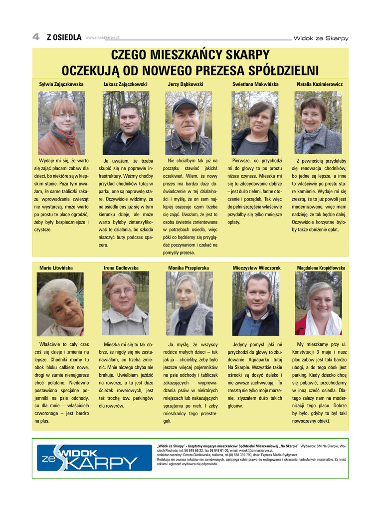 4 z osiedla www.smnaskarpie.pl Widok ze Skarpy Czego mieszkańcy Skarpy Oczekują od nowego prezesa Spółdzielni Sylwia Zajączkowska Łukasz Zajączkowski Wydaje mi się, że warto się zająć placami zabaw dla dzieci, bo niektóre są w kiepskim stanie. Poza tym uważam, że same tabliczki zakazu wprowadzania zwierząt nie wystarczą, może warto po prostu te place ogrodzić, żeby były bezpieczniejsze i czystsze. Ja uważam, że trzeba skupić się na poprawie infrastruktury. Weźmy choćby przykład chodników tutaj w parku, one są naprawdę stare. Oczywiście widzimy, że na osiedlu cos już się w tym kierunku dzieje, ale może warto byłoby zintensyfikować te działania, bo szkoda niszczyć buty podczas spaceru. Maria Litwińska Właściwie to cały czas coś się dzieje i zmienia na lepsze. Chodniki mamy tu obok bloku całkiem nowe, drogi w sumie nienajgorsze choć połatane. Niedawno postawiono specjalne pojemniki na psie odchody, co dla mnie – właściciela czworonoga – jest bardzo na plus. Irena Godlewska Mieszka mi się tu tak dobrze, że nigdy się nie zastanawiałam, co trzeba zmienić. Mnie niczego chyba nie brakuje. Uwielbiam jeździć na rowerze, a tu jest dużo ścieżek rowerowych, jest też trochę tzw. parkingów dla rowerów. Jerzy Dąbkowski Nie chciałbym tak już na początku stawiać jakichś oczekiwań. Wiem, że nowy prezes ma bardzo duże doświadczenie w tej działalności i myślę, że on sam najlepiej oszacuje czym trzeba się zająć. Uważam, że jest to osoba świetnie zorientowana w potrzebach osiedla, więc póki co będziemy się przyglądać poczynaniom i czekać na pomysły prezesa. Monika Przepierska Ja myślę, że wszyscy rodzice małych dzieci – tak jak ja – chcieliby, żeby było jeszcze więcej pojemników na psie odchody i tabliczek zakazujących wyprowadzania psów w niektórych miejscach lub nakazujących sprzątania po nich. I żeby mieszkańcy tego przestregali. Swietłana Makwińska Natalia Kazimierowicz Pierwsze, co przychodzi mi do głowy to po prostu niższe czynsze. Mieszka mi się tu zdecydowanie dobrze – jest dużo zieleni, ładne otoczenie i porządek, Tak więc do pełni szczęścia właściwie przydałby się tylko mniejsze opłaty. Z pewnością przydałaby się renowacja chodników, bo jedne są lepsze, a inne to właściwie po prostu stare kamienie. Wydaje mi się zresztą, że to już powoli jest modernizowane, więc mam nadzieję, że tak będzie dalej. Oczywiście korzystne byłoby także obniżenie opłat. Mieczysław Wieczorek Magdalena Kropidłowska Jedyny pomysł jaki mi przychodzi do głowy to zbudowanie Aquaparku tutaj Na Skarpie. Wszystkie takie ośrodki są dosyć daleko i nie zawsze zachwycają. To zresztą nie tylko moje marzenie, słyszałem dużo takich głosów. My mieszkamy przy ul. Konstytucji 3 maja i nasz plac zabaw jest taki bardzo ubogi, a do tego obok jest parking. Kiedy dziecko chcę się pobawić, przechodzimy w inną cześć osiedla. Dlatego zależy nam na modernizacji tego placu. Dobrze by było, gdyby to był taki nowoczesny obiekt. „Widok ze Skarpy” - bezpłatny magazyn mieszkańców Spółdzielni Mieszkaniowej „Na Skarpie” Wydawca: SM Na Skarpie, Wojciech Piechota: tel. 56 648 66 22, fax 56 648 61 00, email: [email protected], redaktor naczelny: Dorota Gładkowska, reklama, tel.(0) 668 339 790, druk: Express Media Bydgoszcz Redakcja nie zwraca tekstów nie zamówionych, zastrzega sobie prawo do redagowania i skracania nadesłanych materiałów. Za treść reklam i ogłoszeń wydawca nie odpowiada.