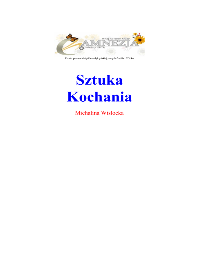 Ebook powstał dzięki benedyktyńskiej pracy Infandila i TG-S-a Sztuka Kochania Michalina Wisłocka PRZEDMOWA Oto polski czytelnik otrzymuje książkę poprzedzoną burzliwą dyskusją, oczekiwaną przez liczne rzesze czytelników, którzy znają autorkę z poprzednich publikacji. Co prawda literatura popularna w Polsce na tematy seksu jest dość obszerna, ale książka doktor Michaliny Wisłockiej jest nowością jakościową. Nowe są w niej ujęcie tematu, i zasób wiedzy przekazywanej czytelnikowi. Sztuka kochania adresowana jest do młodych ludzi ustabilizowanych uczuciowo, a więc przede wszystkim do tych, którzy w niedługim czasie zawrą lub już zawarli związek małżeński. Autorka widzi w erotyce wielką szansę człowieka — szansę na szczęście, na radość życia i udane pożycie małżeńskie. Podaje cały arsenał sposobów i metod rozszerzania doznań, wzbogacania pieszczot, zalotów — w ogóle kontaktów dwojga ludzi, - którzy się kochają. Tak właśnie — kochają, bo autorka wyraźnie mówi, że tylko ludzie, których wiąże coś więcej niż pożądanie i kontakt seksualny, przeżywają pełnię erotyki. Przeprowadzone przed kilkunastu laty badania przedstawione w Raporcie Kinseya wykazały, że znaczny procent kobiet żyjących w małżeństwie nie ma satysfakcji z pożycia małżeńskiego. Procent ten był niebagatelny i niestety stały, podobny w różnych raportach i opracowaniach. Dlaczego godzić się z tym, że dla znacznej części kobiet nieznane są rozkosze życia seksualnego? By tej sytuacji zaradzić, trzeba było dwu rzeczy: po pierwsze rehabilitacji seksu i zmiany nastawienia tej grupy kobiet do życia płciowego, ponieważ by doznawać satysfakcji seksualnej, trzeba seks aprobować. Po drugie nauki techniki współżycia. Nie łudźmy się: techniki współżycia musi nauczyć się każdy. Tu „Instynkt" nie wystarczy. Dlaczego każdy ma odkrywać wszystko na nowo, od początku? Dlaczego seks miałby być jedyną dziedziną życia, w zakresie której nikt nikomu niczego nie przekazuje? Zgodziliśmy się już z tym, że trzeba uświadamiać. Ale ten, kto tak sądzi, powinien także powiedzieć, jak należy współżyć seksualnie, by kobieta była szczęśliwa, by korzystała z danych przez naturę możliwości. W tym ostatnim postulacie zawiera się nowatorstwo pracy doktor Wisłockiej. Wszystkie dostępne w Polsce książki seksuologiczne dochodziły do „muru milczenia", poza który już nie wychodziły. O technice współżycia pisało się mgliście i ogólnikami. W książce tej znajdują się przepisy nieraz prawie typu „książki kucharskiej". Dobrze to czy źle? Oceni czytelnik, ale ja sądzę, że tak właśnie być powinno. Ten, dla którego szczegółowe rady nie są konieczne, nie musi z nich korzystać, ale uważam, że takich w naszym społeczeństwie nie ma zbyt wielu. Przed Sztuką kochania było dużo książek, niekiedy słynnych, urosłych do rangi symbolu, np. Małżeństwo doskonale Van de Veldego. Poprzedzona moją przedmową książka ma także wielką szansę, może stać się istotnym czynnikiem zmieniającym wiele w naszej codziennej obyczajowości; zawdzięcza to komunikatywności — autorka wiele problemów stara się omówić wprost, nie polegając na wyobrazi i czytelnika. Jest jeszcze jedna sprawa, która wymaga podkreślenia. Czytelnik nie zorientowany w literaturze przedmiotu nie zauważy w tej książce warstwy oryginalnej, „odautorskiej", która przeplata się z powszechnie przyjętymi poglądami. Ze szkodą dla siebie i swej pozycji naukowej doktor Wisłocka zaniedbuje publikacje swych prac oryginalnych, badawczych i odkrywczych w prasie naukowej. Swoje wyniki, obserwacje, dociekania i przemyślenia przedstawia w książce popularnie, a więc w ten sposób, jakby referowała powszechnie znane prawdy. Nie każdy będzie w stanie ocenić własny, poważny i twórczy dorobek autorki. To gwoli sprawiedliwości podkreślam. Niezwykła to książka i fakt, że zostałem zaproszony do napisania do niej przedmowy, sprawił mi niekłamaną satysfakcję. Z całą odpowiedzialnością solidaryzuję się ze stanowiskiem autorki. Doc. dr hab. mad, Andrzej Jaczewski 2 OD AUTORA Sztuka kochania nie zawiera recepty na miłość, nie jest także podręcznikiem technik seksualnych. „Kochanie" to piękne polskie słowo, które w moim odczuciu określa ciepły, serdeczny, pełen przyjaźni i harmonii seksualnej kontakt dwojga bliskich sobie ludzi. Moja książka powstała w wyniku piętnastu lat pracy lekarskiej, naukowej oraz społecznopublieystycznej, a więc wykorzystałam w niej doświadczenie płynące z rozmów z pacjentami oraz z lektury dużej liczby listów, przychodzących do Poradni Korespondencyjnej Towarzystwa Planowania Rodziny i do miesięcznika Zdrowie, na które przez wiele lat odpowiadałam, wreszcie materiały i wnioski z dyskusji prasowych, w których wojowałam uparcie o kulturę uczuć i seksu. Przez wiele lat nagromadziłam setki karteczek z pytaniami uczestników wykładów i dyskusji w klubach różnych organizacji społecznych, w domach akademickich, na uczelniach i w szkołach. Starałam się, aby na większość pytań skierowanych do mnie na spotkaniach czytelnicy znaleźli odpowiedź w tej książce. Oddzielnym i niezwykle cennym źródłem informacji o życiu rodziny oraz problemach dręczących małżonków były rozmowy z kobietami i mężczyznami przychodzącymi, aby zasięgnąć porady w sprawach trudności seksualnych, antykoncepcji czy dolegliwości ginekologicznych. Oczywiście, w ogromnej większości udzielałam porad kobietom, co wynika z mojej specjalności podstawowej, jaką jest ginekologia, i stąd też książka mówi przede wszystkim o kobietach, chociaż przeznaczona jest dla „obojga". Nie sądzę jednak, żeby to nastawienie było ujemną stroną książki, ponieważ w moim przekonaniu w kobiecych rękach leży kształt miłości i kultura życia uczuciowego rodz