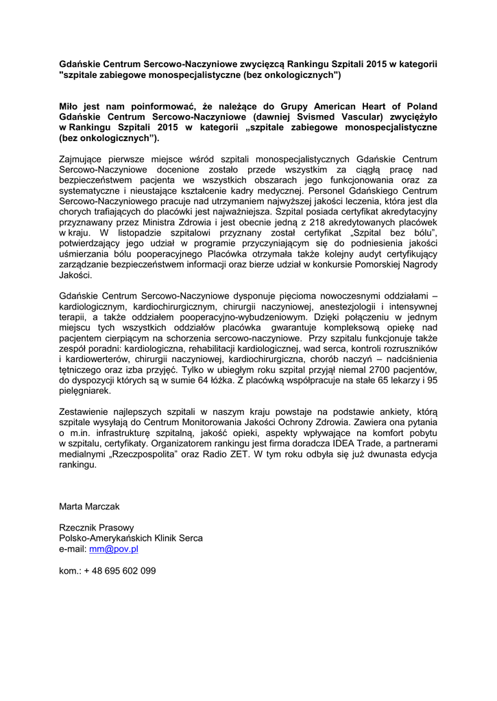 Gdańskie Centrum Sercowo-Naczyniowe zwycięzcą Rankingu Szpitali 2015 w kategorii "szpitale zabiegowe monospecjalistyczne (bez onkologicznych") Miło jest nam poinformować, że należące do Grupy American Heart of Poland Gdańskie Centrum Sercowo-Naczyniowe (dawniej Svismed Vascular) zwyciężyło w Rankingu Szpitali 2015 w kategorii „szpitale zabiegowe monospecjalistyczne (bez onkologicznych”). Zajmujące pierwsze miejsce wśród szpitali monospecjalistycznych Gdańskie Centrum Sercowo-Naczyniowe docenione zostało przede wszystkim za ciągłą pracę nad bezpieczeństwem pacjenta we wszystkich obszarach jego funkcjonowania oraz za systematyczne i nieustające kształcenie kadry medycznej. Personel Gdańskiego Centrum Sercowo-Naczyniowego pracuje nad utrzymaniem najwyższej jakości leczenia, która jest dla chorych trafiających do placówki jest najważniejsza. Szpital posiada certyfikat akredytacyjny przyznawany przez Ministra Zdrowia i jest obecnie jedną z 218 akredytowanych placówek w kraju. W listopadzie szpitalowi przyznany został certyfikat „Szpital bez bólu”, potwierdzający jego udział w programie przyczyniającym się do podniesienia jakości uśmierzania bólu pooperacyjnego Placówka otrzymała także kolejny audyt certyfikujący zarządzanie bezpieczeństwem informacji oraz bierze udział w konkursie Pomorskiej Nagrody Jakości. Gdańskie Centrum Sercowo-Naczyniowe dysponuje pięcioma nowoczesnymi oddziałami – kardiologicznym, kardiochirurgicznym, chirurgii naczyniowej, anestezjologii i intensywnej terapii, a także oddziałem pooperacyjno-wybudzeniowym. Dzięki połączeniu w jednym miejscu tych wszystkich oddziałów placówka gwarantuje kompleksową opiekę nad pacjentem cierpiącym na schorzenia sercowo-naczyniowe. Przy szpitalu funkcjonuje także zespół poradni: kardiologiczna, rehabilitacji kardiologicznej, wad serca, kontroli rozruszników i kardiowerterów, chirurgii naczyniowej, kardiochirurgiczna, chorób naczyń – nadciśnienia tętniczego oraz izba przyjęć. Tylko w ubiegłym roku szpital przyjął niemal 2700 pacjentów, do dyspozycji których są w sumie 64 łóżka. Z placówką współpracuje na stałe 65 lekarzy i 95 pielęgniarek. Zestawienie najlepszych szpitali w naszym kraju powstaje na podstawie ankiety, którą szpitale wysyłają do Centrum Monitorowania Jakości Ochrony Zdrowia. Zawiera ona pytania o m.in. infrastrukturę szpitalną, jakość opieki, aspekty wpływające na komfort pobytu w szpitalu, certyfikaty. Organizatorem rankingu jest firma doradcza IDEA Trade, a partnerami medialnymi „Rzeczpospolita” oraz Radio ZET. W tym roku odbyła się już dwunasta edycja rankingu. Marta Marczak Rzecznik Prasowy Polsko-Amerykańskich Klinik Serca e-mail: [email protected] kom.: + 48 695 602 099