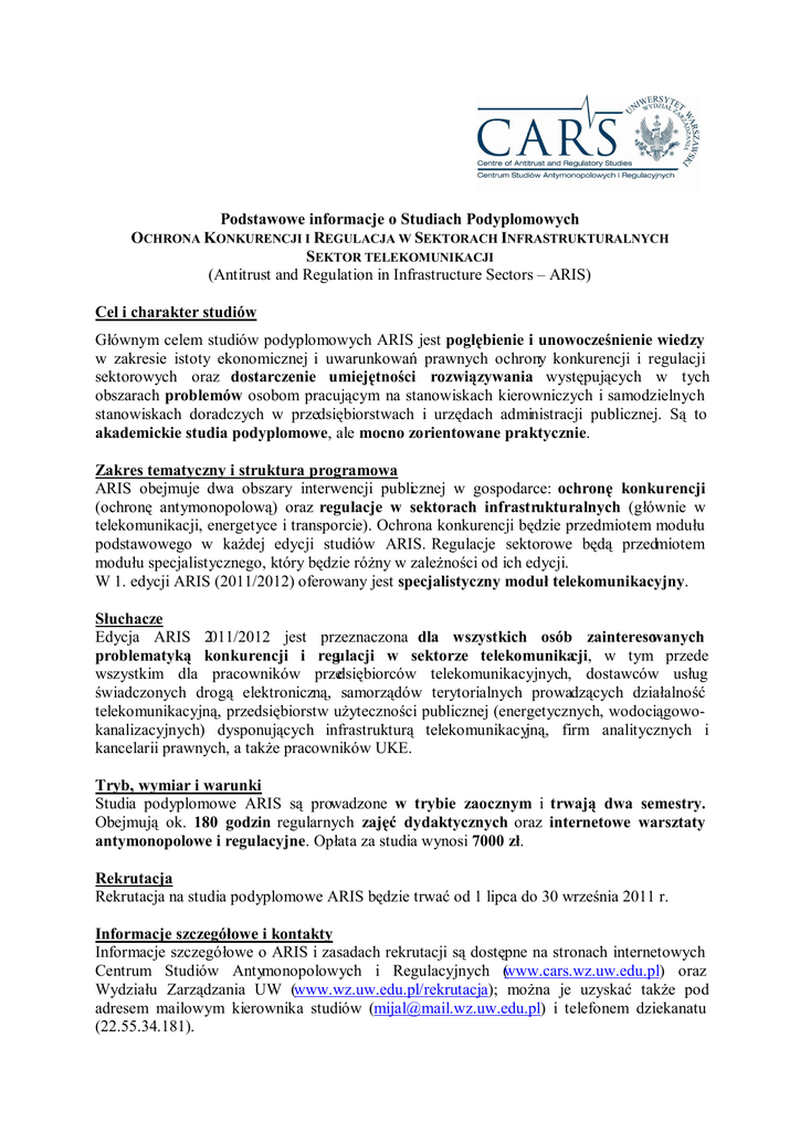 Podstawowe informacje o Studiach Podyplomowych OCHRONA KONKURENCJI I REGULACJA W SEKTORACH INFRASTRUKTURALNYCH SEKTOR TELEKOMUNIKACJI (Antitrust and Regulation in Infrastructure Sectors – ARIS) Cel i charakter studiów Głównym celem studiów podyplomowych ARIS jest pogłębienie i unowocześnienie wiedzy w zakresie istoty ekonomicznej i uwarunkowań prawnych ochrony konkurencji i regulacji sektorowych oraz dostarczenie umiejętności rozwiązywania występujących w tych obszarach problemów osobom pracującym na stanowiskach kierowniczych i samodzielnych stanowiskach doradczych w przedsiębiorstwach i urzędach administracji publicznej. Są to akademickie studia podyplomowe, ale mocno zorientowane praktycznie. Zakres tematyczny i struktura programowa ARIS obejmuje dwa obszary interwencji public znej w gospodarce: ochronę konkurencji (ochronę antymonopolową) oraz regulacje w sektorach infrastrukturalnych (głównie w telekomunikacji, energetyce i transporcie). Ochrona konkurencji będzie przedmiotem modułu podstawowego w każdej edycji studiów ARIS. Regulacje sektorowe będą przedmiotem modułu specjalistycznego, który będzie różny w zależności od ich edycji. W 1. edycji ARIS (2011/2012) oferowany jest specjalistyczny moduł telekomunikacyjny. Słuchacze Edycja ARIS 2011/2012 jest przeznaczona dla wszystkich osób zainteresowanych problematyką konkurencji i regulacji w sektorze telekomunikacji, w tym przede wszystkim dla pracowników przedsiębiorców telekomunikacyjnych, dostawców usług świadczonych drogą elektroniczną, samorządów terytorialnych prowadzących działalność telekomunikacyjną, przedsiębiorstw użyteczności publicznej (energetycznych, wodociągowokanalizacyjnych) dysponujących infrastrukturą telekomunikacyjną, firm analitycznych i kancelarii prawnych, a także pracowników UKE. Tryb, wymiar i warunki Studia podyplomowe ARIS są prowadzone w trybie zaocznym i trwają dwa semestry. Obejmują ok. 180 godzin regularnych zajęć dydaktycznych oraz internetowe warsztaty antymonopolowe i regulacyjne. Opłata za studia wynosi 7000 zł. Rekrutacja Rekrutacja na studia podyplomowe ARIS będzie trwać od 1 lipca do 30 września 2011 r. Informacje szczegółowe i kontakty Informacje szczegółowe o ARIS i zasadach rekrutacji są dostępne na stronach internetowych Centrum Studiów Antymonopolowych i Regulacyjnych (www.cars.wz.uw.edu.pl) oraz Wydziału Zarządzania UW (www.wz.uw.edu.pl/rekrutacja); można je uzyskać także pod adresem mailowym kierownika studiów ([email protected]) i telefonem dziekanatu (22.55.34.181). Zał. 1: Program ramowy (moduły, przedmioty, wykładowcy) Nazwy modułów tematycznych i przedmiotów I. 1. Moduł podstawowy (Ekonomia i prawo ochrony konkurencji i regulacji) Aksjologia ochrony konkurencji i regulacji sektorowych 2. Publicznoprawna ochrona konkurencji i niezależna regulacja sektorowa w UE i Polsce 3. Ekonomiczna teoria konkurencji 1: Skuteczna konkurencja 4. 5. 6. 7. 8. 9. 10. 11. Wykładowcy Ekonomiczna teoria konkurencji 2: Ocena władzy rynkowej Ekonomiczna teoria konkurencji 3: Definiowanie rynków właściwych Strategie zarządzania firmą poddaną nadzorowi antymonopolowemu lub regulacji Ochrona konkurencji przed kartelami Ochrona konkurencji przed nadużywaniem pozycji dominującej Zapewnienie otwartości rynków w drodze prewencyjnej kontroli koncentracji Ochrona konkurencji a prawa własności intelektualnej Zapewnianie dostępu do sieci Doc. dr Cezary Banasiński (Wydz. Prawa i Adm. UW) Prof. UW dr hab. Tadeusz Skoczny (Wydz. Zarządzania UW) Prof. UW dr hab. Zbigniew Hockuba oraz dr Magdalena Olender-Skorek (Wydz. Nauk Ekonomicznych UW) Prof. PŁ dr hab. Anna Fornalczyk (Wydz. Zarządzania Politechniki Łódzkiej) Dr Andrzej Cylwik (CASE) Prof. dr hab. Krzysztof Obłój, dr Michał Zdziarski (Wydz. Zarządzania UW) Dr Agata Jurkowska-Gomułka (Wydz. Zarządzania UW) Dr Agata Jurkowska-Gomułka oraz dr Dawid Miąsik (INP PAN) Prof. UW dr hab. Tadeusz Skoczny (Wydz. Zarządzania UW) Dr Dawid Miąsik (INP PAN) Prof. ALK dr hab. Waldemar Hoff (Akademia Leona Koźmińskiego) Prof. UJ dr hab. Sławomir Dudzik (Wydz. Prawa i Adm. UJ) oraz dr Katarzyna Karasiewicz (Wydz. Prawa i Adm. UW) Dr Maciej Bernatt (Wydz. Zarządzania UW) 12. Zapewnianie usług użyteczności publicznej 13. Postępowania antymonopolowe i regulacyjne II. Moduł specjalistyczny (Regulacja i ochrona konkurencji w telekomunikacji) 1. 2. Instytucje prawa telekomunikacyjnego Ewolucja techniki telekomunikacyjnej a konkurencyjność rynku Ochrona antymonopolowa w telekomunikacji 3. 4. 5. Ekonomika telekomunikacji 6. 7. Najlepsze praktyki regulacyjne w telekomunikacji Regulacja i ochrona antymonopolowa w stosunku do dostawców zawartości w sieciach telekomunikacyjnych Regulacja działalności telekomunikacyjnej samorządów terytorialnych Warunki korzystania z pomocy publicznej w telekomunikacji 8. 9. 10. 11. Rachunkowość regulacyjna w telekomunikacji Ochrona tajemnicy telekomunikacyjnej Internetowe warsztaty antymonopolowe lub regulacyjne Prof. UW dr hab. Stanisław Piątek Dr Marek Średniawa (Instytut Telekomunikacji PW) Dr Agata Jurkowska-Gomułka oraz dr Dawid Miąsik Dr Jerzy Kubasik (Politechnika Poznańska) Prof. dr hab. Jan Turyna (Wydz. Zarządzania UW) Piotr Jasiński (Oxford Economic Consulting) Dr Ewelina Sage (Oxford) Prof. UW dr hab. Michał Kulesza (Wydz. Prawa i Adm. UW) Dr Igor Postuła (Wydz. Zarządzania UW) Dr Grzegorz Sibiga (Instytut Nauk Prawnych PAN) Prof. UW dr hab. Tadeusz Skoczny, Prof. UW dr hab. Stanisław Piątek