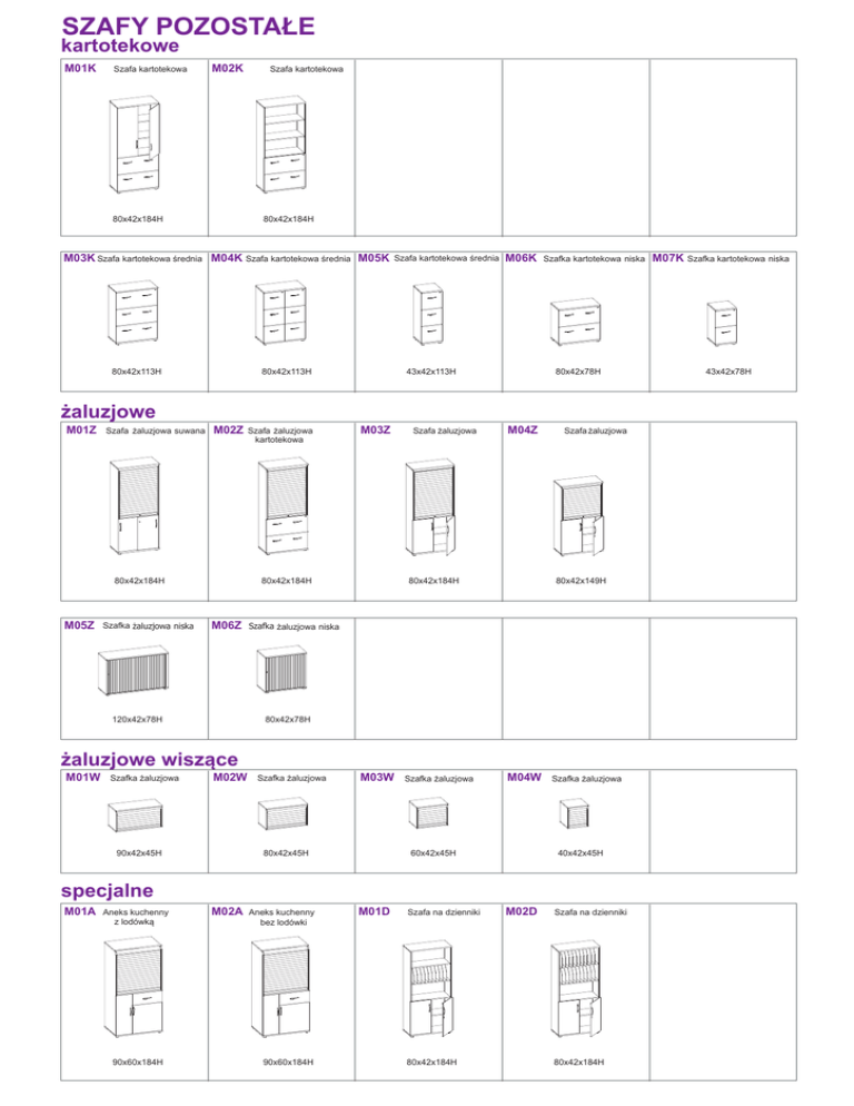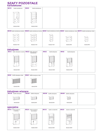 SZAFY POZOSTAŁE kartotekowe M01K Szafa kartotekowa M02K 80x42x184H Szafa kartotekowa 80x42x184H M03K Szafa kartotekowa średnia M04K Szafa kartotekowa średnia M05K 80x42x113H Szafa kartotekowa średnia 80x42x113H M06K 43x42x113H Szafka kartotekowa niska 80x42x78H żaluzjowe M01Z Szafa żaluzjowa suwana M02Z 80x42x184H M05Z Szafka żaluzjowa niska Szafa żaluzjowa kartotekowa M03Z 80x42x184H M06Z 120x42x78H Szafa żaluzjowa M04Z 80x42x184H Szafa żaluzjowa 80x42x149H Szafka żaluzjowa niska 80x42x78H żaluzjowe wiszące M01W Szafka żaluzjowa M02W 90x42x45H Szafka żaluzjowa M03W 80x42x45H Szafka żaluzjowa M04W Szafka żaluzjowa 40x42x45H 60x42x45H specjalne M01A Aneks kuchenny z lodówką 90x60x184H M02A Aneks kuchenny bez lodówki 90x60x184H M01D Szafa na dzienniki 80x42x184H M02D Szafa na dzienniki 80x42x184H M07K Szafka kartotekowa niska 43x42x78H schowkowe B01C Szafa schowkowa B02C 80x38x184H B01P Szafa na pocztę Szafa schowkowa B03C 80x38x149H B02P 80x38x184H Szafa schowkowa B04C Szafa schowkowa 80x38x113H Szafa na pocztę B03P 80x38x149H 120x38x113H Szafa na pocztę B04P Szafa na pocztę 80x38x113H 120x38x113H otwarte wolnostojące B01O Regał otwarty - całość #25 B02O Regał otwarty - całość #25 146,5x36x148H B03O Regał otwarty - całość #25 146,5x36x113H B04O Regał otwarty - całość #25 110,5x36x113H 80x36x78H regały na czasopisma B01CZ Regał na czasopisma a) półki skośne stałe b) półki skośne uchylne 120x38x184H B02CZ Regał na czasopisma a) półki sko śne stałe b) półki skośne uchylne 80x38x184H B03CZ Regał na czasopisma a) półki sko śne stałe b) półki skośne uchylne Regały na czasopisma przekrój; półki stałe Regały na czasopisma przekrój; półki uchylne 40x38x184H regały ażurowe B01AZ Regał ażurowy 80x38x184H B02AZ Szafo- regał ażurowy 80x38x184H B03AZ Regał ażurowy narożny 66x66x184H B04AZ Półka ażurowa 150x20x98H B05AZ Półka ażurowa 100x20x98H SZAFY Z DRZWIAMI PRZESUWNYMI I WYSOKIE z drzwiami suwanymi, głębokosć 38cm B01S Szafa suwana B02S bez zamka Szafka suwana niska bez zamka B03S bez zamka 120x38x149H B06S Szafa suwana B01S B03S B05S B04S bez zamka 80x38x149H Plecy z płyty do Szafa suwana średnia Szafa suwana średnia bez zamka B05S bez zamka 120x38x78H 80x38x113H 120x38x113H Szafka suwana niska Plecy z płyty do dopłata B02S B04S B06S Zamek do szaf z drzwiami przesuwnymi dopłata dopłata 80x38x78H z drzwiami suwanymi, , głębokosć 42cm M01S Szafa suwana M02S bez zamka Szafka suwana niska bez zamka M03S bez zamka 120x42x149H M06S Szafa suwana bez zamka 80x42x149H Plecy z płyty do M01S M03S M05S Szafa suwana średnia M04S Szafa suwana średnia bez zamka 120x42x113H M05S Szafka suwana niska bez zamka 120x42x78H 80x42x113H Plecy z płyty do dopłata M02S M04S M06S Zamek do szaf z drzwiami przesuwnymi dopłata dopłata 80x42x78H z drzwiami suwanymi na prowadnicach metalowych M01SM Szafa suwana wysoka bez zamka 120x42x219H M02SM Szafa suwana bez zamka 120x42x184H Plecy z płyty do M01SM M02SM M03SM M04SM M05SM dopłata Zamek do szaf z drzwiami przesuwnymi dopłata M03SM Szafa suwana bez zamka 120x42x149H M04SM Szafa suwana rednia bez zamka 120x42x113H M05SM Szafka suwana niska bez zamka 120x42x78H wysokie, głębokość 38cm B101W Szafa aktowa wysoka B102W 80x38x219H B109W Regał aktowy wysoki Szafa aktowa wysoka B103W 40x38x219H B110W 40x38x219H Regał aktowyi wysoki Szafo-regał aktowy wysoki 80x38x219H B116W 42x38x219H B104W Szafo-regał aktowy B108W Regał aktowy wysoki wysoki 80x38x219H 80x38x219H Szafa aktowa wysoka 80x38x219H wysokie, głębokość 42cm M101W Szafa aktowa wysoka 80x42x219H M109W Regał aktowy wysoki 40x42x219H M102W Szafa aktowa wysoka M103W Szafo-regał aktowy wysoki 40x42x219H M110W Regał aktowyi wysoki 42x42x219H 80x42x219H M116W Szafa aktowa wysoka 80x42x219H M104W Szafo-regał aktowy M108W Regał aktowy wysoki wysoki 80x42x219H 80x42x219H