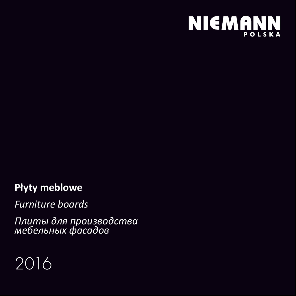 Płyty meblowe Furniture boards Плиты для производства мебельных фасадов 2016 Komponenty meblowe do produkcji mebli, frontów oraz indywidualnie zaprojektowanych wnętrz. Niech spektrum naszych produktów będzie inspiracją! Furniture Components for design oriented furniture manufacturers. Be inspired by the spectrum of our products. Мебельные компоненты для индивидуально-ориентированного производства мебели. Пусть многообразие наших продуктов послужит источником Вашего вдохновения! Jakość – funkcjonalność – design – niezawodność – to główne założenia marki Niemann! Dzięki długiej historii działalności firmy na różnych rynkach, Niemann specjalizuje się w rozwijaniu niestandardowych rozwiązań. Silna orientacja na klienta wymaga ciągłej obserwacji trendów na rynku, zwłaszcza w zakresie najnowszych osiągnięć w technice produkcji, kolorów i wzorów. Klienci mogą czerpać korzyści z wysokiej jakości produktów Niemann, przestrzeganiu terminów dostaw i profesjonalnej logistyce. Quality – functionality – design – reliability – these are Niemann’s guidelines! On the basis of its long appliance orientated know-how, Niemann specializes in the development of customized solutions. This strong customer orientation requires a continuous observation of market trends especially regarding the latest developments in processing technique, colour or design. Customers can take competitive advantages from Niemann’s high quality standards, short lead times, adherence to delivery times and professional logistics. Качество – функциональность – дизайн – надежность – вот главные ориентиры компании Niemann! Основываясь на длительных прикладных разработках, Niemann специализируется на развитии индивидуальных решений. Этот подход, ориентированный на клиента, требует постоянного исследования новых направлений рынка, особенно касающихся последних разработок в области техники обработки, цвета и дизайна. Заказчики получают конкурентные преимущества, благодаря высоким стандартам качества продукции Niemann, коротким срокам выполнения заказов, соблюдению сроков поставки, а также профессиональной логистике. Do każdej płyty oferujemy dopasowane kolorystycznie obrzeże Color-Matched Edge available to all boards Для всех плит возможна кромка в цвет 19 Obrzeże dwukolorowe 2-Tone Edge Двухцветная кромка Kubanit 7408X 19 Grubość płyty Board thickeness Толщина плит M Obrzeże dopasowane do dekoru Decor-Matched Edge Кромка с соответствующим декором M Kolor metaliczny Metallic Металлик Przedstawione wzory i kolory mogą różnić się od oryginalnych. ACRYLUX Płyty pokryte powłoką akrylową grubości 0,7-1mm. Gruba warstwa tworzywa, która jest fabrycznie utwardzona zapewnia idealną głębię koloru, dużą odporność na zarysowanie, uszkodzenia mechaniczne oraz promieniowanie UV. Dodatkowym atutem jest brak konieczności stosowania preparatów utwardzających powierzchnię i zabezpieczających płyty, po usunięciu folii protekcyjnej. Płyty Acrylux oferujemy w dwóch wariantach (z wykorzystaniem tej samej kolorystyki akryli odpornych na zarysowania): • Acrylux Premium X – standartowa płyta wyprodukowana na bazie wysokiej jakości dwustronnie melaminowanej płyty MDF, tył wykończony białą melaminą. Oznaczenie X. • Acrylux ECO – płyta wyprodukowana na bazie bardziej ekonomicznej polskiej płyty MDF, tył płyty malowany na biało. Płyty z oznaczeniem K. NOWOŚĆ – Acrylux 0.5 – płyta o idealnie gładkiej powierzchni, standardowej odporności na zarysowania i bardzo atrakcyjnej cenie. Boards with 0,7-1mm thick acrylic layer which gives great depth of a high gloss color. Acrylic sheet is additionally covered with hard coat which provides high scratch resistance, resistance to mechanical damages and UV light. Also there is no further treatment required after removing protective film. We are offering two types of Acrylux boards (both in same scratch resistant color range): • Acrylux Premium X – our standart product manufactured on high quality melamine faced MDF substrate. Back side finished with white melamine. Boards marked with X • Acrylux ECO – boards manufactured on more economic Polish MDF substrate. Back side finished in painted white. Boards marked with K. NEW PRODUCT – Actrylux 0.5 – smooth surface, standard scratch resistance and very competive price. Плиты с акриловым покрытием толщиной 0,7-1 мм, которое придает цвету насыщенную глубину и высокий глянец. Акриловый лист дополнительно покрыт жестким слоем, который обеспечивает высокую устойчивость к царапинам, механическим повреждениям и ультрафиолетовому свету. Также, больше нет необходимости в особом отношении сразу после снятия защитной пленки. Мы предлагаем два типа Акриловых плит (оба в одинаковом цветовом ассортименте, устойчивом к царапинам): • Acrylux Pr