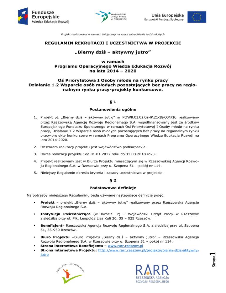 Projekt realizowany w ramach Inicjatywy na rzecz zatrudniania ludzi młodych REGULAMIN REKRUTACJI I UCZESTNICTWA W PROJEKCIE „Bierny dziś – aktywny jutro” w ramach Programu Operacyjnego Wiedza Edukacja Rozwój na lata 2014 – 2020 Oś Priorytetowa I Osoby młode na rynku pracy Działanie 1.2 Wsparcie osób młodych pozostających bez pracy na regionalnym rynku pracy-projekty konkursowe. §1 Postanowienia ogólne 1. Projekt pt. „Bierny dziś – aktywny jutro” nr POWR.01.02.02-IP.21-18-004/16 realizowany przez Rzeszowską Agencję Rozwoju Regionalnego S.A. współfinansowany jest ze środków Europejskiego Funduszu Społecznego w ramach Osi Priorytetowej I Osoby młode na rynku pracy, Działanie 1.2 Wsparcie osób młodych pozostających bez pracy na regionalnym rynku pracy-projekty konkursowe w ramach Programu Operacyjnego Wiedza Edukacja Rozwój na lata 2014-2020. 2. Obszarem realizacji projektu jest województwo podkarpackie. 3. Okres realizacji projektu: od 01.01.2017 roku do 31.03.2018 roku. 4. Projekt realizowany jest w Biurze Projektu mieszczącym się w Rzeszowskiej Agencji Rozwoju Regionalnego S.A. w Rzeszowie przy u. Szopena 51 – pokój nr 114. 5. Niniejszy Regulamin określa kryteria i zasady uczestnictwa w projekcie. §2 Podstawowe definicje Projekt – projekt „Bierny dziś – aktywny jutro” realizowany przez Rzeszowską Agencję Rozwoju Regionalnego S.A. Instytucja Pośrednicząca (w skrócie IP) – Wojewódzki Urząd Pracy w Rzeszowie z siedzibą przy ul. Płk. Leopolda Lisa Kuli 20, 35 – 025 Rzeszów. Beneficjent– Rzeszowska Agencja Rozwoju Regionalnego S.A. z siedzibą przy ul. Szopena 51, 35-959 Rzeszów. Biuro Projektu –Biuro Projektu „Bierny dziś – aktywny jutro” – Rzeszowska Agencja Rozwoju Regionalnego S.A. w Rzeszowie przy u. Szopena 51 – pokój nr 114. Strona internetowa Beneficjenta – www.rarr.rzeszow.pl Strona internetowa Projektu: http://www.rarr.rzeszow.pl/projekty/bierny-dzis-aktywnyjutro Strona 1 Na potrzeby niniejszego Regulaminu będą używane następujące definicje pojęć: Projekt realizowany w ramach Inicjatywy na rzecz zatrudniania ludzi młodych Uczestnik projektu– Kandydat, który zostanie zakwalifikowany do udziału w Projekcie, zgodnie z zasadami określonymi w Regulaminie rekrutacji i uczestnictwa w projekcie i skorzysta z co najmniej jednej formy wsparcia zaproponowanej w Projekcie. Dzień przystąpienia do Projektu – dzień podpisania Deklaracji uczestnictwa w projekcie. Deklaracja uczestnictwa w projekcie jest podpisywana tylko przez osoby, które zostały zakwalifikowane do udziału w projekcie. Dokumenty rekrutacyjne – komplet dokumentów, który należy złożyć w Biurze Projektu, w terminie podanym w ogłoszeniu o naborze uczestników do Projektu. NIK – Numer Identyfikacyjny Kandydata – numer nadany w momencie złożenia Dokumentów rekrutacyjnych. Komisja Rekrutacyjna (w skrócie KR) – zespół oceniający Dokumenty rekrutacyjne kandydatów do udziału w Projekcie i dokonujący kwalifikacji Kandydatów na Uczestników projektu Osoby o niskich kwalifikacjach – osoby posiadające wykształcenie na poziomie do ISCED 3 – wykształcenie ponadgimnazjalne (włącznie); Osoby z niepełnosprawnościami –osoby niepełnosprawne w rozumieniu ustawy z dnia 27 sierpnia 1997 r. o rehabilitacji zawodowej i społecznej oraz zatrudnianiu osób niepełnosprawnych (Dz. U. z 2011 r. Nr 127, poz. 721, z późn. zm.), a także osoby z zaburzeniami psychicznymi w rozumieniu ustawy z dnia 19 sierpnia 1994 r. o ochronie zdrowia psychicznego (Dz. U. z 2011 r. Nr 231, poz. 1375) Wsparciem w projektach mogą być objęte wyłącznie osoby niezarejestrowane w urzędach pracy, tj.: Osoby bezrobotne - w rozumieniu definicji zawartej we Wspólnej Liście Wskaźników Kluczowych (WLWK) to osoby, które deklarują, że pozostają bez pracy, są gotowe do podjęcia pracy i aktywnie poszukują zatrudnienia. Osoby bierne zawodowo – w rozumieniu definicji zawartej we Wspólnej Liście Wskaźników Kluczowych (WLWK) to osoby, które deklarują, że nie pracują i aktywnie nie poszukują zatrudnienia. Osoby, które w danej chwili nie tworzą zasobów siły roboczej (tzn. nie pracują1 i nie są bezrobotne). Studenci studiów stacjonarnych są uznawani za osoby bierne za- Strona Osoby pracujące to osoby w wieku 15 lat i więcej, które wykonują pracę, za którą otrzymują wynagrodzenie, z której czerpią zyski lub korzyści rodzinne lub osoby posiadające zatrudnienie lub własną działalność, które jednak chwilowo nie pracowały ze względu na np. chorobę, urlop, spór pracowniczy czy kształcenie się lub szkolenie. Osoby prowadzące działalność na własny rachunek – prowadzące działalność gospodarczą, gospodarstwo rolne lub praktykę zawodową - są również uznawane za pracujących, o ile spełniony jest jeden z poniższych warunków: 1) osoba pracuje w swojej działalności, praktyce zawodowej lub gospodarstwie rolnym w celu uzyskania dochodu, nawet jeżeli przedsiębiorstwo nie osiąga zysków; 2) osoba poświęca czas na prowadzenie działalności gospodarczej, praktyki zawodowej czy gospodarstwa rolnego, nawet jeżeli nie zrealizowano żadnej sprzedaży lub usług i nic nie wyprodukowano (np. rolnik wykonujący prace w celu utrzymania swojego gospodarstwa; architekt spędzający czas w oczekiwaniu na klientów w swoim biurze; rybak naprawiający łódkę czy siatki rybackie, aby móc dalej pracować; osoby uczestniczące w konwencjach lub seminariach); 3) osoba jest w trakcie zakładania działalności gospodarczej, gospodarstwa rolnego lub praktyki zawodowej; zalicza się do tego zakup lub instalację sprzętu, zamawianie towarów w ramach przygotowań do uruchomienia działalności. Bezpłatnie pomagający członek rodziny uznawany jest za osobę pracującą, jeżeli wykonywaną przez siebie pracą wnosi bezpośredni wkład w działalność gospodarczą, gospodarstwo rolne lub praktykę zaw