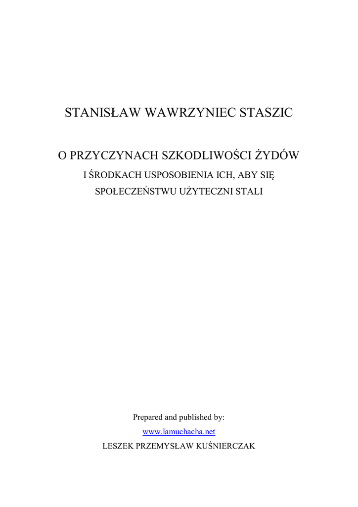 STANISŁAW WAWRZYNIEC STASZIC O PRZYCZYNACH SZKODLIWOŚCI ŻYDÓW I ŚRODKACH USPOSOBIENIA ICH, ABY SIĘ SPOŁECZEŃSTWU UŻYTECZNI STALI Prepared and published by: www.lamuchacha.net LESZEK PRZEMYSŁAW KUŚNIERCZAK O PRZYCZYNACH SZKODLIWOŚCI ŻYDÓW I ŚRODKACH USPOSOBIENIA ICH, ABY SIĘ SPOŁECZEŃSTWU UŻYTECZNI STALI Do przyczyn wielkich nieszczęść narodu polskiego należą żydzi. Niebaczni przodkowie nasi od skończenia się domu Piastów, ciągle nie zważali na postęp cywilizacji Europy, ani użytkowali z doświadczeń innych narodów. Kiedy ludy europejskie, wychodząc z feudalizmu, wszystkie ustalały u siebie tronów dziedzictwo, oni, w ten czas dziedzictwo korony, od niepamiętnych czasów w Polsce ustanowione, wstrzęśli i zsłabili, następnie ten istotny punk jednoty w społeczeństw słabić i burzyć nie przestawali. Kiedy już w Europie gotowe wojska stawały się jedyną trwałości państw obroną, kiedy w wiekach Ludwika XIV i Fryderyka II już wszczął się niezmierny wzrost stałych wojsk ogromu, w Polsce wojska, z ówczesnych największe najbitniejsze, w doświadczeniu, w sztuce wojennej biegłe, laurami zwycięstw okryte, pod Augustem zwinięto. Kiedy żydów, jak zarazę niszczącą postęp cywilizacji narodów, wypędzono z Hiszpanii, z Francji, z Niemiec i z innych krajów Europy, a pod karą śmierci, jak wyjętych spod wszelkiego prawa, nie wpuszczono do Rosji, na ten czas sami Polacy otwarli im wszystkie granice, dali przytułek i większą swobodność, niż rodowitym mieszczanom i rolnikom. Dwa pierwsze błędy przywiodły naród do upadku i do podziału. W tym nieszczęściu jeszcze byśmy przez oświecenie, przez cywilizację wznieść się i ratować mogli, lecz błąd trzeci, żydzi byli zarazą wewnątrz, zarazą ciągle politycznie ciało słabiącą i nędzniącą. Chociażby nawet to ciało nie było podzielone, chociażby po podziale znowu zjednoczonem zostało, przecież z tą wewnętrzną skazą, nigdy nie można nabrać właściwych sobie sił, ani czerstwości; musi na zawsze być tylko słabe, wynędzniałe i nikczemne. Żydzi po całej Polsce rozsypani, w rzędzie z swym duchem wyłączności z naszym ludem pomieszani, tylko zaplugawią cały naród, zaplugawią cały kraj, a zmieniając go w kraj żydowski, wystawią w Europie na poniewierkę i wzgardę. Między powodami wygnania żydów z państw Europy i te dwie przyczyny znajdują się w ówczesnych dziejopisarzach. Pierwsza: żydzi wyniszczają włościan, żydzi pozbawiają ich wszelkiego zabytku (dobytku), potrzebnego do czynienia rolniczych nakładów; są więc szkodliwi rolnictwu. Druga: żydzi tamują w narodzie wzrost przemysłu, rękodzieł, fabryk i rzemiosł, nie dozwalają wznieść się w kraju stanowi po rolnikach najużyteczniejszemu, stanowi sztuk i ~2~ kunsztów; z nimi nie mogą się podnieść miasta do tego porządku i do tej zamożności, jakich postęp cywilizacji narodu wymaga. Ta sama w ówczesnych krainach żydowskich szkodliwość, do najwyższego stopnia w naszym kraju przychodzi. Wszyscy ją poznajemy, wszyscy na szkodliwość żydów wołamy, i ten głos jest w narodzie polskim najpowszechniejszy. W pamiętnej epoce konstytucyjnego sejmu, kiedy naród jakby cudem z długiego letargu obudzający się, ujrzał główne swojej nędzy i upadku przyczyny, jednomyślnie potrzebę niezwłocznej reformy żydów uznano. W roku zeszłym 1814 skoro tylko naród zasłyszał o dobroczynnych zamiarach Najjaśniejszego Pana, natychmiast ten był głos jednomyślny, te prośby wszystkich klas ludu, aby od szkodliwości żydów uwolnić wsie i miasta. Musi ta szkodliwość żydów być mocno naród dotykającą, kiedy po tylu nadzwyczajnych nieszczęściach, po tylu okropnych wojen uciskach, przecież uczucia nędzy kraju z przyczyny żydów odzywają się najgodniej w odgłosie powszechnym, i świadczą, że nawet w chwilach tylu cierpień, złe ze strony żydów jest dolegające nam najgłębiej, jest rażące naród Polaków najpowszechniej. Wszystkie ludy klasy, wszyscy właściciele, przeciwko własnym pożytkom, po takim zniszczeniu, wszyscy wołają i proszą o uchylenie żydów od szynku trunków. Żydzi w innych Europy narodach, które swoją szkodliwością przymusili do gwałtownych przeciw nim środków, nie zajmowali tam ogólnie szynku wszystkich trunków. Zajmowali się częścią tylko kupczeniem wina. Jaka już w tym samym różnica w stosunkach szkodliwości tamtych, do szkodliwości żydów naszych! Inne trunki wino, piwo, są łagodniejsze, są najmniej szkodliwe, nie ułatwiają sposobów do wszelkiego oszukaństwa i do bezkarnego użytkowania z oszukanych. Te trunki tylko w wielkiej ilości naruszają i burzą porządek w organizacji ludzkiej, mieszają władze umysłowe, i przeto podobno żydzi u nas najmniej do takich trunków się biorą, owszem są niesprzyjającymi piwu, od tego używania usilnie nasz lud odmawiają i odwodzą; piwo zaś, na szynk im wstawione, umyślnie psują trzymaniem go w nieczystości, aby od używania tego napoju lud się odrażał. Przeciwnie gorzałka w małej mierze czyni niezwłoczne skutki na ciele i duszy człowieka: zniewładnia pierwsze, a miesza działanie drugiej. Gorzałczany alkohol uderza szczególnie w nerwy i w organizację umysłową, odbiera jej władzę zastanawiania się, pamięci, rozwagi i całej nad ciałem naszym władności. W takim stanie naszego człowieka rolnika postawiwszy samodzielność szynkarza otwiera włościanina kieszeń żydowskiemu sumieniu, które oszukaństw i skrzywdzeń ~3~ człowieka obcego, człowieka bałwochwalcą nazwanego, bynajmniej żydowi nie wyrzuca, ani tak niegodziwego czynu nie przygani. W takim stanie robi u nas żyd z rolnikiem swoje obrachunki, czyni z nim umowy, zapisuje po drzwiach i po ścianach tego nieszczęśliwego długów cyrografy, a tak obiera go z jego wszelkich zapasów. Druga jeszcze większa, a gorzałce szczególnie właściwa jest szkodliwość
