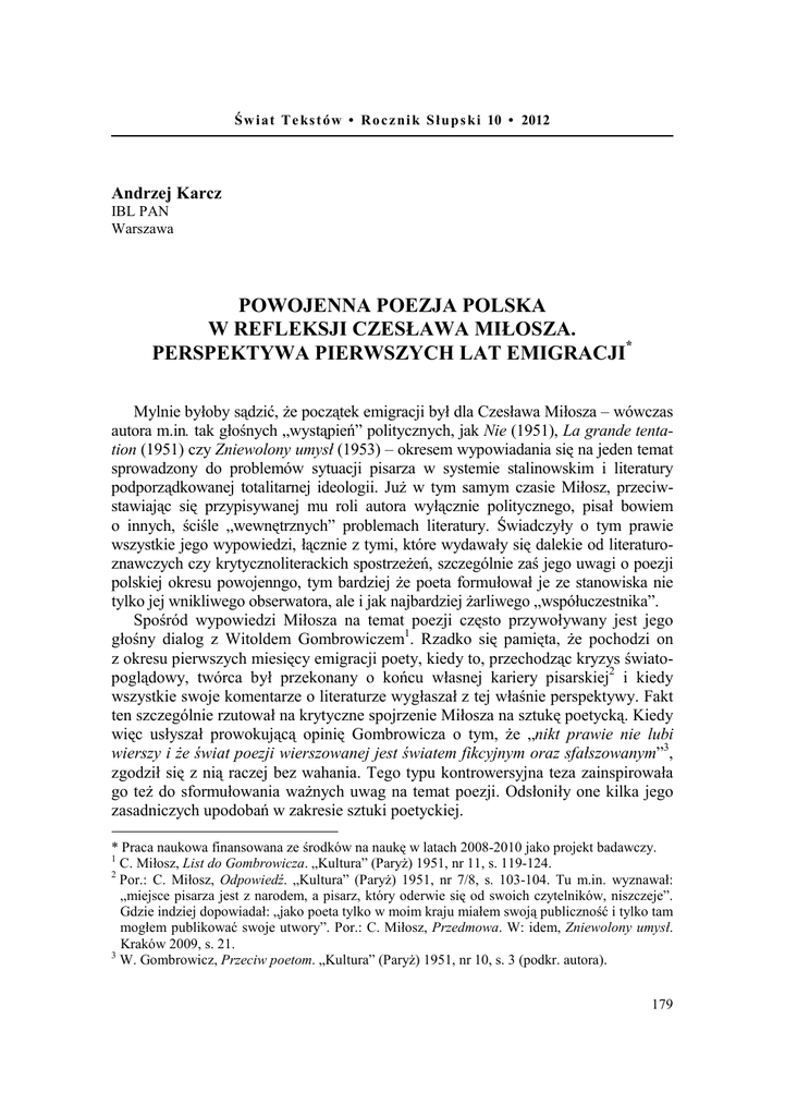 Ś w i a t T e ks t ó w • R o c z ni k S ł u p s ki 10 • 2012 Andrzej Karcz IBL PAN Warszawa POWOJENNA POEZJA POLSKA W REFLEKSJI CZESŁAWA MIŁOSZA. PERSPEKTYWA PIERWSZYCH LAT EMIGRACJI* Mylnie byłoby sądzić, że początek emigracji był dla Czesława Miłosza – wówczas autora m.in. tak głośnych „wystąpień” politycznych, jak Nie (1951), La grande tentation (1951) czy Zniewolony umysł (1953) – okresem wypowiadania się na jeden temat sprowadzony do problemów sytuacji pisarza w systemie stalinowskim i literatury podporządkowanej totalitarnej ideologii. Już w tym samym czasie Miłosz, przeciwstawiając się przypisywanej mu roli autora wyłącznie politycznego, pisał bowiem o innych, ściśle „wewnętrznych” problemach literatury. Świadczyły o tym prawie wszystkie jego wypowiedzi, łącznie z tymi, które wydawały się dalekie od literaturoznawczych czy krytycznoliterackich spostrzeżeń, szczególnie zaś jego uwagi o poezji polskiej okresu powojenngo, tym bardziej że poeta formułował je ze stanowiska nie tylko jej wnikliwego obserwatora, ale i jak najbardziej żarliwego „współuczestnika”. Spośród wypowiedzi Miłosza na temat poezji często przywoływany jest jego głośny dialog z Witoldem Gombrowiczem1. Rzadko się pamięta, że pochodzi on z okresu pierwszych miesięcy emigracji poety, kiedy to, przechodząc kryzys światopoglądowy, twórca był przekonany o końcu własnej kariery pisarskiej2 i kiedy wszystkie swoje komentarze o literaturze wygłaszał z tej właśnie perspektywy. Fakt ten szczególnie rzutował na krytyczne spojrzenie Miłosza na sztukę poetycką. Kiedy więc usłyszał prowokującą opinię Gombrowicza o tym, że „nikt prawie nie lubi wierszy i że świat poezji wierszowanej jest światem fikcyjnym oraz sfałszowanym”3, zgodził się z nią raczej bez wahania. Tego typu kontrowersyjna teza zainspirowała go też do sformułowania ważnych uwag na temat poezji. Odsłoniły one kilka jego zasadniczych upodobań w zakresie sztuki poetyckiej. * Praca naukowa finansowana ze środków na naukę w latach 2008-2010 jako projekt badawczy. 1 C. Miłosz, List do Gombrowicza. „Kultura” (Paryż) 1951, nr 11, s. 119-124. 2 Por.: C. Miłosz, Odpowiedź. „Kultura” (Paryż) 1951, nr 7/8, s. 103-104. Tu m.in. wyznawał: „miejsce pisarza jest z narodem, a pisarz, który oderwie się od swoich czytelników, niszczeje”. Gdzie indziej dopowiadał: „jako poeta tylko w moim kraju miałem swoją publiczność i tylko tam mogłem publikować swoje utwory”. Por.: C. Miłosz, Przedmowa. W: idem, Zniewolony umysł. Kraków 2009, s. 21. 3 W. Gombrowicz, Przeciw poetom. „Kultura” (Paryż) 1951, nr 10, s. 3 (podkr. autora). 179 W odpowiedzi Gombrowiczowi Miłosz oświadczył, iż podobnie do autora Ferdydurke nie aprobuje „poezji czystej”. Miał na myśli utwory poetyckie, w których środki ekspresji są celem same w sobie i na sobie skupiają uwagę. Dla Miłosza wartość ma natomiast poezja, która nie jest zanadto poetycka i przy lekturze której „czytelnik czuje, że autor używa rytmu i obrazów jako środka, żeby coś powiedzieć”4. Wyjaśniając tę jakość przyszły autor Gucia zaczarowanego przywołał również cenioną przez siebie, choć bliżej nieokreśloną, kategorię „siły magicznej” w poezji, dopowiadał tylko, że „prawdziwa »magia« jest tylko wtedy, kiedy jest niedostrzegalna”5. W późniejszej recenzji Ślubu Gombrowicza Miłosz nawiązał do swojej odpowiedzi, gdy pisał o problemie wiersza w utworach dramatycznych. „Mimo wielu usiłowań – stwierdzał – w ciągu ostatnich dziesiątków lat, nikomu nie udało się dotychczas napisać po polsku wartościowej sztuki wierszem, bo wiersz w sztuce musi być naturalny, a nie »poetyczny«”6. Niemniej jednak ową wartościową sztukę Miłosz dostrzegł właśnie w Ślubie, uznając utwór za rezultat „rozczytywania się” autora w Szekspirze. „Jeżeli taki ma być skutek ataków Gombrowicza na poezję – konkludował Miłosz – to każdy z jego atakami się zgodzi”7. W dialogu z autorem Ferdydurke Czesław Miłosz wyraził ponadto opinię o innym zjawisku dotyczącym poezji. Potwierdzała ona jego preferencje poetyckie, a odnosiła się do pozytywnych zmian, jakie dostrzegł on w języku i stylu poezji polskiej pierwszych lat po wojnie8. W ogóle był zdania, że – jak to ujął później w liście prywatnym – poezja ta „dokonała olbrzymiego skoku od czasów Skamandra” oraz że „rozwinęła się i rytmicznie, i w kierunku intelektualnym”9. Między innymi na temat tych zmian pisał również w eseju O wierszach Jastruna10, w którym lata 1945-1949 nazwał (co prawda nie bez zastrzeżeń) okresem rozkwitu poezji w Polsce. Zaobserwował, że wypadki polityczne tych lat – „względny liberalizm”, przejściowość okresu, ataki na nihilistyczną twórczość poetycką – sprzyjały pojawieniu 4 C. Miłosz, List do Gombrowicza…, s. 120. Akceptowane przez Miłosza cechy poezji były odnotowane przez wielu krytyków. Włodzimierz Bolecki uczynił to na tle preferencji poety w zakresie prozy: „[…] Miłosz odrzuca zdecydowanie zarówno postulat »poezji czystej«, awangardową koncepcję poezji jako tworzenia metafor, jak i analizy języka w poezji lingwistycznej”. Krytyk dodawał: „Poezja jest więc dla Miłosza atrakcyjna tylko wtedy, gdy niejako wyrzeka się samej siebie, gdy pozbywa się własnej językowej swoistości i gdy to miejsce wypełnia mowa wyraźnie niepoetycka”. W. Bolecki, Proza Miłosza. W: Poznawanie Miłosza 2: 1980-1998. Część druga, red. A. Fiut. Kraków 2001, s. 35, 36. 5 C. Miłosz, List do Gombrowicza…, s. 120. 6 Idem, Notatki z lektury. „Kultura” (Paryż) 1953, nr 4, s. 56. 7 Ibidem. 8 W przywoływanym dialogu – warto dodać na marginesie – swoją uwagę Miłosz rozszerzył tak, by dotyczyła również prozy oraz działań podejmowanych na jej gruncie przez Gombrow