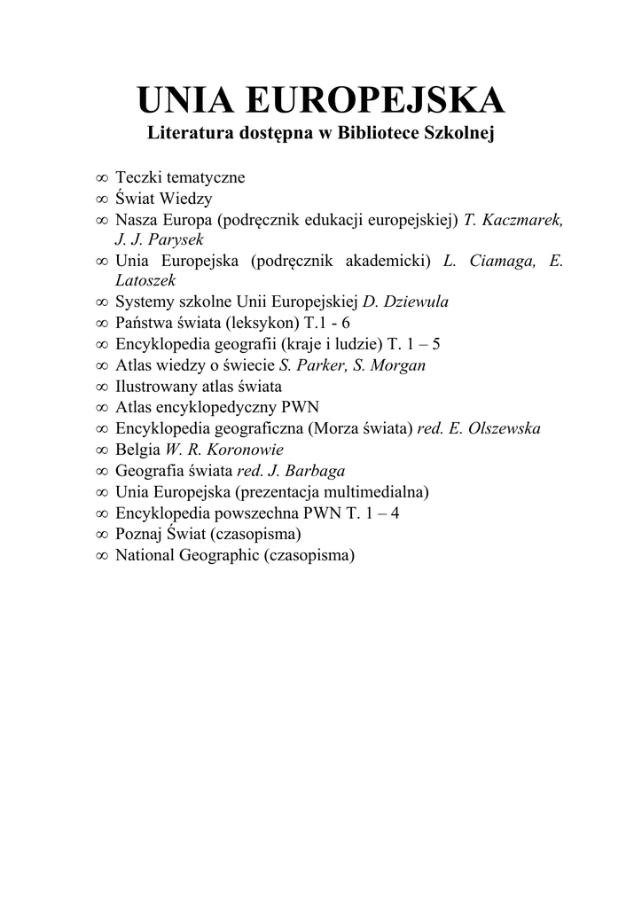 UNIA EUROPEJSKA Literatura dostępna w Bibliotece Szkolnej • Teczki tematyczne • Świat Wiedzy • Nasza Europa (podręcznik edukacji europejskiej) T. Kaczmarek, J. J. Parysek • Unia Europejska (podręcznik akademicki) L. Ciamaga, E. Latoszek • Systemy szkolne Unii Europejskiej D. Dziewula • Państwa świata (leksykon) T.1 - 6 • Encyklopedia geografii (kraje i ludzie) T. 1 – 5 • Atlas wiedzy o świecie S. Parker, S. Morgan • Ilustrowany atlas świata • Atlas encyklopedyczny PWN • Encyklopedia geograficzna (Morza świata) red. E. Olszewska • Belgia W. R. Koronowie • Geografia świata red. J. Barbaga • Unia Europejska (prezentacja multimedialna) • Encyklopedia powszechna PWN T. 1 – 4 • Poznaj Świat (czasopisma) • National Geographic (czasopisma)