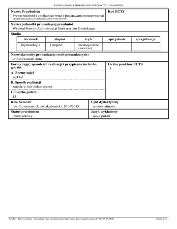 WYDZIAŁ PRAWA I ADMINISTACJI UNIWERSYTETU GDAŃSKIEGO Nazwa Przedmiotu Prawo Prawo rodzinne rodzinne ii opiekuńcze opiekuńcze wraz wraz zz podstawami podstawami postępowania; postępowania; Kod ECTS OBSZAR KSZTAŁCENIA W ZAKRESIE NAUK SPOŁECZNYCH Nazwa jednostki prowadzącej przedmiot Wydział Prawa i Administracji Uniwersytetu Gdańskiego Studia kierunek kryminologia kryminologia stopień II stopień stopień tryb niestacjonarne (zaoczne) niestacjonarne (zaoczne) Nazwisko osoby prowadzącej (osób prowadzących) dr Sylwestrzak Anna Formy godzin Formy zajęć, zajęć, sposób sposób ich ich realizacji realizacji ii przypisana przypisana im im liczba liczba godzin A. Formy zajęć wykład wykład specjalność specjalizacja Liczba punktów ECTS 3 B. Sposób realizacji zajęcia zajęcia w w sali sali dydaktycznej dydaktycznej C. Liczba godzin 15 15 Rok, Semestr rok: II, semestr: 3, rok akademicki: 2014/2015 Cykl dydaktyczny semestr zimowy Status przedmiotu obowiązkowy Język wykładowy język polski Sylabus - Prawo rodzinne i opiekuńcze wraz z podstawami postępowania, data wygenerowania: 2014.03.19 14:55:01 Strona 1 z 3 WYDZIAŁ PRAWA I ADMINISTACJI UNIWERSYTETU GDAŃSKIEGO Metody dydaktyczne wykład, wykład konwersatoryjny, wykład problemowy, wykład z prezentacją multimedialną Forma i sposób zaliczenia oraz podstawowe kryteria oceny lub wymagania egzaminacyjne A. Sposób zaliczenia egzamin B. Formy zaliczenia egzamin pisemny: dłuzsza wypowiedź pisemna (rozwiazanie problemu) C. Podstawowe kryteria Egzamin obejmuje minimum 3 pytania. Ocena obejmuje opanowanie problematyki opisanej w polu "Treści programowe" w zakresie znajomości treści normatywnej i jej wykładni, poglądów doktryny i orzecznictwa. Ocena uwzględnia również stopień opanowania języka prawniczego i logiki przeprowadzanych rozumo-wań. Kryterium oceny jest procent opanowania wymaganej wiedzy i umiejętności umiejętności z uwzględnieniem skali określonej Regulaminem Studiów UG: a) ocena bdb - powyżej 90% wymaganej wiedzy i umiejętności, b) ocena db+ - powyżej 80% wymaganej wiedzy i umiejętności, c) ocena db - powyżej 70% wymaganej wiedzy i umiejętności, d) ocena dst+ - powyżej 60% wymaganej wiedzy i umiejętności, e) ocena dst - powyżej 50 % wymaganej wiedzy i umiejętności. Określenie przedmiotów wprowadzających wraz z wymogami wstępnymi A. Wymagania formalne brak B. Wymagania wstępne brak Cele przedmiotu Zapoznanie studentów z przepisami Kodeksu rodzinnego i opiekuńczego, Kodeksu postępowania cywilnego w zakresie postępowania w sprawach rodzinnych oraz ustawy Prawo o aktach stanu cywilnego wraz z ich wyjaśnieniem oraz przedstawieniem poglądów doktryny i praktyki orzeczniczej w tym zakresie. Treści programowe 1. Zawarcie małżeństwa 2. Prawo małżeńskie majątkowe 3. Rozwiązanie małżeństwa. Separacja małżonków 4. Nazwisko członków rodziny 5. Macierzyństwo i ojcostwo 6. Władza rodzicielska 7. Przysposobienie 8. Obowiązek alimentacyjny 9. Opieka nad małoletnim i ubezwłasnowolnionym całkowicie 10. Problematyka rejestracji stanu cywilnego: zagadnienia ogólne rejestracji stanu cywilnego, trybu postępowania przy za-warciu małżeństwa oraz sporządzenia aktu urodzenia z wyróżnieniem przypadków dotyczących rejestracji urodzeń dzieci małżeńskich i pozamałżeńskich oraz przysposobionych 11. Podstawowe zagadnienia postępowania w sprawach rodzinnych Sylabus - Prawo rodzinne i opiekuńcze wraz z podstawami postępowania, data wygenerowania: 2014.03.19 14:55:01 Strona 2 z 3 WYDZIAŁ PRAWA I ADMINISTACJI UNIWERSYTETU GDAŃSKIEGO Wykaz literatury A. Literatura wymagana do ostatecznego zaliczenia zajęć (zdania egzaminu): A.1. wykorzystywana podczas zajęć T.Sokołowski, Prawo rodzinne- Zarys wykładu, Poznań, 2010 r. A.2. studiowana samodzielnie przez studenta 1. T.Sokołowski, Prawo rodzinne- Zarys wykładu, Poznań, 2010 r. 2. T.Smyczyński, Prawo rodzinne i opiekuńcze, Warszawa, 2009 r. B. Literatura uzupełniająca 1. K.Piasecki (red.), Kodeks rodzinny i opiekuńczy. Komentarz, Warszawa, 2011 r. 2. H.Dolecki, T.Sokołowski (red.), Kodeks rodzinny i opiekuńczy. Komentarz, Warszawa, 2010 r. 3. M.Andrzejewski, Ochrona praw dziecka w rodzinie dysfunkcyjnej (dziecko-rodzina-państwo), Zakamycze, 2003 r. 4. Iwona Długoszowska, Przesłanki oraz skutki ograniczenia i pozbawienia władzy rodzicielskiej, Warszawa, 2012 r. 5. E.Skowrońska-Bocian, Małżeńskie ustroje majątkowe, Warszawa, 2008 r. 6. W.Stojanowska, D.Miścicka-Śliwka, Dowód z badań DNA a inne dowody w procesach o ustalenie ojcostwa, Warszawa, 2000 r. Efekty uczenia się Wiedza Student definiuje pojęcia wchodzące w zakres treści programowych, potrafi opisać stan norma-tywny omawianych instytucji prawa rodzinnego wraz z przedstawieniem poglądów doktryny i orzecznictwa, które ich dotyczą. Umiejętności Student dokonuje prawidłowej wykładni i subsumpcji. Zdobywa podstawy przydatne do wykonywania zawodów, które w praktyce wiążą się z problematyką rodzinnoprawną (w szczególności policjant i kurator) Kompetencje społeczne (postawy) Student ma świadomość potrzeby ciągłego pogłębiania i aktualizowania wiedzy z zakresu prawa rodzinnego; jest otwarty na różnorodność poglądów w nauce prawa i orzecznictwie sądowym. Kontakt [email protected] [email protected] Sylabus - Prawo rodzinne i opiekuńcze wraz z podstawami postępowania, data wygenerowania: 2014.03.19 14:55:01 Strona 3 z 3