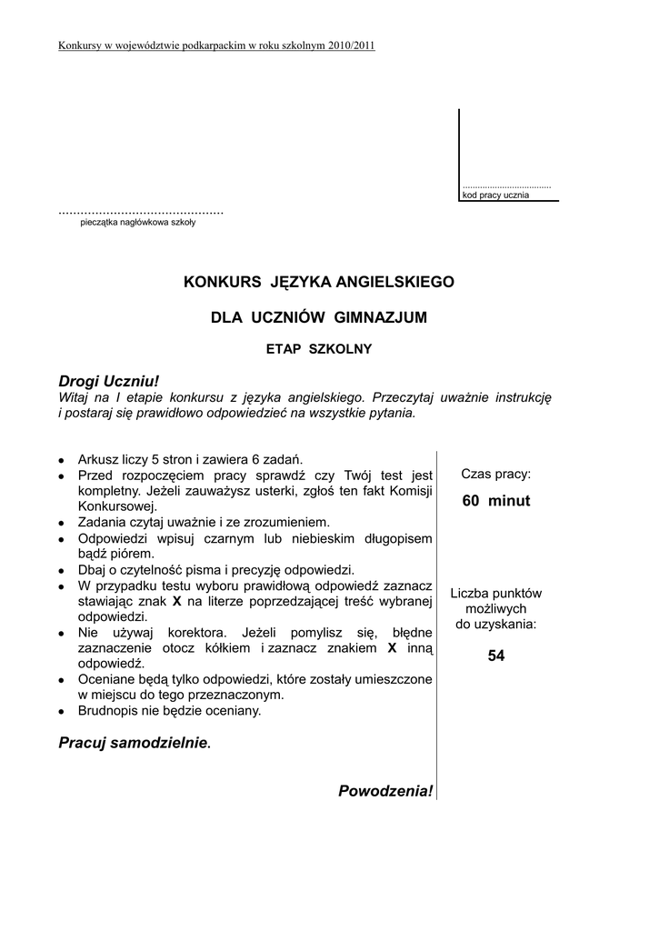 Konkursy w województwie podkarpackim w roku szkolnym 2010/2011 .................................... kod pracy ucznia ............................................. pieczątka nagłówkowa szkoły KONKURS JĘZYKA ANGIELSKIEGO DLA UCZNIÓW GIMNAZJUM ETAP SZKOLNY Drogi Uczniu! Witaj na I etapie konkursu z języka angielskiego. Przeczytaj uważnie instrukcję i postaraj się prawidłowo odpowiedzieć na wszystkie pytania. Arkusz liczy 5 stron i zawiera 6 zadań. Przed rozpoczęciem pracy sprawdź czy Twój test jest kompletny. Jeżeli zauważysz usterki, zgłoś ten fakt Komisji Konkursowej. Zadania czytaj uważnie i ze zrozumieniem. Odpowiedzi wpisuj czarnym lub niebieskim długopisem bądź piórem. Dbaj o czytelność pisma i precyzję odpowiedzi. W przypadku testu wyboru prawidłową odpowiedź zaznacz stawiając znak X na literze poprzedzającej treść wybranej odpowiedzi. Nie używaj korektora. Jeżeli pomylisz się, błędne zaznaczenie otocz kółkiem i zaznacz znakiem X inną odpowiedź. Oceniane będą tylko odpowiedzi, które zostały umieszczone w miejscu do tego przeznaczonym. Brudnopis nie będzie oceniany. Pracuj samodzielnie. Powodzenia! Czas pracy: 60 minut Liczba punktów możliwych do uzyskania: 54 Konkursy w województwie podkarpackim w roku szkolnym 2010/2011 Zadanie 1 (0-8 pkt.) Przeczytaj uważnie tekst, a następnie wybierz odpowiedź true (T)/prawda lub false (F)/fałsz. Za poprawne rozwiązanie możesz otrzymać 8 pkt. A new study has found that British people spend almost 130,000 hours in front of TV or computer screens during their lifetime. Eye health campaigners have warned this can be very bad for vision and general health. The situation is made worse because most people are unaware that their eyesight is worsening. There are often no warning signs, except for eyestrain or headaches, that the eyes are being damaged. Even worse, says the study, is the fact that ten percent of adults have never had an eye test. The study found that on average, adults spent 30.5 hours a week glued to their TV sets, while workaholics spent 35 hours focusing on their computer monitors. Sixty-three percent of computer users complained about “terrible headaches” when they leave work, while 53 percent suffered from tired eyes. Thirty percent of those questioned in the study said they regularly put up with dry, irritated and watery eyes. Iain Anderson, chairman of the Eyecare Trust, said: “It’s vital that computer users…follow a healthy eyecare regime.” 1. The shape of British people’s eyes is changing. T/F 2. Britons spend 130,000 hours of their lives looking at TV or computers. T/F 3. Most people know when there eyesight is getting worse. T/F 4. Ten million of British adults have never had an eye test. T/F 5. British people are glued to the TV sets for 30.5 hours a week. T/F 6. Ninety percent of computer users suffer from terrible headaches. T/F 7. Thirty percent of people put up with irritated and watery eyes. T/F 8. Computer users cannot do anything to protect their eyes. T/F Strona 2 z 5 Konkursy w województwie podkarpackim w roku szkolnym 2010/2011 Zadanie 2 (0-10 pkt) Przeczytaj uważnie tekst i wybierz poprawną odpowiedź A, B, C, D. Za poprawne rozwiązanie możesz otrzymać 10 pkt. SUPERHEROES A superhero is a fictional character (0).......special powers. (1)..............the first Superman story was written in the USA in 1938, superheroes have (2)........in various comic books around the world. But more recently they have (3).........better known as film characters. (4) …....superhero powers vary widely, superhuman strength and the ability to fly are common. (5) …........superheroes do not have special powers, but have (6)........other important abilities. In order to protect friends and family, a superhero's identity is normally (7).........secret, which often means superheroes have a complicated double life. (8) have been successful superheroes in countries other than the USA. Examples (9)...... Cybersix from Argentina and the heroes of AK Comics from Egypt. Japan is the only country that has created as many superhero characters as the USA. However, most Japanese superheroes are shortlived. While American entertainment companies reinvent superheroes, (10)........they will stay popular, Japanese companies frequently introduce new characters. Przykład (0) A with B for C by D on 1. A Until B Since C From D Before 2. A shown B entered C come D appeared 3. A become B returned C changed D grown 4. A Because B If C Although D So 5. A Each B Some C Another D Both 6. A made B increased C prepared D developed 7. A held B put C kept D got 8. A These B That C There D Those 9. A consist B involve C contain D include 10. A hoping B requiring C needing D asking odpowiedź -A Strona 3 z 5 Konkursy w województwie podkarpackim w roku szkolnym 2010/2011 Zadanie 3. (10 pkt) Wstaw w zdania brakujące słowa. Ich pierwsze litery są podane. Za poprawne rozwiązanie możesz uzyskać 10 pkt, po 2 punkty za każdy poprawny wyraz. 1. Ouch! My head! I have a terrible h_________________ . 2. Come on! This dog won't bite you! What's the matter? Are you f_____________ ? 3. How can you say this film is interesting? It's terribly b ____ ! 4. That's strange! One moment the light appears, then it d_____________ . 5. Why are you driving so fast? There's a s____________ limit here! Zadanie 4 (10 pkt) Ułóż pytania o podkreślone części zdań. Za poprawne rozwiązanie możesz uzyskać 10 pkt. 1. My father bought me a bicycle..................................................................................? 2. I'd like a new dress for my birthday..........................................................................? 3. Mrs Smith'a new neighbour is tall and thin...............................................................? 4. I lost my money in the morning.................................................................................? 5. Everybody is laughing because the snow i