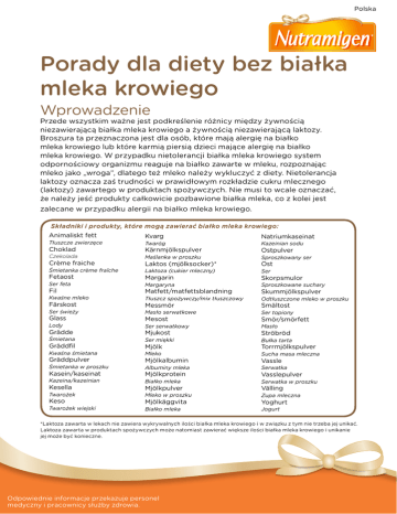 Polska Porady dla diety bez białka mleka krowiego Wprowadzenie Przede wszystkim ważne jest podkreślenie różnicy między żywnością niezawierającą białka mleka krowiego a żywnością niezawierającą laktozy. Broszura ta przeznaczona jest dla osób, które mają alergię na białko mleka krowiego lub które karmią piersią dzieci mające alergię na białko mleka krowiego. W przypadku nietolerancji białka mleka krowiego system odpornościowy organizmu reaguje na białko zawarte w mleku, rozpoznając mleko jako „wroga”, dlatego też mleko należy wykluczyć z diety. Nietolerancja laktozy oznacza zaś trudności w prawidłowym rozkładzie cukru mlecznego (laktozy) zawartego w produktach spożywczych. Nie musi to wcale oznaczać, że należy jeść produkty całkowicie pozbawione białka mleka, co z kolei jest zalecane w przypadku alergii na białko mleka krowiego. Składniki i produkty, które mogą zawierać białko mleka krowiego: Animaliskt fett Tłuszcze zwierzęce Choklad Czekolada Crème fraiche Śmietanka crème fraîche Fetaost Ser feta Fil Kwaśne mleko Färskost Ser świeży Glass Lody Grädde Śmietana Gräddfil Kwaśna śmietana Gräddpulver Śmietanka w proszku Kasein/kaseinat Kazeina/kazeinian Kesella Twarożek Keso Twarożek wiejski Kvarg Twaróg Kärnmjölkspulver Maślanka w proszku Laktos (mjölksocker)* Laktoza (cukier mleczny) Margarin Margaryna Matfett/matfettsblandning Tłuszcz spożywczy/mix tłuszczowy Messmör Masło serwatkowe Mesost Ser serwatkowy Mjukost Ser miękki Mjölk Mleko Mjölkalbumin Albuminy mleka Mjölkprotein Białko mleka Mjölkpulver Mleko w proszku Mjölkäggvita Białko mleka Natriumkaseinat Kazeinian sodu Ostpulver Sproszkowany ser Ost Ser Skorpsmulor Sproszkowane suchary Skummjölkspulver Odtłuszczone mleko w proszku Smältost Ser topiony Smör/smörfett Masło Ströbröd Bułka tarta Torrmjölkspulver Sucha masa mleczna Vassle Serwatka Vasslepulver Serwatka w proszku Välling Zupa mleczna Yoghurt Jogurt *Laktoza zawarta w lekach nie zawiera wykrywalnych ilości białka mleka krowiego i w związku z tym nie trzeba jej unikać. Laktoza zawarta w produktach spożywczych może natomiast zawierać większe ilości białka mleka krowiego i unikanie jej może być konieczne. Odpowiednie informacje przekazuje personel medyczny i pracownicy służby zdrowia. O czym jeszcze należy pamiętać: Przepisy dotyczące etykietowania SKŁAD PRODUKTÓW Zgodnie z europejskimi przepisami etykietowania produktów, w przypadku gdy w składzie danego produktu spożywczego występuje mleko lub przetwory mleczne, należy to bezwzględnie podać na opakowaniu. Wyrób w sobie nawyk KAŻDORAZOWEGO czytania składu kupowanych produktów spożywczych. Skład danego produktu może się zmienić i to, co wcześniej nie zawierało mleka, być może teraz je zawiera. Albo na odwrót. Produkty spożywcze PRZETWORY MLECZNE Z diety należy wykluczyć wszystkie rodzaje mleka oraz produktów mlecznych i należy zastąpić je innymi produktami. W sklepach spożywczych dostępnych jest wiele różnych produktów (najczęściej) bazujących na owsie, ryżu lub soi. Decydujące znaczenie dla wyboru produktów zastępczych ma zapotrzebowanie na energię i składniki odżywcze. W przypadku niemowląt i małych dzieci często potrzebne są kompletne specjalistyczne produkty zastępcze wydawane na podstawie wskazań żywieniowych. MLEKO OWCZE I KOZIE Białko znajdujące się w mleku innych zwierząt, np. w mleku owczym i kozim, jest zbliżone do białka mleka krowiego i dlatego należy go unikać. TŁUSZCZ SPOŻYWCZY Masło i margaryna z reguły zawierają mleko. W przypadku gdy w diecie zalecana jest margaryna, należy wybierać margarynę niezawierającą mleka. Czyste oleje nie zawierają mleka. CHLEB Wiele gatunków chleba nie zawiera mleka – są one zwykle wypiekane na bazie wody i oleju, pamiętaj jednak o przeczytaniu składu na etykiecie produktu. Ciastka i wypieki cukiernicze z reguły zawierają zarówno mleko, jak i margarynę lub masło. KASZA Czyste krupy nie zawierają mleka, ale np. kaszka manna i kaszka ryżowa są tradycyjne przyrządzane na mleku, natomiast kaszę owsianą i żytnią przyrządza się na wodzie. DODATKI KANAPKOWE Wszystkie rodzaje sera zawierają mleko. Czyste mięso, na przykład szynka wędzona lub gotowana, nie zawiera mleka. Natomiast półprodukty, jak np. kiełbasa lub pasztet, mogą czasem zawierać mleko. Wybierz produkt niezawierające mleka. MIĘSO I RYBY Nieprzetworzone mięso nie zawiera mleka, mleko może występować. Zawsze sprawdzaj skład takich produktów jak np. kiełbasa, kaszanka, paluszki rybne, kotlety rybne itp. OWOCE, WARZYWA I ZIEMNIAKI Produkty te w czystej formie nie zawierają mleka (także przegotowane i zakonserwowane), ale w ich przetworach, jak np. zupy warzywne w proszku czy puree ziemniaczane w proszku, zwykle mleko występuje. INNE PRODUKTY Zachowaj szczególną ostrożność w przypadku wszystkich rodzajów przetworów i półproduktów. Mleko może znajdować się tam, gdzie najmniej się go spodziewamy. Uważaj np. w przypadku kostek rosołowych, gotowych sosów/potraw, słodyczy, czekolady i chipsów. Zapotrzebowanie na energię i składniki odżywcze NIEMOWLĘTA I MAŁE DZIECI Niemowlęta i małe dzieci mają ogromne zapotrzebowanie na energię i składniki odżywcze. Bezmleczna dieta może być uboga w składniki energetyczne i odżywcze, jako że produkty mleczne odpowiadają za sporą część naszej kultury żywieniowej. Dlatego też należy dopilnować, aby dzieciom po okresie karmienia piersią zapewnić kompletne produkty zastępcze dostosowane do ich zapotrzebowania. Porusz ten temat ze swoim lekarzem lub dietetykiem. WAPNO Przetwory mleczne odpowiadają za dużą część naszego zapotrzebowania na wapno, i w zależności od tego, jakimi produktami zastępujemy przetwory mleczne, może wystąpić potrzeba suplementacji wapnia. Porozmawiaj o tym ze swoim lekarzem lub dietetykiem. www.nutra
