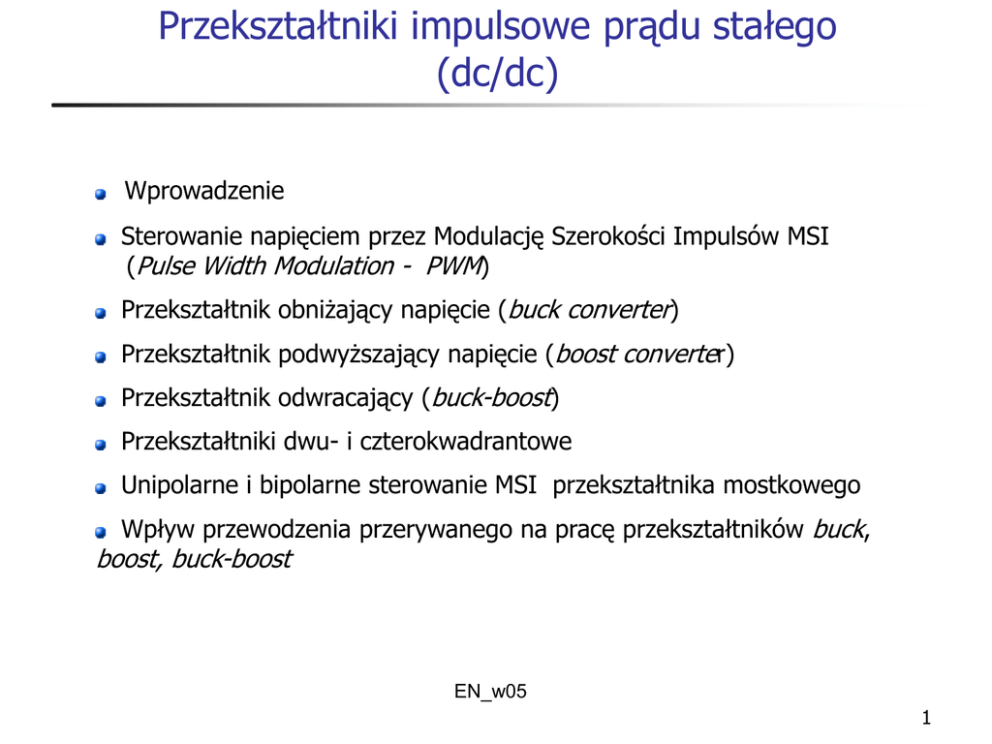 Przekształtniki impulsowe prądu stałego (dc/dc) Wprowadzenie Sterowanie napięciem przez Modulację Szerokości Impulsów MSI (Pulse Width Modulation - PWM) Przekształtnik obniżający napięcie (buck converter) Przekształtnik podwyższający napięcie (boost converter) Przekształtnik odwracający (buck-boost) Przekształtniki dwu- i czterokwadrantowe Unipolarne i bipolarne sterowanie MSI przekształtnika mostkowego Wpływ przewodzenia przerywanego na pracę przekształtników buck, boost, buck-boost EN_w05 1 Wprowadzenie do przekształtników dc/dc Główne zastosowania: Zasilacze impulsowe prądu stałego Napędy z silnikami prądu stałego Cel: regulować napięcie wyjściowe Schemat blokowy: EN_w05 2 Sterowanie wartością średnią napiecia przez MSI EN_w05 3 Realizacja sterowania MSI EN_w05 4 Przekształtnik obniżający (buck converter) Tętnienia napięcia są filtrowane dolnoprzepustowym filtrem LC Dioda jest niezbędna, aby zapewnić drogę dla prądu iL gdy nie przewodzi łącznik EN_w05 5 Napięcie wyjściowe przekształtnika Vd Vd średnie zależy liniowo od D V0 = D · Vd Częstotliwości harmoniczne są wielokrotnościami fs : fs , 2fs , 3fs , ... Filtrowanie tym skuteczniejsze im większa częstotliwość łączeń fs i im mniejsza częstotliwość graniczna (-3dB) filtru fc « fs EN_w05 6 Przebiegi i,u przy przewodzeniu ciągłym iL > 0 W stanie ustalonym: A=B (vL)śr = 0 Bilans mocy przy pominięciu strat: EN_w05 7 Przekształtnik podwyższający napiecie (boost) Takie same elementy, inaczej połączone Napięcie wyjściowe nie może być mniejsze od wejściowego EN_w05 8 Przebiegi w stanie ustalonym przy przewodzeniu ciągłym całka napięcia na indukcyjności: Bilans mocy: EN_w05 9 Ograniczenia w podwyższaniu napięcia Dławik i kondensator nie są idealne (straty) Spadki napięcia stają się istotne przy dużych prądach i dużych D Napięcie wyjściowe niedokładnie odpowiada teoretycznemu D musi być ograniczone: 0 .. 0.8 EN_w05 10 Przekształtnik buck-boost (obniżająco-odwracający) Napięcie wyjściowe może być niższe lub wyższe od wejściowego Napięcie wyjściowe ma przeciwny znak niż wejściowe EN_w05 11 Przebiegi w stanie ustalonym przy przewodzeniu ciągłym EN_w05 12 Przekształtniki dwukwadrantowe (półmostkowe) Przełączanie między dodatnim a ujemnym biegunem napięcia Ud Średnie napięcie wyjściowe dodatnie, prąd dodatni lub ujemny (I i II ćwiartka) Stanowią jedno ramię (leg) w przekształtnikach złożonych dc/dc lub dc/ac EN_w05 13 Przekształtnik czterokwadrantowy o jednym ramieniu Obciążenie włączone między biegun wyjściowy przekształtnika, a punkt środkowy zasilania Zarówno prąd jak i napięcie wyjściowe mogą być dodatnie lub ujemne Zastosowania: zasilacze impulsowe przekształtniki dc/ac EN_w05 14 Przekształtnik czterokwadrantowy mostkowy Napięcie wyjsciowe może być regulowane w zakresie napięcie zasilające EN_w05 15 Przekształtnik czterokwadrantowy mostkowy Zastosowania: Napędy prądu stałego Falowniki dc/ac Zasilacze impulsowe z izolacją we/wy EN_w05 16 Napięcia wyjściowe biegunów przekształtnika Napięcia (chwilowe) w punktach A, B oraz ich różnica zależą od napięcia zasilającego i sygnałów sterujących, a są niezależne od prądu obciążenia Napięcia średnie zależą od względnych czasów wysterowania łączników TA+, TB+ (łączniki TA-, TB- są sterowane komplementarnie) EN_w05 17 Sterowanie MSI w przekształtnikach mostkowych Dwie metody sterowania MSI: Bipolarna (dwubiegunowa) MSI : pary łączników (TA+ , TB-) oraz (TA- , TB+) są wysterowywane równocześnie Unipolarna (jednobiegunowa) MSI : między wysterowaniem TA+ a TB- oraz między TA- a TB+ jest 180o przesuniecia fazowego Unipolarna MSI jest zdecydowanie lepsza, choć jej realizacja jest nieco bardziej skomplikowana EN_w05 18 Porównanie MSI unipolarnej i bipolarnej Wartość skuteczna składowej zmiennej (wszystkich harmonicznych łącznie) jest mniejsza dla MSI unipolarnej, zwłaszcza dla średnich wartości napięcia wyjściowego bliskich zeru Częstotliwość podstawowej harmonicznej w napieciu wyjsciowym jest dla modulacji unipolarnej dwukrotnie wyższa niż częstotliwość przełaczeń zaworów fs , a dla bipolarnej równa fs EN_w05 19 Sterowanie w bipolarnej MSI TA+ i TBprzewodza, gdy sygnał sterujący vcontrol jest większy niż trójkątny sygnał odniesienia Napięcie wyjściowe przełącza się od wartości +Vd do -Vd Przejście prądu przez zero nie wywołuje żadnych komplikacji EN_w05 20 Sterowanie MSI - wzory Napięcie trójkątne w przedziale ¼ okresu Ts: Względny czas wysterowania TA+: Średnie napięcie wyjściowe ... ... liniowo zależy od sygnału sterującego EN_w05 21 Sterowanie unipolarne MSI Dwa oddzielne napięcia sterujące dla łączników TA i TB Tak jak poprzednio: EN_w05 22 Przewodzenie przerywane W przekształtnikach dwu- i czterokwadrantowych przewodzenie przerywane praktycznie nie wystepuje W prostych przekształtnikach (buck, boost, buck-boost), przy niewielkich obciążeniach prąd w indukcyjności może w pewnych przedziałach spadać do zera – mówimy wtedy o przewodzeniu przerywanym Dla przewodzenia przerywanego znacznie komplikują się wzory na napięcie wyjsciowe; napięcie to staje sie zależne od prądu i parametrów obwodu Analizę pracy przy przewodzeniu przerywanym najlepiej przeprowadzic symulacyjnie, lub skorzystać z iPES EN_w05 23 Praca na granicy przewodzenia ciągłego i przerywanego w przekształtniku obniżającym (buck) EN_w05 24 Przebiegi w stanie ustalonym przy przewodzeniu przerywanym w przekształtniku obniżającym (buck) EN_w05 25 Charakterystyki V(I) dla przekształtnika obniżającego (buck) z uwzględnieniem strefy przewodzenia przerywanego EN_w05 26 Charakterystyki D(I) dla przekształtnika obniżającego (buck) z uwzględnieniem strefy przewodzenia przerywanego EN_w05 27 Przekształtnik obniżający (buck) – ćwiczenia iPES EN_w05 28 Przekształ
