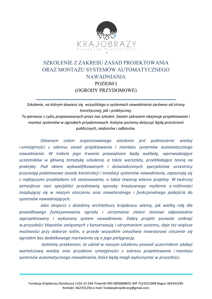 SZKOLENIE Z ZAKRESU ZASAD PROJEKTOWANIA ORAZ MONTAŻU SYSTEMÓW AUTOMATYCZNEGO NAWADNIANIA POZIOM I (OGRODY PRZYDOMOWE) Szkolenie, na którym dowiesz się wszystkiego o systemach nawadniania zarówno od strony teoretycznej, jak i praktycznej. To pierwsze z cyklu proponowanych przez nas szkoleń. Swoim zakresem obejmuje projektowanie i montaż systemów w ogrodach przydomowych. Kolejne poziomy dotyczyć będą przestrzeni publicznych, nadzorów i odbiorów. Głównym celem organizowanego szkolenia jest podniesienie wiedzy i umiejętności z zakresu zasad projektowania i montażu systemów automatycznego nawadniania. W trakcie jego trwania prowadzone będą wykłady, wprowadzające uczestników w główną tematykę szkolenia, a także warsztaty, przekładające teorię na praktykę. Pod okiem wykwalifikowanych i doświadczonych specjalistów uczestnicy przyswoją podstawowe zasady konstrukcji i instalacji systemów nawadniania, zapoznają się z najlepszymi przykładami ich zastosowania, a także stworzą własne projekty. W twórczej atmosferze nasi specjaliści przedstawią sposoby kreatywnego myślenia o roślinności znajdującej się w naszym otoczeniu oraz nowatorskiego i funkcjonalnego podejścia do systemów nawadniających. Jako eksperci z dziedziny architektury krajobrazu wiemy, jak wielką rolę dla prawidłowego funkcjonowania ogrodu i utrzymania zieleni stanowi odpowiednio zaprojektowany i wykonany system nawadniania. Dobry projekt pozwala uniknąć w przyszłości kłopotów związanych z konserwacją i utrzymaniem systemu, daje też większe możliwości przy doborze roślin, a przede wszystkim umożliwia inwestorowi cieszenie się ogrodem bez dodatkowego martwienia się o jego pielęgnację. Jesteśmy przekonani, że udział w naszym szkoleniu pozwoli uczestnikom zdobyć wartościową wiedzę oraz przydatne umiejętności z zakresu projektowania i montażu systemów automatycznego nawadniania, które będą mogli wykorzystać w przyszłości. Fundacja Krajobrazy Dorohucza 115A 21-044 Trawniki KRS 0000608031 NIP 7123311008 Regon 364141595 Kontakt: 662701256 e-mail: [email protected] Dziś współczesne technologie pozwalają na projektowanie inteligentnych systemów, umożliwiających dostarczenie odpowiedniej ilości wody do roślin w zależności od gatunku, miejsca nasadzenia, nasłonecznienia etc. Dobra znajomość tych możliwości w znacznym stopniu podnosi konkurencyjność firmy i jej pracowników na rynku. Co wyróżnia nasze szkolenie? Większość szkoleń zaczyna się od teorii, dopiero w kolejnej części kursanci przechodzą do praktyki. My robimy na odwrót! Dlaczego? Bo uważamy, że wiedza przyswajana jest dużo lepiej, gdy wiesz, o czym słuchasz! Kursant nie musi wyobrażać sobie urządzeń, wie dokładnie jak wygląda system nawadniający i potrafi go samodzielnie zmontować zanim przystąpi do nauki projektowania. Dzięki temu w trakcie przygotowywania projektu potrafi wyobrazić sobie działanie i funkcjonalność systemu, a co za tym idzie w 100% efektywny sposób korzystać z podpowiedzi i wskazówek trenera. Kto może uczestniczyć w szkoleniu? Na szkolenie zaproszeni są: ˗ projektanci terenów zieleni ˗ przyszli instalatorzy ˗ Inspektorzy Nadzoru Terenów Zieleni ˗ rolnicy ˗ ogrodnicy ˗ studenci architektury krajobrazu i ogrodnictwa ˗ każdy, kto chciałby posiadać wiedzę z zakresu systemów automatycznego nawadniania Co zapewniamy? W ramach szkolenia zapewniamy: ˗ profesjonalną kadrę trenerską ˗ szkolenie w formie warsztatów/wykładów ˗ materiały szkoleniowe ˗ serwis kawowy Wykładowcy Wojciech Januszczyk architekt krajobrazu, Inspektor Nadzoru Terenu Zieleni, , pracownik Instytutu Architektury Krajobrazu KUL, współzałożyciel i współwłaściciel GARDEN CONCEPT Architekci Krajobrazu Fundacja Krajobrazy Dorohucza 115A 21-044 Trawniki KRS 0000608031 NIP 7123311008 Regon 364141595 Kontakt: 662701256 e-mail: [email protected] Rafał Kochanowicz mgr inż. architektury krajobrazu, projektant systemów nawadniających z wieloletnim doświadczeniem w branży Waldemar Kozak 20 lat pracy zawodowej w budownictwie ogrodowym oraz wieloletnia praktyka przy montażu systemów automatycznego nawadniania Kiedy i gdzie? ˗ Miejsce: Lublin ˗ Termin: 23-24.07.2016 r. Ze względów organizacyjnych prosimy obowiązkowo o potwierdzenie udziału w szkoleniu do dnia 15 lipca 2016 roku na adres e-mail: [email protected] szczegóły: www.facebook.com/fundacjakrajobrazy/?fref=ts Inwestycja - Koszt szkolenia - 600 zł Studenci - 500 zł Członkowie SAK, OSTO, SPAK, ZSzP, - 500 zł (z potwierdzeniem opłaconej składki za rok 2016) W tej cenie zyskujesz: - Dwudniowy warsztat, w sumie 16 godzin zajęć teoretycznych i praktycznych - Materiały szkoleniowe i warsztatowe - Certyfikat nabytych umiejętności Fundacja Krajobrazy Dorohucza 115A 21-044 Trawniki KRS 0000608031 NIP 7123311008 Regon 364141595 Kontakt: 662701256 e-mail: [email protected] Kontakt Urszula Piłat tel.: 662-701-256 e-mail: [email protected] Program szkolenia I dzień szkolenia – 8 godzin PRAKTYKA WYKONAWCZA 1. Prowadzący: Waldemar Kozak Zakładanie i montaż systemu nawadniającego inwentaryzacja terenu przygotowanie harmonogramu prac etapy wykonywania prac: - wykopy wraz z instalacją orurowania, - montaż zraszaczy, linii kroplujących, elektrozaworów, programatorów i sterowników, - uruchomienie i serwisowanie systemu Przerwa kawowa: 13:00 – 14:00 W ramach szkolenia kursanci będą wykonywać montaż instalacji systemu automatycznego nawadniania. II dzień szkolenia – 8 godzin PRAKTYKA PROJEKTOWA 1. Wykładowca: Rafał Kochanowicz Wprowadzenie – techniki nawadniania Podstawowe elementy systemu nawadniania Dane wyjściowe – plan ogrodu, źródło wody, zapotrzebowanie roślin na wodę Zasady rozmieszczania urządzeń zraszających Podział na sekcje, lokalizacja elektrozaworów, sterownika i czujnika deszczu Dobór rurociągów zasilających oraz wyliczenia strat ci