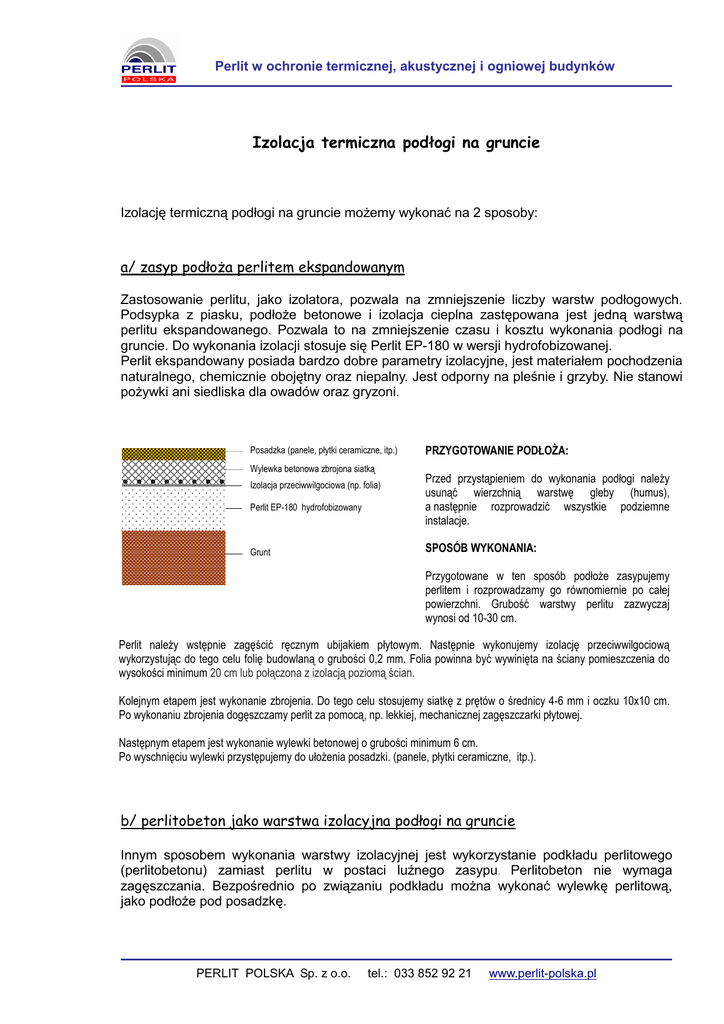 Perlit w ochronie termicznej, akustycznej i ogniowej budynków Izolacja termiczna podłogi na gruncie Izolację termiczną podłogi na gruncie moŜemy wykonać na 2 sposoby: a/ zasyp podłoŜa perlitem ekspandowanym Zastosowanie perlitu, jako izolatora, pozwala na zmniejszenie liczby warstw podłogowych. Podsypka z piasku, podłoŜe betonowe i izolacja cieplna zastępowana jest jedną warstwą perlitu ekspandowanego. Pozwala to na zmniejszenie czasu i kosztu wykonania podłogi na gruncie. Do wykonania izolacji stosuje się Perlit EP-180 w wersji hydrofobizowanej. Perlit ekspandowany posiada bardzo dobre parametry izolacyjne, jest materiałem pochodzenia naturalnego, chemicznie obojętny oraz niepalny. Jest odporny na pleśnie i grzyby. Nie stanowi poŜywki ani siedliska dla owadów oraz gryzoni. Posadzka (panele, płytki ceramiczne, itp.) Wylewka betonowa zbrojona siatką - perlitobeton Izolacja przeciwwilgociowa (np. folia) Perlit EP-180 hydrofobizowany Grunt PRZYGOTOWANIE PODŁOśA: Przed przystąpieniem do wykonania podłogi naleŜy usunąć wierzchnią warstwę gleby (humus), a następnie rozprowadzić wszystkie podziemne instalacje. SPOSÓB WYKONANIA: Przygotowane w ten sposób podłoŜe zasypujemy perlitem i rozprowadzamy go równomiernie po całej powierzchni. Grubość warstwy perlitu zazwyczaj wynosi od 10-30 cm. Perlit naleŜy wstępnie zagęścić ręcznym ubijakiem płytowym. Następnie wykonujemy izolację przeciwwilgociową wykorzystując do tego celu folię budowlaną o grubości 0,2 mm. Folia powinna być wywinięta na ściany pomieszczenia do wysokości minimum 20 cm lub połączona z izolacją poziomą ścian. Kolejnym etapem jest wykonanie zbrojenia. Do tego celu stosujemy siatkę z prętów o średnicy 4-6 mm i oczku 10x10 cm. Po wykonaniu zbrojenia dogęszczamy perlit za pomocą, np. lekkiej, mechanicznej zagęszczarki płytowej. Następnym etapem jest wykonanie wylewki betonowej o grubości minimum 6 cm. Po wyschnięciu wylewki przystępujemy do ułoŜenia posadzki. (panele, płytki ceramiczne, itp.). b/ perlitobeton jako warstwa izolacyjna podłogi na gruncie Innym sposobem wykonania warstwy izolacyjnej jest wykorzystanie podkładu perlitowego (perlitobetonu) zamiast perlitu w postaci luźnego zasypu. Perlitobeton nie wymaga zagęszczania. Bezpośrednio po związaniu podkładu moŜna wykonać wylewkę perlitową, jako podłoŜe pod posadzkę. PERLIT POLSKA Sp. z o.o. tel.: 033 852 92 21 www.perlit-polska.pl Perlit w ochronie termicznej, akustycznej i ogniowej budynków Posadzka (panele, płytki ceramiczne, itp.) Wylewka perlitowa - PTB 600 Podkład perlitowy - PTB 300 Izolacja przeciwwilgociowa (np. folia) Piasek ostry zagęszczony Grunt RECEPTURY [l] [l] [kg] Podkład perlitowy PTB 300 125 19 Wylewka perlitowa PTB 600 62,5 62,5 35 [g] 50 - [g] - 50 [l] 20-23 27-30 [W/mK] 0,07 0,14 Wytrzymałość na ściskanie [MPa] 1,3 - 1,5 5,5 - 6,0 Masa objętościowa [kg/m3] 300 600 Jednostka mary Składnik Perlit EP-180 Perlit EP-150 Cement 32,5 R Premix - podkład perlitowy Premix - wylewka perlitowa Woda Współczynnik przewodzenia ciepła λ PRZYGOTOWANIE PODŁOśA: Przed przystąpieniem do wykonania podłogi naleŜy usunąć wierzchnią warstwę gleby (humus), a następnie ułoŜyć stabilizującą warstwę piasku o grubości 5-15 cm. SPOSÓB WYKONANIA: Po zagęszczeniu piasku wykonujemy izolację przeciwwilgociową wykorzystując do tego celu, np. folię budowlaną o grubości 0,2 mm. Folia powinna być wywinięta na ściany do wysokości minimum 10 cm lub połączona z izolacją poziomą ścian. Przed przystąpieniem do wykonania izolacji termicznej konieczne jest ułoŜenie wzdłuŜ wszystkich ścian pasków dylatacyjnych, np. ze styropianu lub przymocować do ściany taśmę elastyczną. Ich zadaniem będzie oddzielenie podkładu oraz wylewki od stałych elementów konstrukcji budynku, co zapobiegnie pękaniu wylewki i pozwoli na jej swobodne rozszerzanie się. Taśma lub paski styropianu powinny nachodzić na powierzchnie boczne ściany do wysokości wylewki. Na tak przygotowanym podłoŜu moŜemy wykonać izolację termiczną podłogi za pomocą perlitobetonów. Grubość warstwy ociepleniowej (PTB 300 + PTB 600) wynosi zazwyczaj od 15-25 cm. W pierwszym etapie wykonujemy podkład perlitowy. Kolejnym etapem jest wykonanie wylewki perlitowej. MIESZANIE: Zarówno podkład, jak i wylewkę perlitową moŜna mieszać w betoniarce lub za pomocą mieszadła koszykowego. Poszczególne składniki naleŜy dodawać w kolejności: woda - premiks - cement - perlit Zaleca się wstępne wymieszanie premiksu oraz cementu wraz z wodą za pomocą mieszadła koszykowego. Konsystencja powinna być spieniona. Tak przygotowaną mieszankę dozujemy do betoniarki i dodajemy perlit. Czas mieszania nie powinien przekraczać 4-5 minut. Konsystencja gotowego perlitobetonu: PTB 300 - półmokra (sypka wilgotna masa) PTB 600 - gęstoplastyczna masa W celu ograniczenia moŜliwości powstania rys skurczowych zaleca się zastosowanie zbrojenia rozproszonego wylewki, poprzez dodanie do wylewki włókien polipropylenowych (długość włókien: 6-12 mm). Poprawę własności aplikacyjnych wylewki uzyskuje się poprzez dodanie plastyfikatora do betonu. Włókien ani plastyfikatora nie stosuje się do podkładu pod wylewkę. WYDAJNOŚĆ: 1 m3 perlitu = 0,95 - 1,00 m3 podkładu 1 m3 perlitu = 0,80 - 0,85 m3 wylewki SPOSÓB UśYCIA: UłoŜenie wylewki powinno być wykonane zgodnie ze sztuką budowlaną, tak jak w przypadku tradycyjnych wylewek betonowych. Minimalna grubość wylewki 4-5 cm. TEMPERATURA STOSOWANIA: Temperatura podłoŜa i otoczenia od + 5ºC do + 30ºC. PERLIT POLSKA Sp. z o.o. tel.: 033 852 92 21 www.perlit-polska.pl