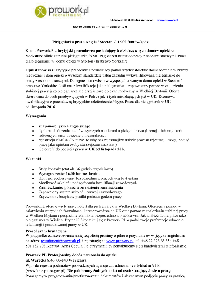 Ul. Smolna 38/8, 00-375 Warszawa www.prowork.pl tel:+48(22)323 63 35/ fax: +48(22)323 6336 Pielęgniarka praca Anglia / Steeton / 16.00 funtów/godz. Klient Prowork.PL, brytyjski pracodawca posiadający 6 ekskluzywnych domów opieki w Yorkshire pilnie zatrudni pielęgniarkę /NMC registered nurse do pracy z osobami starszymi. Praca dla pielęgniarki w domu opieki w Steeton / hrabstwo Yorkshire. Opis stanowiska: Brytyjski pracodawca posiadający ponad trzydziestoletnie doświadczenie w branży medycznej i dom opieki o wysokim standardzie usług zatrudni wykwalifikowaną pielęgniarkę do pracy z osobami starszymi. Dostępne stanowisko w wyspecjalizowanym domu opieki w Steeton / hrabstwo Yorkshire. Jeśli masz kwalifikacje jako pielęgniarka – zapewniamy pomoc w znalezieniu stabilnej pracy jako pielęgniarka lub przejściowo opiekun medyczny w Wielkiej Brytanii. Oferta skierowana do osób przebywających w Polsce jak i tych mieszkających już w UK. Rozmowa kwalifikacyjna z pracodawcą brytyjskim telefonicznie /skype. Praca dla pielęgniarek w UK od listopada 2016. Wymagania znajomość języka angielskiego dyplom ukończenia studiów wyższych na kierunku pielęgniarstwa (licencjat lub magister) referencje i zaświadczenie o niekaralności rejestracja NMC/RGN nurse (osoby bez rejestracji/w trakcie procesu rejestracji mogą podjąć pracę jako opiekun osoby starszej/care assistant ). Gotowość do podjęcia pracy w UK od listopada 2016 Warunki Stały kontrakt (etat ok. 36 godzin tygodniowo). Wynagrodzenie: 16.00 funtów brutto Kontrakt podpisywany bezpośrednio z pracodawcą brytyjskim Możliwość szkoleń i podwyższania kwalifikacji zawodowych Zamieszkanie: pomoc w znalezieniu zamieszkania Zapewniony system szkoleń i rozwoju zawodowego Zapewnione bezpłatne posiłki podczas godzin pracy Prowork.PL oferuje wiele innych ofert dla pielęgniarek w Wielkiej Brytanii. Oferujemy pomoc w załatwieniu wszystkich formalności i przeprowadzce do UK oraz pomoc w znalezieniu stabilnej pracy w Wielkiej Brytanii i podpisanie kontraktu bezpośrednio z pracodawcą. Jak znaleźć dobrą pracę jako pielęgniarka w Wielkiej Brytanii? Skontaktuj się z Prowork.PL o podaj swoje preferencje odnośnie lokalizacji i poszukiwanej pracy w UK. Procedura rekrutacyjna W przypadku zainteresowania niniejszą ofertą prosimy o pilne o przysłanie cv w języku angielskim na adres: [email protected] i rejestrację na www.prowork.pl, tel. +48 22 323 63 35; +48 501 182 708, kontakt: Anna Cebula. Po otrzymaniu cv kontaktujemy się z kandydatami telefonicznie. Prowork.PL Profesjonalny dobór personelu do opieki ul. Warecka 8/46, 00-040 Warszawa Wpis do rejestru podmiotów prowadzących agencje zatrudnienia - certyfikat nr 9116 (www.kraz.praca.gov.pl). Nie pobieramy żadnych opłat od osób starających się o pracę. Pomagamy w przygotowaniu/przetłumaczeniu dokumentów i skutecznym podjęciu pracy za granicą.