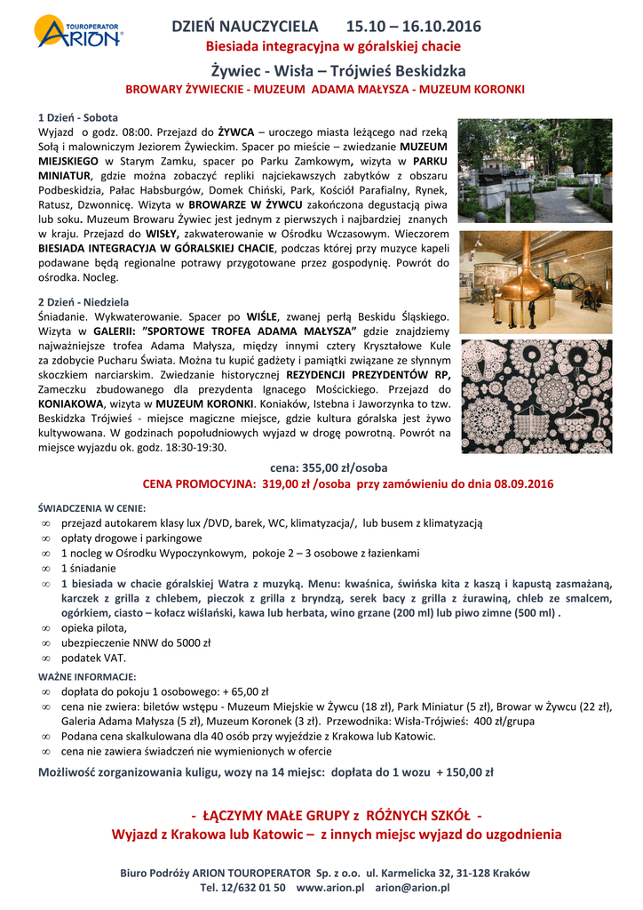DZIEŃ NAUCZYCIELA 15.10 – 16.10.2016 Biesiada integracyjna w góralskiej chacie Żywiec - Wisła – Trójwieś Beskidzka BROWARY ŻYWIECKIE - MUZEUM ADAMA MAŁYSZA - MUZEUM KORONKI 1 Dzień - Sobota Wyjazd o godz. 08:00. Przejazd do ŻYWCA – uroczego miasta leżącego nad rzeką Sołą i malowniczym Jeziorem Żywieckim. Spacer po mieście – zwiedzanie MUZEUM MIEJSKIEGO w Starym Zamku, spacer po Parku Zamkowym, wizyta w PARKU MINIATUR, gdzie można zobaczyć repliki najciekawszych zabytków z obszaru Podbeskidzia, Pałac Habsburgów, Domek Chiński, Park, Kościół Parafialny, Rynek, Ratusz, Dzwonnicę. Wizyta w BROWARZE W ŻYWCU zakończona degustacją piwa lub soku. Muzeum Browaru Żywiec jest jednym z pierwszych i najbardziej znanych w kraju. Przejazd do WISŁY, zakwaterowanie w Ośrodku Wczasowym. Wieczorem BIESIADA INTEGRACYJA W GÓRALSKIEJ CHACIE, podczas której przy muzyce kapeli podawane będą regionalne potrawy przygotowane przez gospodynię. Powrót do ośrodka. Nocleg. 2 Dzień - Niedziela Śniadanie. Wykwaterowanie. Spacer po WIŚLE, zwanej perłą Beskidu Śląskiego. Wizyta w GALERII: ”SPORTOWE TROFEA ADAMA MAŁYSZA” gdzie znajdziemy najważniejsze trofea Adama Małysza, między innymi cztery Kryształowe Kule za zdobycie Pucharu Świata. Można tu kupić gadżety i pamiątki związane ze słynnym skoczkiem narciarskim. Zwiedzanie historycznej REZYDENCJI PREZYDENTÓW RP, Zameczku zbudowanego dla prezydenta Ignacego Mościckiego. Przejazd do KONIAKOWA, wizyta w MUZEUM KORONKI. Koniaków, Istebna i Jaworzynka to tzw. Beskidzka Trójwieś - miejsce magiczne miejsce, gdzie kultura góralska jest żywo kultywowana. W godzinach popołudniowych wyjazd w drogę powrotną. Powrót na miejsce wyjazdu ok. godz. 18:30-19:30. cena: 355,00 zł/osoba CENA PROMOCYJNA: 319,00 zł /osoba przy zamówieniu do dnia 08.09.2016 ŚWIADCZENIA W CENIE: • • • • • • • • przejazd autokarem klasy lux /DVD, barek, WC, klimatyzacja/, lub busem z klimatyzacją opłaty drogowe i parkingowe 1 nocleg w Ośrodku Wypoczynkowym, pokoje 2 – 3 osobowe z łazienkami 1 śniadanie 1 biesiada w chacie góralskiej Watra z muzyką. Menu: kwaśnica, świńska kita z kaszą i kapustą zasmażaną, karczek z grilla z chlebem, pieczok z grilla z bryndzą, serek bacy z grilla z żurawiną, chleb ze smalcem, ogórkiem, ciasto – kołacz wiślański, kawa lub herbata, wino grzane (200 ml) lub piwo zimne (500 ml) . opieka pilota, ubezpieczenie NNW do 5000 zł podatek VAT. WAŻNE INFORMACJE: • • • • dopłata do pokoju 1 osobowego: + 65,00 zł cena nie zwiera: biletów wstępu - Muzeum Miejskie w Żywcu (18 zł), Park Miniatur (5 zł), Browar w Żywcu (22 zł), Galeria Adama Małysza (5 zł), Muzeum Koronek (3 zł). Przewodnika: Wisła-Trójwieś: 400 zł/grupa Podana cena skalkulowana dla 40 osób przy wyjeździe z Krakowa lub Katowic. cena nie zawiera świadczeń nie wymienionych w ofercie Możliwość zorganizowania kuligu, wozy na 14 miejsc: dopłata do 1 wozu + 150,00 zł - ŁĄCZYMY MAŁE GRUPY z RÓŻNYCH SZKÓŁ Wyjazd z Krakowa lub Katowic – z innych miejsc wyjazd do uzgodnienia Biuro Podróży ARION TOUROPERATOR Sp. z o.o. ul. Karmelicka 32, 31-128 Kraków Tel. 12/632 01 50 www.arion.pl [email protected]