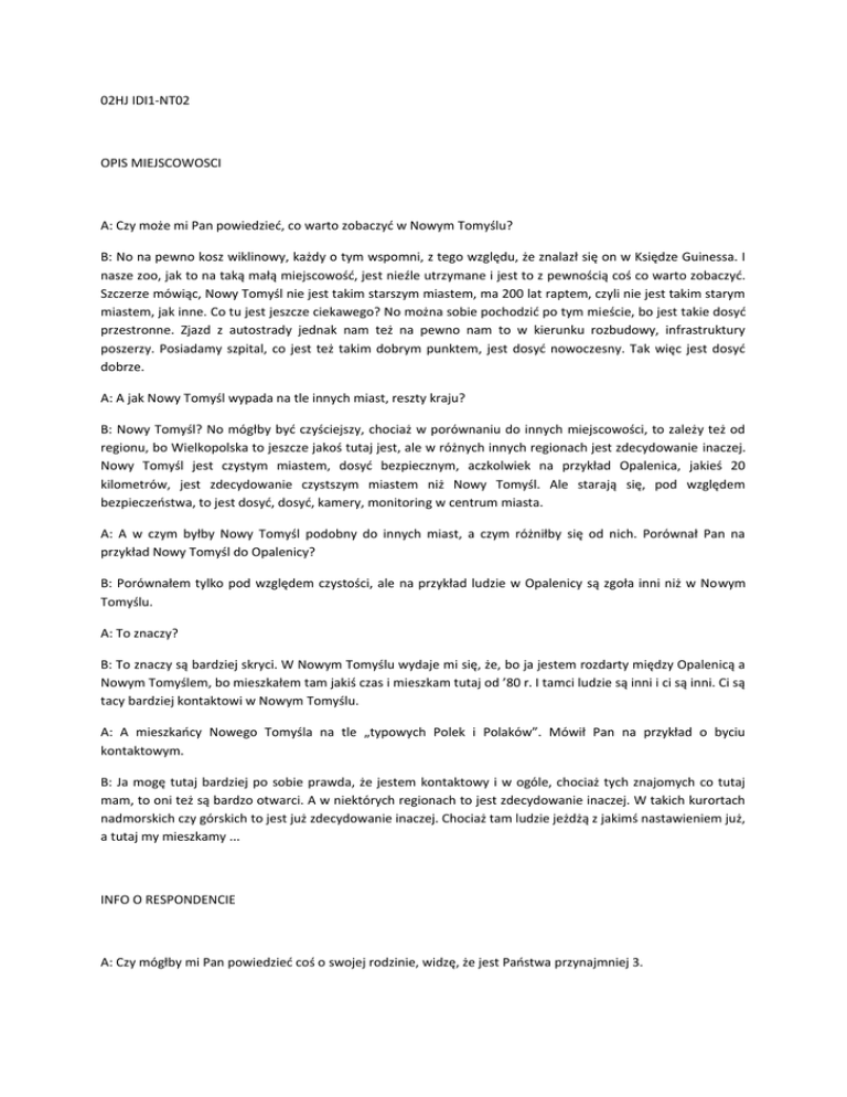 02HJ IDI1-NT02 OPIS MIEJSCOWOSCI A: Czy może mi Pan powiedzieć, co warto zobaczyć w Nowym Tomyślu? B: No na pewno kosz wiklinowy, każdy o tym wspomni, z tego względu, że znalazł się on w Księdze Guinessa. I nasze zoo, jak to na taką małą miejscowość, jest nieźle utrzymane i jest to z pewnością coś co warto zobaczyć. Szczerze mówiąc, Nowy Tomyśl nie jest takim starszym miastem, ma 200 lat raptem, czyli nie jest takim starym miastem, jak inne. Co tu jest jeszcze ciekawego? No można sobie pochodzić po tym mieście, bo jest takie dosyć przestronne. Zjazd z autostrady jednak nam też na pewno nam to w kierunku rozbudowy, infrastruktury poszerzy. Posiadamy szpital, co jest też takim dobrym punktem, jest dosyć nowoczesny. Tak więc jest dosyć dobrze. A: A jak Nowy Tomyśl wypada na tle innych miast, reszty kraju? B: Nowy Tomyśl? No mógłby być czyściejszy, chociaż w porównaniu do innych miejscowości, to zależy też od regionu, bo Wielkopolska to jeszcze jakoś tutaj jest, ale w różnych innych regionach jest zdecydowanie inaczej. Nowy Tomyśl jest czystym miastem, dosyć bezpiecznym, aczkolwiek na przykład Opalenica, jakieś 20 kilometrów, jest zdecydowanie czystszym miastem niż Nowy Tomyśl. Ale starają się, pod względem bezpieczeństwa, to jest dosyć, dosyć, kamery, monitoring w centrum miasta. A: A w czym byłby Nowy Tomyśl podobny do innych miast, a czym różniłby się od nich. Porównał Pan na przykład Nowy Tomyśl do Opalenicy? B: Porównałem tylko pod względem czystości, ale na przykład ludzie w Opalenicy są zgoła inni niż w Nowym Tomyślu. A: To znaczy? B: To znaczy są bardziej skryci. W Nowym Tomyślu wydaje mi się, że, bo ja jestem rozdarty między Opalenicą a Nowym Tomyślem, bo mieszkałem tam jakiś czas i mieszkam tutaj od ’80 r. I tamci ludzie są inni i ci są inni. Ci są tacy bardziej kontaktowi w Nowym Tomyślu. A: A mieszkańcy Nowego Tomyśla na tle „typowych Polek i Polaków”. Mówił Pan na przykład o byciu kontaktowym. B: Ja mogę tutaj bardziej po sobie prawda, że jestem kontaktowy i w ogóle, chociaż tych znajomych co tutaj mam, to oni też są bardzo otwarci. A w niektórych regionach to jest zdecydowanie inaczej. W takich kurortach nadmorskich czy górskich to jest już zdecydowanie inaczej. Chociaż tam ludzie jeżdżą z jakimś nastawieniem już, a tutaj my mieszkamy ... INFO O RESPONDENCIE A: Czy mógłby mi Pan powiedzieć coś o swojej rodzinie, widzę, że jest Państwa przynajmniej 3. B: Jeszcze jest jeden członek rodziny. Jest nas czwórka. Żona nie pracuje, odpoczywa sobie, dzieci uczą się, a ja pracuję sobie. A: A mógłby Pan powiedzieć czym się Pan zajmuje? B: Jestem właścicielem firmy. A: W jakiej branży? B: Technika sanitarna i grzewcza. A: A dzieci są... B: Moje A: Ile mają lat? B: 7 i 10 lat. MAPA STRUKTURA ISTOTNOSCI B: Dosyć to jest takie, powiedzmy, że chwytałoby to.... [komentarz przy czytaniu celów HJM] Niektóre mam już tutaj plany zrealizowane, np. posiadanie pracy to jest bardzo ważne, ale ja to na już inaczej patrzę, z drugiej strony ja nigdy nie pracowałem u nikogo... Powiedzmy, że to jest tutaj na równym poziomie [respondent nakleja cele nad i pod kropką, w równej odległości HJM]... B: A te są dla mnie już mniej ważne [cele, które na mapie są wyraźnie oddzielone od innych HJM]... Mówią, że władza, to władza to przekleństwo, chociaż myślę, że jak ktoś ma tutaj te rzeczy, to jakąś władzę już powinien posiadać .... ZMIANY W STRUKTURZE ISTOTNOSCI B: Tak, było na pewno coś innego. Jeżeli się cofnąć, na samym początku, to pierwsze było na pewno poszerzanie swojej wiedzy i kwalifikacji. Jeżeli jeszcze nie miałem rodziny, to było na pierwszym miejscu .... tak bym tutaj porobił 1, 2, 3 [respondent nie chce rysować wektorów, co jest też technicznie dość trudne w przypadku tej mapy, więc numeruje jak kiedyś wyglądała hierarchia celów HJM]..... posiadanie pracy, to na pewno jedno z drugim się bardzo mocno wiązało... wtedy o zdrowiu nikt nie myślał... barwne życie to wszyscy prowadziliśmy wtedy .... o rodzinie się za dużo nie myślało, czyli to też zmieniło na pewno o zdrowiu się nie myślało, o rodzinie się nie myślało, myślało się generalnie, żeby jak największą mieć wiedzę, żeby to zaskutkowało przy posiadaniu pracy. Zaraz po szkole, ja mam akurat inny profil wykształcenia, po wojsku praktycznie otwieraliśmy firmę. I wtedy branża sanitarna i grzewcza to dla mnie była czarna magia, prawda. Powiedzmy sobie, że to jest obszar już nie powiem ilu tysięcy rzeczy, które na dzień dzisiejszy umiem bardzo dobrze. Powiem tak, że instalatorzy, którzy są wyuczeni w tych fachach z doświadczeniem wieloletnim, no to w tej chwili mam wiedzę porównywalną jeśli nie większą w niektórych dziedzinach. Czyli te dwa punkty na pewno były wtedy priorytetem. .... Podróżowanie może tak jak jest zostaje, bycie użytecznym dla innych może zostać, barwne życie, no, wtedy jeszcze akurat barwne życie było, aczkolwiek nie w takim zakresie jak powinno. Posiadanie szczęśliwej rodziny, to zmieniło, mogę tu napisać na 4 miejscu, a to z tego względu, że wtedy nie miałem jeszcze rodziny, dopiero po dwóch latach. Czyli kiedyś byłoby to w takiej kolejności 1, 2, 3,... B: I zdrowie było kiedyś mniej ważne, a teraz myślę, że jest to jedna z najważniejszych rzeczy w życiu. Kiedyś kolejność najważniejszych była taka: poszerzanie swojej wiedzy i kwalifikacji, posiadanie pracy, możliwość samorealizowania się, posiadanie szczęśliwej rodziny, zdrowie STRUKTURA MOZLIWOSCI B: Szczerze mówiąc, to co tutaj widzę, jest wszystko w moim zasięgu. To znaczy powiem tak, posiadanie władzy, bo to jest też takie, można to na różne sposoby myśleć, co kto uważa pod względem posiadania władzy, prawda. Bo słowo władza jest dosyć obszernym pojęciem. Ale to co tutaj jest j