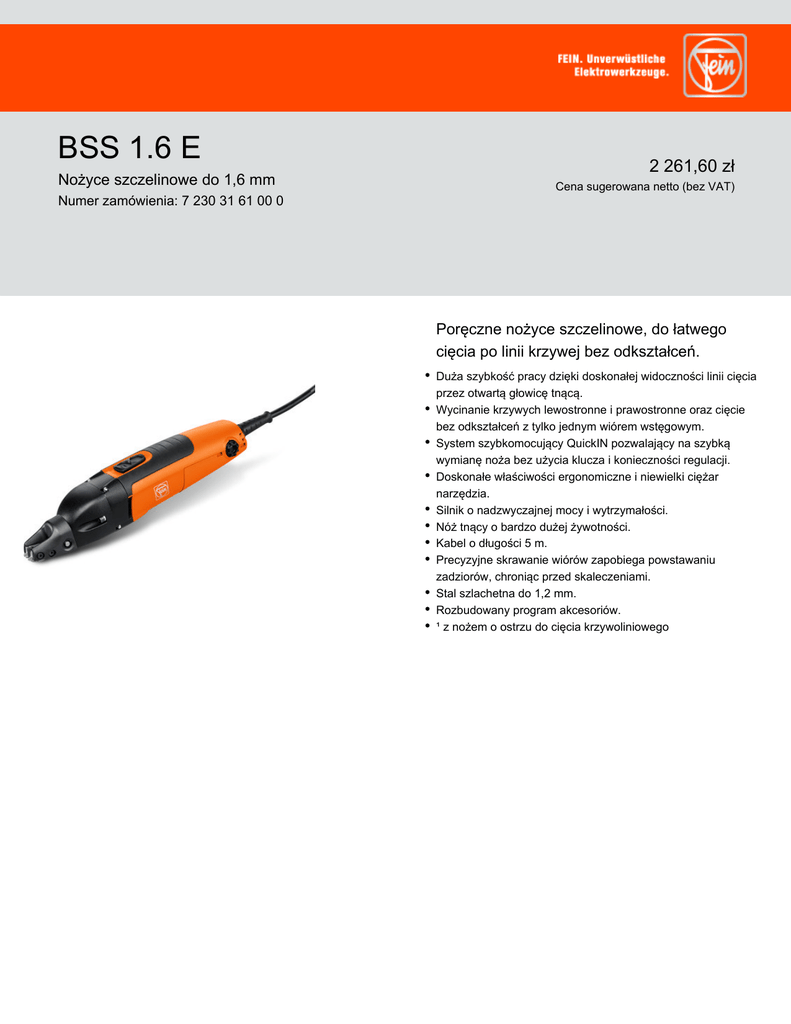 BSS 1.6 E Nożyce szczelinowe do 1,6 mm 2 261,60 zł Cena sugerowana netto (bez VAT) Numer zamówienia: 7 230 31 61 00 0 Poręczne nożyce szczelinowe, do łatwego cięcia po linii krzywej bez odkształceń. Duża szybkość pracy dzięki doskonałej widoczności linii cięcia przez otwartą głowicę tnącą. Wycinanie krzywych lewostronne i prawostronne oraz cięcie bez odkształceń z tylko jednym wiórem wstęgowym. System szybkomocujący QuickIN pozwalający na szybką wymianę noża bez użycia klucza i konieczności regulacji. Doskonałe właściwości ergonomiczne i niewielki ciężar narzędzia. Silnik o nadzwyczajnej mocy i wytrzymałości. Nóż tnący o bardzo dużej żywotności. Kabel o długości 5 m. Precyzyjne skrawanie wiórów zapobiega powstawaniu zadziorów, chroniąc przed skaleczeniami. Stal szlachetna do 1,2 mm. Rozbudowany program akcesoriów. ¹ z nożem o ostrzu do cięcia krzywoliniowego BSS 1.6 E Nożyce szczelinowe do 1,6 mm Numer zamówienia: 7 230 31 61 00 0 Dane techniczne Cena obejmuje: Pobór mocy 350 W 1 nóż tnący prosty, do 1,6 mm Moc użytkowa 210 W 1 para noży bocznych Częstotliwość skoku 2 100-4 500 obr/min Prędkość cięcia 6 - 10 m/min Kabel z wtyczką 5m Ciężar wg EPTA 1,5 kg Stal do 400 N/mm² 1,6 mm Stal do 600 N/mm² 1,2 mm Stal do 800 N/mm² 1,0 mm Metale nieżelazne do 250 N/mm² 2,0 mm Szerokość linii cięcia 5,0 mm Promień najmniejszej krzywizny 90 (30)¹ mm Średnica otworu początkowego 15 (8)¹ mm Sieciowe X 1 klucz
