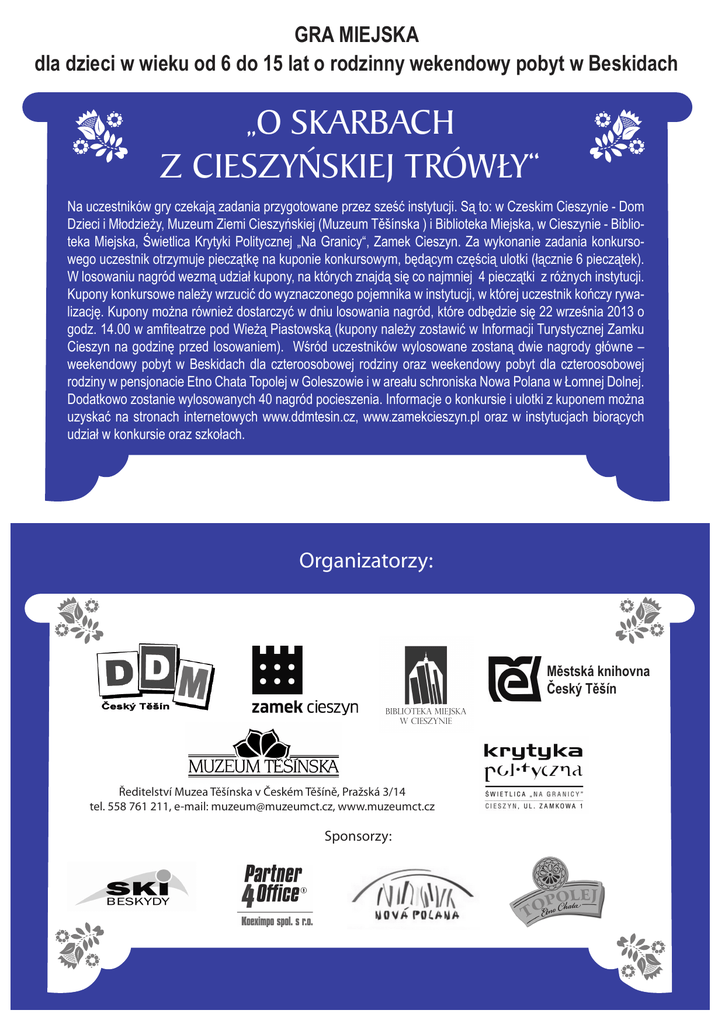 GRA MIEJSKA dla dzieci w wieku od 6 do 15 lat o rodzinny wekendowy pobyt w Beskidach „O SKARBACH Z CIESZYŃSKIEJ TRÓWŁY“ Na uczestników gry czekają zadania przygotowane przez sześć instytucji. Są to: w Czeskim Cieszynie - Dom Dzieci i Młodzieży, Muzeum Ziemi Cieszyńskiej (Muzeum Těšínska ) i Biblioteka Miejska, w Cieszynie - Biblioteka Miejska, Świetlica Krytyki Politycznej „Na Granicy“, Zamek Cieszyn. Za wykonanie zadania konkursowego uczestnik otrzymuje pieczątkę na kuponie konkursowym, będącym częścią ulotki (łącznie 6 pieczątek). W losowaniu nagród wezmą udział kupony, na których znajdą się co najmniej 4 pieczątki z różnych instytucji. Kupony konkursowe należy wrzucić do wyznaczonego pojemnika w instytucji, w której uczestnik kończy rywalizację. Kupony można również dostarczyć w dniu losowania nagród, które odbędzie się 22 września 2013 o godz. 14.00 w amfiteatrze pod Wieżą Piastowską (kupony należy zostawić w Informacji Turystycznej Zamku Cieszyn na godzinę przed losowaniem). Wśród uczestników wylosowane zostaną dwie nagrody główne – weekendowy pobyt w Beskidach dla czteroosobowej rodziny oraz weekendowy pobyt dla czteroosobowej rodziny w pensjonacie Etno Chata Topolej w Goleszowie i w areału schroniska Nowa Polana w Łomnej Dolnej. Dodatkowo zostanie wylosowanych 40 nagród pocieszenia. Informacje o konkursie i ulotki z kuponem można uzyskać na stronach internetowych www.ddmtesin.cz, www.zamekcieszyn.pl oraz w instytucjach biorących udział w konkursie oraz szkołach. Organizatorzy: Městská knihovna Český Těšín Ředitelství Muzea Těšínska v Českém Těšíně, Pražská 3/14 tel. 558 761 211, e-mail: [email protected], www.muzeumct.cz Sponsorzy: