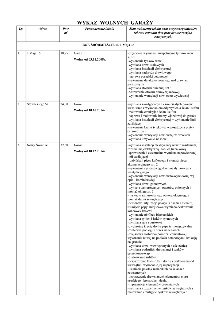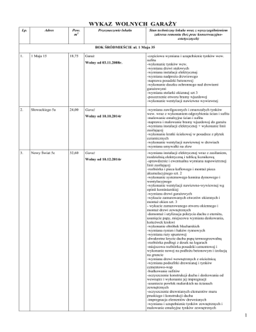 WYKAZ WOLNYCH GARAŻY Lp. Adres Pow. m2 Przeznaczenie lokalu Stan techniczny lokalu wraz z wyszczególnieniem zakresu remontu (bez prac konserwacyjnoestetycznych) BOK ŚRÓDMIEŚCIE ul. 1 Maja 35 1. 1 Maja 15 18,75 Garaż Wolny od 03.11.2008r. 2. Słowackiego 5a 24,00 Garaż Wolny od 10.10.2014r 3. Nowy Świat 5c 32,60 Garaż Wolny od 10.12.2014r -częściowa wymiana i uzupełnienie tynków wew. sufitu -wykonanie tynków wew. -wymiana drzwi stalowych -wymiana instalacji elektrycznej -wymiana nadproża drzwiowego -naprawa posadzki betonowej -wykonanie daszku ochronnego nad drzwiami garażowymi -wymiana stolarki okiennej szt 3 -poszerzenie otworu bramy wjazdowej -wykonanie wentylacji nawiewno wywiewnej -wymiana zawilgoconych i zmurszałych tynków wew. wraz z wykonaniem odgrzybienia ścian i sufitu -malowanie emulsyjne ścian i sufitu -naprawa i malowanie bramy wjazdowej do garażu -wymiana instalacji elektrycznej + wykonanie linii zasilającej -wykonanie kratki ściekowej w posadzce z płytek ceramicznych -wykonanie wentylacji nawiewnej w drzwiach -wymiana umywalki na zlew -wymiana instalacji elektrycznej wraz z zasilaniem, rozdzielnią elektryczną i tablicą licznikową -sprawdzenie i ewentualna wymiana napowietrznej linii zasilającej -rozbiórka i pieca kaflowego i montaż pieca akumulacyjnego szt. 2 -wykonanie systemowego komina dymowego i wentylacyjnego -wykonanie wentylacji nawiewno-wywiewnej wg opinii kominiarskiej -wymiana drzwi garażowych -wykucie zamurowanych otworów okiennych i montaż okien szt. 3 - wykucie zamurowanego otworu okiennego i montaż drzwi zewnętrznych -demontaż i utylizacja pokrycia dachu z eternitu, usunięcie papy, miejscowa wymiana deskowania, końcówek krokwi -wykonanie obróbek blacharskich -wymiana rynien i haków rynnowych -wymiana rury spustowej -dwukrotne krycie dachu papą termozgrzewalną -rozbiórka podłogi z desek na legarach -miejscowa rozbiórka posadzki cementowej i wykonanie nowej na podłożu betonowym i izolacją na gruncie -wymiana drzwi wewnętrznych z ościeżnicą -wymiana podsufitki drewnianej i tynków cementowo-wap -białkowanie sufitów -oczyszczenie konstrukcji dachu i deskowania od wewnątrz i wykonanie jej impregnacji -usuniecie powłok malarskich na ścianach zewnętrznych -oczyszczenie drewnianych elementów muru pruskiego i konstrukcji dachu -impregnacja elementów drewnianych -wymiana i uzupełnienie tynków zewnętrznych i malowanie emulsyjne tynków zewnętrznych 1 Lp. 1. Adres 1 Maja 15 Pow. m2 18,75 Przeznaczenie lokalu Garaż Wolny od 12.04.2011r 2. Słowackiego 3c 21,40 Garaż Wolny od 06.03.2014r Stan techniczny lokalu wraz z wyszczególnieniem zakresu remontu (bez prac konserwacyjnoestetycznych) -wymiana bramy wjazdowej z powiększeniem do wymiarów zgodnych z przepisami prawa budowlanego -wymiana nadproży szt. 2 -wymiana stolarki okiennej szt. 3 -wymiana posadzki betonowej -wymiana instalacji elektrycznej -wykonanie wentylacji wywiewnej - wymiana zawilgoconych i zmurszałych tynków 100% -wymiana wrót garażowych -wymiana instalacji elektrycznej +wymiana linii zasilającej wraz z wykonaniem pomiarów -wymiana posadzki betonowej -wykonanie wentylacji nawiewno-wywiewnej -naprawa dachu papowego (wymiana pokrycia papowego, uzupełnienie rynny, wymiana obróbek blacharskich, montaż rury spustowej). BOK SOBIĘCIN ul. 1 Maja 81a 3. E Plater 1 26,96 Garaż Wolny od 07.08.2009r. wykonanie nowego tynku wykonanie nowej posadzki wymiana instalacji elektrycznej wykonanie wentylacji nawiewno wywiewnej wzmocnienie belek stropowych wymiana pokrycia papowego dachu wraz z obróbkami pokrycie sufitu płytami ognioodpornymi 4. Puszkina 4 16,81 Garaż Wolny od 04.07.2011r -zbicie spękanego i odparzonego tynku 16,07 m2 i wykonanie nowego tynku -wykonanie nowej posadzki betonowej -wymiana kratek wentylacyjnych -malowanie olejne drzwi drewnianych – 2 strony -odnowienie malatury ścian i sufitu 5. Kolejarska 2 19,23 Garaż Wolny od 18.08.2014r -zbicie spękanego i odparzonego tynku ścian 54,17m2 i sufitu 19,22 m2 i wykonanie nowych tynków -białkowanie ścian i sufitu -naprawa posadzki betonowej -wykonanie wentylacji nawiewno-wywiewnej wg dokumentacji technicznej -wymiana wrót garażowych -miejscowa naprawa dachu papowego BOK Piaskowa Góra Szczawienko ul. Lelewela 2a 6. Długosza 6 12,12 Garaż Wolny od 21.03.2010r. 7. Wrocławska 94 14,70 Garaż Wolny od 22.12.2011r -wymiana instalacji elektrycznej -wymiana tynków ściennych i sufitowych -wymiana wrót garażowych -wykonanie wentylacji nawiewno-wywiewnej -białkowanie ścian i sufitów -wykonanie instalacji elektrycznej -wykonanie wentylacji wywiewnej zgodnie z opinią kominiarską -wymiana bramy wjazdowej do garażu -wymiana tynków ściennych i sufitu -malowanie ścian i sufitu -wyposażenie w sprzęt gaśniczy wymagany przepisami p.poż. 2 Lp. 8. Adres Wrocławska 60 Pow. m2 32,32 Przeznaczenie lokalu Garaż Wolny od 04.06.2012r 9. Wrocławska 131b 19,22 Garaż Wolny od 04.06.2012r 10. Wrocławska 131b 19,22 Garaż Wolny od 11.03.2013r 11. Fabiana 18,00 Garaż Wolny od 28.03.2013r Stan techniczny lokalu wraz z wyszczególnieniem zakresu remontu (bez prac konserwacyjnoestetycznych) -wymiana tynków ściennych -wymiana instalacji elektrycznej -wymiana wrót garażowych na metalowe z nawiewem -białkowanie ścian i sufitu -wykonanie instalacji elektrycznej -wykonanie wentylacji wywiewnej zewnętrznej -wykonanie przecierki tynku sufitu -wykonanie warstwy wyrównawczej na posadzce -wymiana wrót garażowych na metalowe z nawiewem -białkowanie ścian i sufitu -wykonanie instalacji elektrycznej -wykonanie wentylacji wywiewnej zewnętrznej -wykonanie przecierki tynku sufitu -wykonanie warstwy wyrównawczej na posadzce -wymiana wrót garażowych na metalowe z nawiewem -białkowanie ścian i sufitu - wykonanie instalacji elektrycznej -wykonanie wentylacji wywiewnej zew. – ok 10mb -wykonanie nowych tynków sufitu - wykonanie nowych tynków ścian -wykonanie warstwy wyrównawczej na