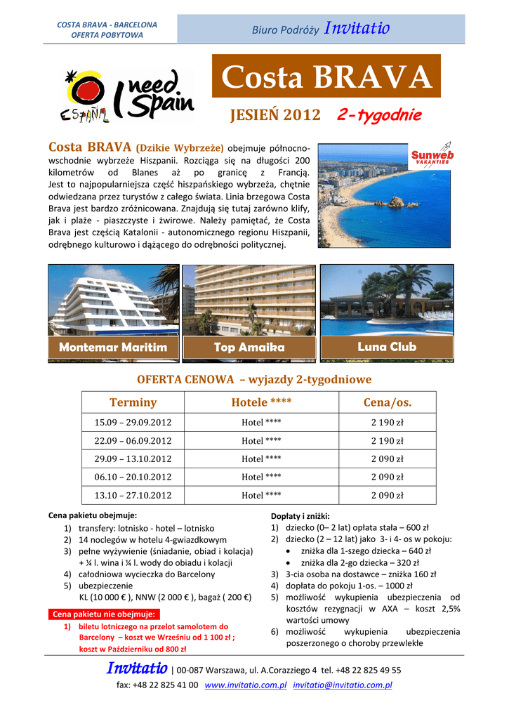COSTA BRAVA - BARCELONA OFERTA POBYTOWA Biuro Podróży Invitatio .Costa BRAVA. JESIEŃ 2012 2-tygodnie Costa BRAVA (Dzikie Wybrzeże) obejmuje północnowschodnie wybrzeże Hiszpanii. Rozciąga się na długości 200 kilometrów od Blanes aż po granicę z Francją. Jest to najpopularniejsza część hiszpańskiego wybrzeża, chętnie odwiedzana przez turystów z całego świata. Linia brzegowa Costa Brava jest bardzo zróżnicowana. Znajdują się tutaj zarówno klify, jak i plaże - piaszczyste i żwirowe. Należy pamiętać, że Costa Brava jest częścią Katalonii - autonomicznego regionu Hiszpanii, odrębnego kulturowo i dążącego do odrębności politycznej. Montemar Maritim Top Amaika Luna Club OFERTA CENOWA – wyjazdy 2-tygodniowe Terminy Hotele **** Cena/os. 15.09 – 29.09.2012 Hotel **** 2 190 zł 22.09 – 06.09.2012 Hotel **** 2 190 zł 29.09 – 13.10.2012 Hotel **** 2 090 zł 06.10 – 20.10.2012 Hotel **** 2 090 zł 13.10 – 27.10.2012 Hotel **** 2 090 zł Cena pakietu obejmuje: 1) transfery: lotnisko - hotel – lotnisko 2) 14 noclegów w hotelu 4-gwiazdkowym 3) pełne wyżywienie (śniadanie, obiad i kolacja) + ¼ l. wina i ¼ l. wody do obiadu i kolacji 4) całodniowa wycieczka do Barcelony 5) ubezpieczenie KL (10 000 € ), NNW (2 000 € ), bagaż ( 200 €) . Cena pakietu nie obejmuje:.. 1) biletu lotniczego na przelot samolotem do Barcelony – koszt we Wrześniu od 1 100 zł ; koszt w Październiku od 800 zł Dopłaty i zniżki: 1) dziecko (0– 2 lat) opłata stała – 600 zł 2) dziecko (2 – 12 lat) jako 3- i 4- os w pokoju: zniżka dla 1-szego dziecka – 640 zł zniżka dla 2-go dziecka – 320 zł 3) 3-cia osoba na dostawce – zniżka 160 zł 4) dopłata do pokoju 1-os. – 1000 zł 5) możliwość wykupienia ubezpieczenia od kosztów rezygnacji w AXA – koszt 2,5% wartości umowy 6) możliwość wykupienia ubezpieczenia poszerzonego o choroby przewlekłe Invitatio | 00-087 Warszawa, ul. A.Corazziego 4 tel. +48 22 825 49 55 fax: +48 22 825 41 00 www.invitatio.com.pl [email protected] COSTA BRAVA - BARCELONA OFERTA POBYTOWA Biuro Podróży Hotel Invitatio MONTEMAR MARITIM **** Hotel położony w miejscowości Santa Susana, 100 m od piaszczystej plaży. Hotel posiada 190 przestronnych i nowocześnie urządzonych pokoi. W pokojach: indywidualnie sterowana klimatyzacja, łazienka (prysznic lub wanna, wc; suszarka), telefon, telewizja satelitarna, lodówka, sejf (za dopłatą: ok. 12 EUR/tydzień), balkon lub taras wyposażony w stolik i krzesełka. Hotel Top AMAIKA Calella **** - Położony zaledwie kilka minut spacerem od pięknej, piaszczystej plaży. Podczas pobytu w hotelu Top Amaika Calella goście mogą zanurzyć się w dużym, odkrytym basenie lub po prostu poleżeć na leżaku ciesząc się ciepłym, śródziemnomorskim słońcem. Na wybrzeżu w okolicach miasta Calella są ciągnące się na 3 km plaże oznaczone Niebieską Flagą oraz odosobnione zatoczki. Udany dzień mogą Państwo spędzić także w Barcelonie, do której można dojechać z hotelu w 45 minut. Hotelowa restauracja czynna jest na śniadanie, lunch i kolację oraz serwuje dania kuchni katalońskiej, hiszpańskiej i międzynarodowej w formie bufetu. Hotel LUNA CLUB **** - Hotel położony w miejscowości Malgrat de Mar, ok. 450 m od morza, w drugiej linii zabudowań, dzięki czemu goście mogą odpoczywać poza zgiełkiem dobiegającym z dyskotek głównej promenady, w odległości ok. 10 minut spacerem do stacji kolejki w Santa Susana (bezpośrednie połączenie do centrum Barcelony). Hotel Luna Club oferujący swoim gościom 2 baseny odkryte, niewielki podgrzewany basen kryty, ogród, jacuzzi, restaurację, bar, animacje wieczorne, bezpłatne Wi-Fi w recepcji, kącik internetowy (odpłatny), siłownię, tenis stołowy oraz miejsce do gry w siatkówkę. Invitatio | 00-087 Warszawa, ul. A.Corazziego 4 tel. +48 22 825 49 55 fax: +48 22 825 41 00 www.invitatio.com.pl [email protected]