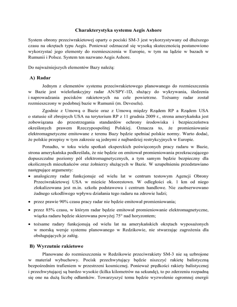 Charakterystyka systemu Aegis Ashore System obrony przeciwrakietowej oparty o pociski SM-3 jest wykorzystywany od dłuższego czasu na okrętach typu Aegis. Ponieważ odznaczał się wysoką skutecznością postanowiono wykorzystać jego elementy do rozmieszczenia w Europie, w tym na lądzie w bazach w Rumunii i Polsce. System ten nazwano Aegis Ashore. Do najważniejszych elementów Bazy należą: A) Radar Jednym z elementów systemu przeciwrakietowego planowanego do rozmieszczenia w Bazie jest wielofunkcyjny radar AN/SPY-1D, służący do wykrywania, śledzenia i naprowadzania pocisków rakietowych na cele powietrzne. Tożsamy radar został rozmieszczony w podobnej bazie w Rumunii (m. Deveselu). Zgodnie z Umową o Bazie oraz z Umową między Rządem RP a Rządem USA o statusie sił zbrojnych USA na terytorium RP z 11 grudnia 2009 r., strona amerykańska jest zobowiązana do przestrzegania standardów ochrony środowiska i bezpieczeństwa określonych prawem Rzeczypospolitej Polskiej. Oznacza to, że promieniowanie elektromagnetyczne emitowane z terenu Bazy będzie spełniać polskie normy. Warto dodać, że polskie przepisy w tym zakresie są jednymi z najbardziej restrykcyjnych w Europie. Ponadto, w toku wielu spotkań eksperckich poświęconych pracy radaru w Bazie, strona amerykańska podkreślała, że nie będzie on emitował promieniowania przekraczającego dopuszczalne poziomy pól elektromagnetycznych, a tym samym będzie bezpieczny dla okolicznych mieszkańców oraz żołnierzy służących w Bazie. W uzupełnieniu przedstawiano następujące argumenty: analogiczny radar funkcjonuje od wielu lat w centrum testowym Agencji Obrony Przeciwrakietowej USA w mieście Moorestown. W odległości ok. 1 km od niego zlokalizowana jest m.in. szkoła podstawowa i centrum handlowe. Nie zaobserwowano żadnego szkodliwego wpływu działania tego radaru na zdrowie ludzi; przez prawie 90% czasu pracy radar nie będzie emitował promieniowania; przez 85% czasu, w którym radar będzie emitował promieniowanie elektromagnetyczne, wiązka radaru będzie skierowana powyżej 75° nad horyzontem; tożsame radary funkcjonują od wielu lat na amerykańskich okrętach wyposażonych w morską wersje systemu planowanego w Redzikowie, nie stwarzając zagrożenia dla obsługujących je załóg. B) Wyrzutnie rakietowe Planowane do rozmieszczenia w Redzikowie przeciwrakiety SM-3 nie są uzbrojone w materiał wybuchowy. Pocisk przechwytujący będzie niszczyć rakietę balistyczną bezpośrednim trafieniem w przestrzeni kosmicznej. Ponieważ prędkości rakiety balistycznej i przechwytującej są bardzo wysokie (kilka kilometrów na sekundę), to po zderzeniu rozpadną się one na dużą liczbę odłamków. Towarzyszyć temu będzie wyzwolenie ogromnej energii i pojawienie się bardzo wysokiej temperatury. W efekcie część szczątków rakiet wyparuje. Pozostałe powinny spłonąć podczas przechodzenia przez ziemską atmosferę. Dotychczas rakiety przechwytujące SM-3 (w starszej konfiguracji niż planowane do rozmieszczenia w RP) zostały użyte operacyjnie w 2008 r. Wykorzystano je do zestrzelenia satelity USA, z którym utracono kontakt. Nie odnotowano wówczas żadnych negatywnych następstw związanych z ewentualnych upadkiem szczątków satelity i przeciwrakiety. Satelita o wymiarach 4,6 x 2,4 m (przy rozwiniętej antenie 30 x 15 m) i o masie około 2 ton rozpadł się na około 80 części, które całkowicie spłonęły w atmosferze. Należy także podkreślić, że w przypadku systemów MD wyższej warstwy takich jak SM-3, negatywne skutki uderzenia rakiety balistycznej, szczególnie uzbrojonej w broń masowego rażenia, byłyby nieporównanie większe niż przechwycenia pocisku i hipotetycznego upadku po przechwyceniu nieznacznych szczątków na ziemię. C) Status Bazy Baza jest i pozostanie polskim kompleksem wojskowym, na którym zostaną rozmieszczone obiekty amerykańskie. Na terenie Bazy stacjonować będzie ok. 200-300 osób personelu wojskowego i cywilnego USA. Baza będzie obiektem szczególnie chronionym. Dla zapewnienia jej ochrony został sformowany polski Batalion Ochrony, składający się z około 250 żołnierzy. Ochrona Bazy realizowana będzie całodobowo.