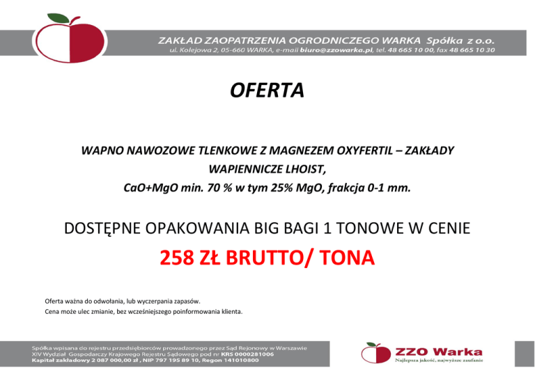 OFERTA WAPNO NAWOZOWE TLENKOWE Z MAGNEZEM OXYFERTIL – ZAKŁADY WAPIENNICZE LHOIST, CaO+MgO min. 70 % w tym 25% MgO, frakcja 0-1 mm. DOSTĘPNE OPAKOWANIA BIG BAGI 1 TONOWE W CENIE 258 ZŁ BRUTTO/ TONA Oferta ważna do odwołania, lub wyczerpania zapasów. Cena może ulec zmianie, bez wcześniejszego poinformowania klienta.