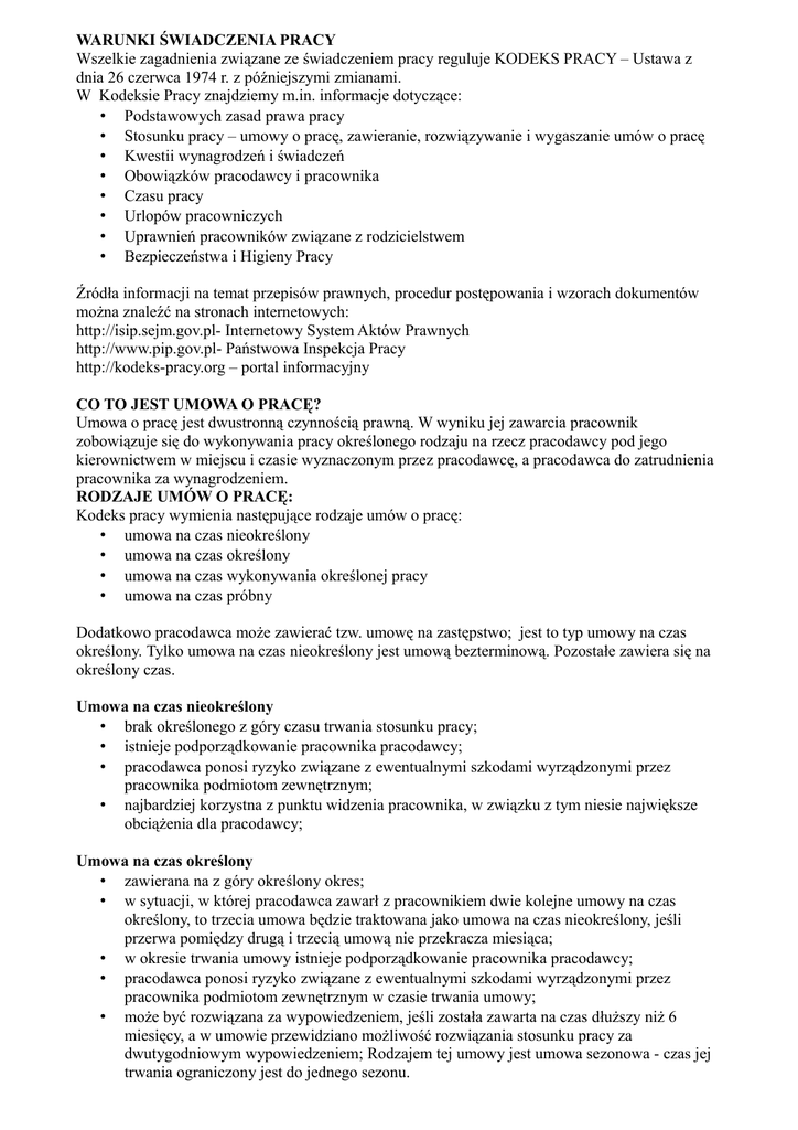 WARUNKI ŚWIADCZENIA PRACY Wszelkie zagadnienia związane ze świadczeniem pracy reguluje KODEKS PRACY – Ustawa z dnia 26 czerwca 1974 r. z późniejszymi zmianami. W Kodeksie Pracy znajdziemy m.in. informacje dotyczące: • Podstawowych zasad prawa pracy • Stosunku pracy – umowy o pracę, zawieranie, rozwiązywanie i wygaszanie umów o pracę • Kwestii wynagrodzeń i świadczeń • Obowiązków pracodawcy i pracownika • Czasu pracy • Urlopów pracowniczych • Uprawnień pracowników związane z rodzicielstwem • Bezpieczeństwa i Higieny Pracy Źródła informacji na temat przepisów prawnych, procedur postępowania i wzorach dokumentów można znaleźć na stronach internetowych: http://isip.sejm.gov.pl- Internetowy System Aktów Prawnych http://www.pip.gov.pl- Państwowa Inspekcja Pracy http://kodeks-pracy.org – portal informacyjny CO TO JEST UMOWA O PRACĘ? Umowa o pracę jest dwustronną czynnością prawną. W wyniku jej zawarcia pracownik zobowiązuje się do wykonywania pracy określonego rodzaju na rzecz pracodawcy pod jego kierownictwem w miejscu i czasie wyznaczonym przez pracodawcę, a pracodawca do zatrudnienia pracownika za wynagrodzeniem. RODZAJE UMÓW O PRACĘ: Kodeks pracy wymienia następujące rodzaje umów o pracę: • umowa na czas nieokreślony • umowa na czas określony • umowa na czas wykonywania określonej pracy • umowa na czas próbny Dodatkowo pracodawca może zawierać tzw. umowę na zastępstwo; jest to typ umowy na czas określony. Tylko umowa na czas nieokreślony jest umową bezterminową. Pozostałe zawiera się na określony czas. Umowa na czas nieokreślony • brak określonego z góry czasu trwania stosunku pracy; • istnieje podporządkowanie pracownika pracodawcy; • pracodawca ponosi ryzyko związane z ewentualnymi szkodami wyrządzonymi przez pracownika podmiotom zewnętrznym; • najbardziej korzystna z punktu widzenia pracownika, w związku z tym niesie największe obciążenia dla pracodawcy; Umowa na czas określony • zawierana na z góry określony okres; • w sytuacji, w której pracodawca zawarł z pracownikiem dwie kolejne umowy na czas określony, to trzecia umowa będzie traktowana jako umowa na czas nieokreślony, jeśli przerwa pomiędzy drugą i trzecią umową nie przekracza miesiąca; • w okresie trwania umowy istnieje podporządkowanie pracownika pracodawcy; • pracodawca ponosi ryzyko związane z ewentualnymi szkodami wyrządzonymi przez pracownika podmiotom zewnętrznym w czasie trwania umowy; • może być rozwiązana za wypowiedzeniem, jeśli została zawarta na czas dłuższy niż 6 miesięcy, a w umowie przewidziano możliwość rozwiązania stosunku pracy za dwutygodniowym wypowiedzeniem; Rodzajem tej umowy jest umowa sezonowa - czas jej trwania ograniczony jest do jednego sezonu. Umowa na okres próbny • umowa ta poprzedza zawarcie umowy o pracę; • łączny okres próbny u jednego pracodawcy nie może przekroczyć 3 miesięcy; umowa ta pozwala sprawdzić pracodawcy umiejętności i kwalifikacje pracownika na danym stanowisku; z kolei pracownikowi daje możliwość oceny, czy dana praca spełnia jego oczekiwania; • istnieje możliwość rozwiązania umowy na okres próbny za wypowiedzeniem – okres wypowiedzenia zależy od czasu trwania umowy (jeśli okres próbny trwa mniej niż 2 tygodnie, to okres wypowiedzenia wynosi 3 dni; jeśli okres próbny trwa powyżej 2 tygodni, ale krócej niż 3 miesiące - okres wypowiedzenia wynosi 1 tydzień; jeśli okres próbny trwa 3 miesiące - okres wypowiedzenia wynosi 2 tygodnie). Umowa na zastępstwo • na czas nieobecności pracownika w pracy, może być oznaczony konkretny termin lub do czasu powrotu właściwego pracownika; • może zostać rozwiązana za 3-dniowym wypowiedzeniem. Umowa na czas wykonania określonej pracy • termin zakończenia trwania umowy nie jest dokładnie określony; dotyczy to umów na pracę sezonową lub cykliczną; • umowa jest zawierana w celu wykonania określonego zadania (pracy); • w okresie trwania umowy pracownik jest podporządkowany pracodawcy nie przewiduje rozwiązania stosunku pracy za wypowiedzeniem. Umowy cywilno – prawne W praktyce funkcjonują umowy cywilno - prawne, na podstawie których wykonywana jest określona praca. Oznacza to, że umowy te są regulowane przez kodeks cywilny, a nie przez kodeks pracy. Rodzaje umów: • umowa zlecenie - najbardziej popularna umowa. Polega na tym, że pracodawca zleca wykonanie określonej pracy w określonym terminie za ustalonym wynagrodzeniem. Ten rodzaj umowy cechuje się: - brakiem sytuacji podporządkowania pracodawcy; - brakiem określenia wynagrodzenia minimalnego; -brakiem limitu liczby zawieranych umów z jednym pracodawcą; - zleceniobiorcą może być podmiot gospodarczy (przedsiębiorstwo), - zleceniodawca nie ma obowiązku udzielenia urlopu, wypłaty odprawy czy odpłatności za czas choroby. • umowa o dzieło - zatrudniony na podstawie takiej umowy zobowiązuje się do wykonania określonego dzieła, czyli osiągnięcia danego rezultatu. Umowa może określać termin realizacji dzieła. Pracodawca zobowiązuje się do wypłaty wynagrodzenia, jeśli dzieło określone w umowie zostanie zrealizowane. • umowa agencyjna - na podstawie takiej umowy zatrudniony jest zobowiązany do pośrednictwa w zawieraniu umów na rzecz lub w imieniu zlecającego. W umowie zostaje określone wynagrodzenie (ustalane najczęściej w postaci prowizji). Umowę agencyjną zawiera się na czas określony lub nieokreślony. Jeśli chodzi o naliczanie składek na ubezpieczenie społeczne - co do zasady stosuje się uregulowania dotyczące umowy zlecenia. • umowa o pracę nakładczą - umowa ta przypomina z jednej strony umowę o pracę, a drugiej - umowę o dzieło. Dotyczy świadczenia usług pracy chałupniczej. Umowa taka musi określać wynagrodzenie, które musi spełniać regulacje płacy minimalnej. Jeśli chodzi o naliczanie składek na ubezpieczeni