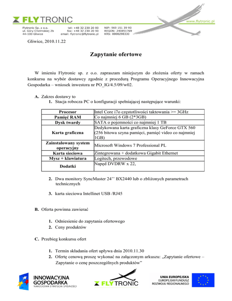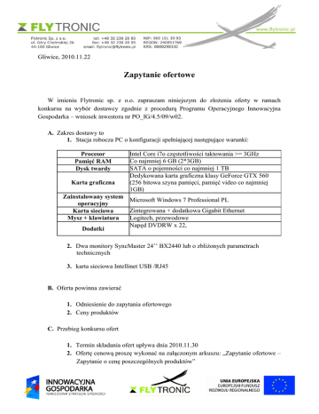 Gliwice, 2010.11.22 Zapytanie ofertowe W imieniu Flytronic sp. z o.o. zapraszam niniejszym do złożenia oferty w ramach konkursu na wybór dostawcy zgodnie z procedurą Programu Operacyjnego Innowacyjna Gospodarka – wniosek inwestora nr PO_IG/4.5/09/w02. A. Zakres dostawy to 1. Stacja robocza PC o konfiguracji spełniającej następujące warunki: Procesor Pamięć RAM Dysk twardy Karta graficzna Intel Core i7o częstotliwości taktowania >= 3GHz Co najmniej 6 GB (2*3GB) SATA o pojemności co najmniej 1 TB Dedykowana karta graficzna klasy GeForce GTX 560 (256 bitowa szyna pamięci, pamięć video co najmniej 1GB) Zainstalowany system Microsoft Windows 7 Professional PL operacyjny Zintegrowana + dodatkowa Gigabit Ethernet Karta sieciowa Logitech, przewodowe Mysz + klawiatura Napęd DVDRW x 22, Dodatki 2. Dwa monitory SyncMaster 24’’ BX2440 lub o zbliżonych parametrach technicznych 3. karta sieciowa Intellinet USB /RJ45 B. Oferta powinna zawierać 1. Odniesienie do zapytania ofertowego 2. Ceny produktów C. Przebieg konkursu ofert 1. Termin składania ofert upływa dnia 2010.11.30 2. Ofertę cenową proszę wykonać na załączonym arkuszu: „Zapytanie ofertowe – Zapytanie o cenę poszczególnych produktów” 3. Wybór przez inwestora najkorzystniejszej oferty - do dnia 2010.12.01 D. Kryteria oceny ofert 1. Cena E. Załączniki: Załącznik 1: „Zapytanie ofertowe – Zapytanie o cenę poszczególnych produktów” Uwaga: Konkurs nie ma charakteru przetargu, nie podlega przepisom o zamówieniach publicznych i jest wewnętrzną procedurą spółki Inwestora. Udział w konkursie jest dobrowolny i równoznaczny z akceptacją przedstawionych zasad. Flytronic sp. z o.o. ul. Góry Chełmskiej 2B 44-100 Gliwice