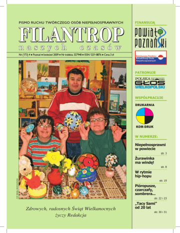 PISMO RUCHU TWÓRCZEGO OSÓB NIEPEŁNOSPRAWNYCH FINANSUJĄ Nr (173) 4 Poznań kwiecień 2009 Nr indeksu 327948 ISSN 1231-8876 Cena 3 zł PATRONUJE WSPÓŁPRACUJE DRUKARNIA KOM-DRUK W NUMERZE: Niepełnosprawni w powiecie str. 3 Żurawinka ma windę! str. 8 FOT. PAWEŁ GROCHOWSKI W rytmie hip-hopu str. 19 Pióropusze, czarczafy, sombrera... str. 22 i 23 Zdrowych, radosnych Świąt Wielkanocnych życzy Redakcja „Tacy Sami” od 20 lat str. 30 i 31 2 STRONA KWIECIEŃ 2009 „Filantrop” powiatowy i ogólnopolski K wietniowe wydanie „Filantropa Naszych Czasów” (właśnie oddajemy do rąk naszych Czytelników) jest pierwszym, które powstało między innymi dzięki znacznie zwiększonej w tym roku pomocy finansowej władz Powiatu Poznańskiego. Wskutek tego, a także dzięki kontynuowanemu wsparciu Państwowego Funduszu Rehabilitacji Osób Niepełnosprawnych, rozpoczyna się nowy etap w rozwoju naszego czasopisma. Przybyło stron, poszerzymy problematykę i krąg współpracowników ze środowisk osób niepełnosprawnych. Oczywiście, zawsze będziemy pamiętać, ze Powiat Poznański pomaga finansowo naszemu pismu systematycznie od kwietnia 2004 roku. Tegoroczne, kwietniowe wydanie naszego miesięcznika jest więc poniekąd wydaniem jubileuszowym, ponieważ mija właśnie dokład- nie pięć lat tej pomocy, za którą serdecznie dziękujemy. Powiat Poznański docenił w ten sposób znaczenie „Filantropa” dla rehabilitacji społecznej środowiska osób niepełnosprawnych i jego integracji z życiem całego społeczeństwa. I to uznanie jest dla nas największą nagrodą za redakcyjny i wydawniczy wysiłek. Godzi się też podkreślić, że władze Powiatu od wielu już lat systematycznie wspierały finansowo działania obecnego wydawcy „Filantropa”, którym jest Wielkopolski Związek Inwalidów Narządu Ruchu, dzięki czemu możliwe było między innymi utworzenie i prowadzenie Warsztatów Terapii Zajęciowej w Owińskach, organizowanie pikników integracyjnych i rajdów zmotoryzowanych niepełnosprawnych, a także powiatowych turniejów tenisa ziemnego przez sekcję tenisową „Lider” Wielkopolskiego Związku w Miękowie. T Powiat poznański pomaga niepełnosprawnym ylko w 2008 roku powiat poznański przeznaczył 592 tysiące złotych na dofinansowanie turnusów rehabilitacyjnych, z których skorzystały 902 osoby, ponad milion złotych wydano na dofinansowanie zakupu sprzętu rehabilitacyjnego, przedmioty ortopedyczne i środki pomocnicze, prawie tyle samo przeznaczono na dofinansowanie likwidacji barier. Osoba niepełnosprawna może ubiegać się o dofinansowanie ze środków Państwowego Funduszu Rehabilitacji Osób Niepełnosprawnych uczestnictwa w turnusie rehabilitacyjnym, dofinansowania do zakupu sprzętu rehabilitacyjnego, przedmiotów ortopedycznych i środków pomocniczych. Niepełnosprawny może ubiegać się o dofinansowanie turnusu pod warunkiem, że został skierowany na turnus na wniosek lekarza, pod którego opieką się znajduje. Wysokość dofinansowania uczestnictwa w turnusie rehabilitacyjnym uzależniona jest od dochodów przypadających na jednego członka rodziny oraz od stopnia niepełnosprawności i dla osób ze znacznym stopniem wynosiła 779 zł, dla osób z umiarkowanym stopniem 721 zł, dla osób z lekkim stopniem 664 zł, dla opiekunów i osób niepełnosprawnych – pracowników Zakładów Pracy Chronionej 519 zł. Niepełnosprawni mogą ubiegać się również o dofinansowanie do zakupu sprzętu rehabilitacyjnego, przedmiotów ortopedycznych i środków pomocniczych. W 2008 roku takie środki otrzymały 602 niepełnosprawne osoby dorosłe i 164 niepełnosprawnych dzieci i młodzieży. Natomiast dofinansowanie do likwidacji barier architektonicznych, w komunikowaniu się i technicznych otrzymały 184 osoby. Najdłużej czeka się na realizację wniosku o dofinansowanie barier architektonicznych, wynika to z obowiązującej procedury, która obejmuje m.in. wizję lokalną, przydział środków finansowych, wykonanie kosztorysu planowanych prac, zawarcie Siedemnaście gmin Powiatu Poznańskiego, to wszystko, co się w nich dzieje w środowiskach osób niepełnosprawnych i ich organizacjach, od lat systematycznie trafiało na łamy „Filantropa”. Opublikowaliśmy teksty wielu autorów z tego obszaru, miedzy innymi przez siedem lat drukowaliśmy w odcinkach niezwykłą autobiografię Marioli Wower ze Stęszewa, który to tekst wydamy w tym roku w formie książki. Nasza redakcja często bywa zapraszana do takich gmin jak Czerwonak, Swarzędz, Dopiewo, Murowana Goślina, Kostrzyn, Luboń, Mosina, Puszczykowo i ceni sobie współpracę z tamtejszymi niepełnosprawnymi autorami. Siłą rzeczy obecnie ta współpraca się nasili i powiatu na łamach naszego miesięcznika będzie więcej. Zapraszamy do współpracy organizacje pozarządowe ze wszystkich gmin z tego terenu, warsztaty terapii umowy i realizację prac. Wnioski można składać w Powiatowym Centrum Pomocy Rodzinie. Powiat poznański dofinansowuje również działalność warsztatów terapii zajęciowej w Swarzędzu, Wirach, Dopiewcu i Owińskach. Ponad 1,5 mln złotych kosztowało w 2008 roku utrzymanie czterech warsztatów terapii zajęciowej do których uczęszcza 125 osób, 90% środków na ich działalność pochodziło z PFRON, a 10% stanowiły środki budżetu powiatu. Na zwrot kosztów wyposażenia stanowisk pracy osoby niepełnosprawnej Powiatowy Urząd Pracy w Poznaniu wydał ponad 199 tysięcy złotych, a prawie 300 tysięcy złotych wydano na udzielenie osobom niepełnosprawnym środków na podjęcie działalności gospodarczej, rolniczej albo na wniesienie wkładu do spółdzielni socjalnej. Prawie 50 tysięcy złotych otrzymało 10 organizacji na do- zajęciowej, środowiskowe domy samopomocy, ośrodki pomocy społecznej i inne organizacje oraz instytucje. Będziemy pisać o Waszych twórczych inicjatywach, spotkaniach, turniejach, wystawach i wielu innych działaniach. Będ
