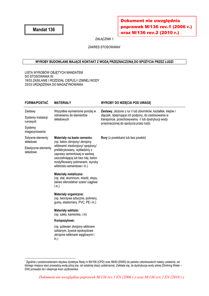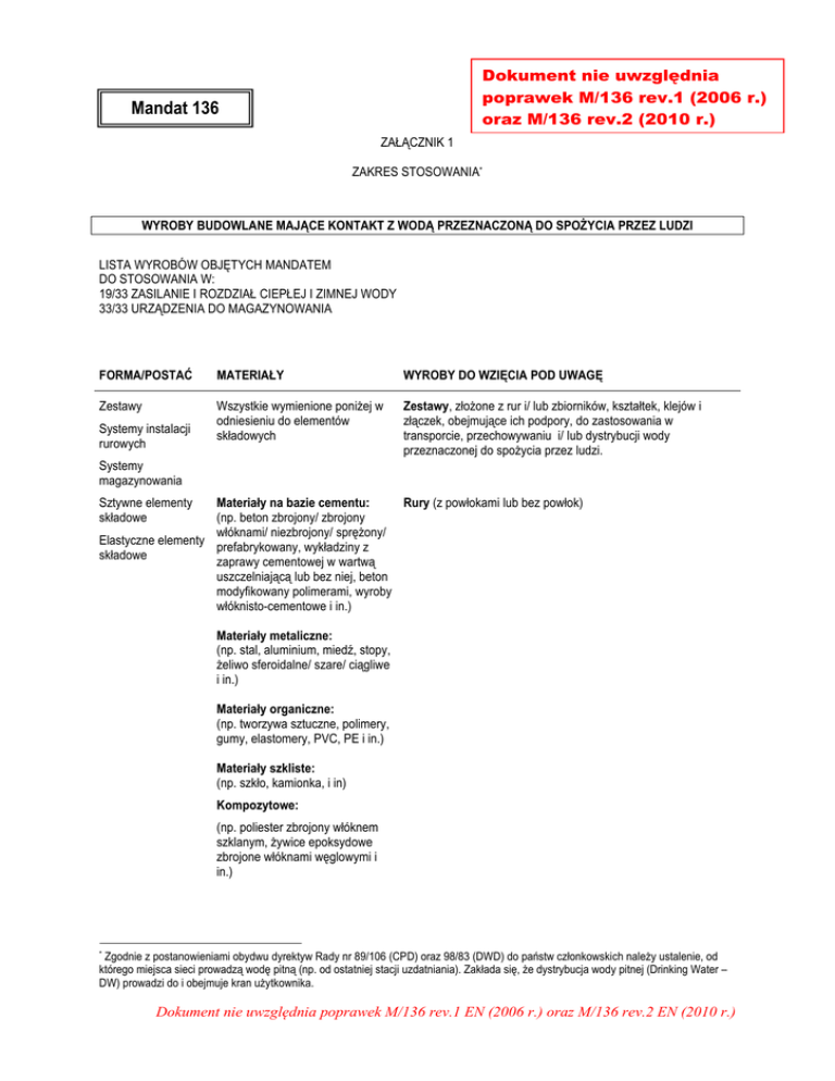 Dokument nie uwzględnia poprawek M/136 rev.1 (2006 r.) oraz M/136 rev.2 (2010 r.) Mandat 136 ZAŁĄCZNIK 1 ZAKRES STOSOWANIA* WYROBY BUDOWLANE MAJĄCE KONTAKT Z WODĄ PRZEZNACZONĄ DO SPOŻYCIA PRZEZ LUDZI LISTA WYROBÓW OBJĘTYCH MANDATEM DO STOSOWANIA W: 19/33 ZASILANIE I ROZDZIAŁ CIEPŁEJ I ZIMNEJ WODY 33/33 URZĄDZENIA DO MAGAZYNOWANIA FORMA/POSTAĆ MATERIAŁY WYROBY DO WZIĘCIA POD UWAGĘ Zestawy Wszystkie wymienione poniżej w odniesieniu do elementów składowych Zestawy, złożone z rur i/ lub zbiorników, kształtek, klejów i złączek, obejmujące ich podpory, do zastosowania w transporcie, przechowywaniu i/ lub dystrybucji wody przeznaczonej do spożycia przez ludzi. Systemy instalacji rurowych Systemy magazynowania Sztywne elementy składowe Materiały na bazie cementu: Rury (z powłokami lub bez powłok) (np. beton zbrojony/ zbrojony włóknami/ niezbrojony/ sprężony/ Elastyczne elementy prefabrykowany, wykładziny z składowe zaprawy cementowej w wartwą uszczelniającą lub bez niej, beton modyfikowany polimerami, wyroby włóknisto-cementowe i in.) Materiały metaliczne: (np. stal, aluminium, miedź, stopy, żeliwo sferoidalne/ szare/ ciągliwe i in.) Materiały organiczne: (np. tworzywa sztuczne, polimery, gumy, elastomery, PVC, PE i in.) Materiały szkliste: (np. szkło, kamionka, i in) Kompozytowe: (np. poliester zbrojony włóknem szklanym, żywice epoksydowe zbrojone włóknami węglowymi i in.) * Zgodnie z postanowieniami obydwu dyrektyw Rady nr 89/106 (CPD) oraz 98/83 (DWD) do państw członkowskich należy ustalenie, od którego miejsca sieci prowadzą wodę pitną (np. od ostatniej stacji uzdatniania). Zakłada się, że dystrybucja wody pitnej (Drinking Water – DW) prowadzi do i obejmuje kran użytkownika. Dokument nie uwzględnia poprawek M/136 rev.1 EN (2006 r.) oraz M/136 rev.2 EN (2010 r.) Elementy składowe Materiały na bazie cementu: Zbiorniki (w tym zamknięte i wentylowane zbiorniki gorącej (np. beton zbrojony/ zbrojony wody) stosowane w stałych instalacjach jako zbiorniki zasilające włóknami/ niezbrojony/ sprężony/ lub magazynujące wodę przeznaczoną do spożycia przez ludzi beton prefabrykowany, beton wykonywany na miejscu (budowy) ewentualnie z dodatkami organicznymi, beton modyfikowany polimerami, wyroby włóknisto-cementowe i in.) Materiały metaliczne: (np. stal z powłokami/ miękka/ z wyłożeniem/ nierdzewna, aluminium, miedź, stopy, żeliwo sferoidalne/ szare/ ciągliwe i in.) Materiały organiczne: (np. tworzywa sztuczne, guma i in.) Materiały szkliste: (np. szkło, kamionka, i in) Elementy składowe Elementy składowe Elementy składowe Podatne Elastyczne Podatne Podatne Kompozytowe: (np. poliester zbrojony włóknem szklanym, domieszki i in.) Metale Guma Tworzywa sztuczne Materiały wieloskładnikowe Składniki chemiczne Metale Guma Tworzywa sztuczne Składniki chemiczne Jak wskazano powyżej w odniesieniu do rur Zawory, krany, pompy, wodomierze, urządzenia ochronne i zabezpieczające Z powłokami lub bez powłok. Kształtki, kleje, złączki, uszczelnienia złączy i uszczelki Wieloskładnikowe Przewody i rurki kablowe Stosowane do ochrony (należy wziąć pod uwagę prace prowadzone przez CENELEC w ramach dyrektywy niskonapięciowej 73/23/EWG (Low Voltage Directive – LVD) Membrany, żywice Wieloskładnikowe Wieloskładnikowe Powłoki, w tym wyłożenia Środki poślizgowe, smary W odpowiednich przypadkach należy wziąć pod uwagę następujące dyrektywy: 89/106/EWG z 12 grudnia 1988 r., znaną jako „dyrektywa dot. wyrobów budowlanych” (Construction Products Directive – CPD) 89/109/EWG i zmieniające ją/ wdrażające dyrektywy dotyczące wyrobów mających kontakt z żywnością 90/128/EWG z 23 lutego 1990 r. dot. wyrobów i artykułów z tworzyw sztucznych przeznaczonych do kontaktu z żywnością 93/68/EWG z 17 marca 1993 r. zmieniającą wszystkie dyrektywy (nowego podejścia) i CPD 97/23/WE z 29 maja 1997 r. znaną jako „dyrektywa dot. urządzeń ciśnieniowych” 98/83/WE z 3 listopada 1998 r., znaną jako dyrektywa dotycząca wody pitnej (Drinking Water Directive – DWD). Dokument nie uwzględnia poprawek M/136 rev.1 EN (2006 r.) oraz M/136 rev.2 EN (2010 r.) Załącznik 2 TECHNICZNE WARUNKI ODNIESIENIA Uwaga: Nie wszystkie cechy wskazane w poniższych tabelach będą miały związek z każdym wyrobem z określonej grupy lub podgrupy. CEN/CENELEC powinny wybrać z całego zestawu podzbiór cech mających zastosowanie w przypadku danego wyrobu. WYROBY BUDOWLANE MAJĄCE KONTAKT Z WODĄ PRZEZNACZONĄ DO SPOŻYCIA PRZEZ LUDZI DO STOSOWANIA W: 19/33 ZASILANIE I ROZDZIAŁ CIEPŁEJ I ZIMNEJ WODY; 33/33 URZĄDZENIA DO MAGAZYNOWANIA 1. ZESTAWY (Systemy instalacji i/lub magazynowania) Stosowane do wody przeznaczonej do spożycia przez ludzi. Mogą być pod ciśnieniem lub bezciśnieniowe, wewnątrz lub na zewnątrz budynków (zarówno podziemne jak nadziemne). Obejmują one rury, zbiorniki, kształtki, urządzenia bezpieczeństwa, kleje, złączki, zawory, krany, liczniki, pompy, membrany i możliwe specjalne elementy składowe. UWAGA: Zestawy będą zdatne do kontaktu z wodą pitną tylko jeżeli zbadano i oceniono przydatność wszystkich ich elementów składowych . Cechy ZESTAWÓW/ SYSTEMÓW INSTALACJI/ MAGAZYNOWANIA, które obejmie norma zharmonizowana to: Wym. Podst. 1 2 3 + 4 5 6 Właściwości użytkowe Wytrzymałość na zgniatanie Wytrzymałość na ciśnienie wewnętrzne i zewnętrzne Wzdłużna wytrzymałość na zginanie Wytrzymałość mechaniczna podpór Maksymalne obciążenie przy dopuszczalnym odkształceniu Przydatność do kontaktu z wodą pitną (patrz Załącznik 5 do EAS) Odporność na uderzenie Szczelność Wydzielanie niebezpiecznych substancji Poziom hałasu Właściwości cieplne Trwałość(1) TAK (odpowiednio ze względu na korozję, zamrażanie-odmrażanie, ścieranie, promieniowanie UV, zmiany temperatury i in.) (1) w razie potrzeby (ze względu na wymagania geograficzne) nale