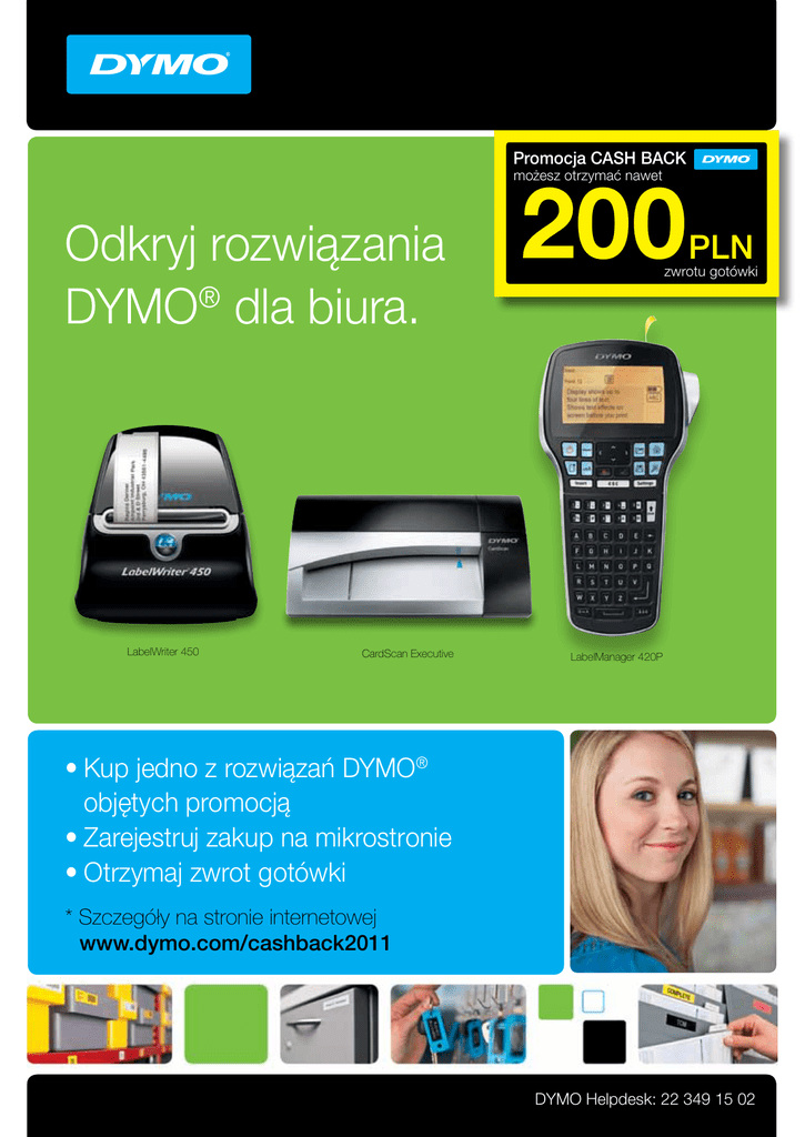 Promocja CASH BACK 200 możesz otrzymać nawet Odkryj rozwiązania DYMO® dla biura. LabelWriter 450 CardScan Executive PLN zwrotu gotówki LabelManager 420P •Kup jedno z rozwiązań DYMO® objętych promocją •Zarejestruj zakup na mikrostronie •Otrzymaj zwrot gotówki * Szczegóły na stronie internetowej www.dymo.com/cashback2011 DYMO Helpdesk: 22 349 15 02 LabelWriter™ 450 Profesjonalna drukarka etykiet dla komputerów PC Efektywne drukowanie etykiet podstawowych dostępne na każdą kieszeń Profesjonalne rozwiązanie tworzenia etykiet i obsługi poczty dla zapracowanego biura. • Drukowanie do 51 etykiet na minutę (przy drukowaniu etykiet adresowych z 4 liniami) • W zestawie firmowe oprogramowanie DYMO Label™ V.8 oferujące ponad 100 stylów i zaprojektowanych szablonów etykiet Wypróbuj nowe etykiety DYMO LabelWriter: Uniwersalne etykiety na cenówki, 25x25 mm (ze specjalnym klejem nie pozostawiającym śladów) S0929120 Duże identyfikatory imienne z dziurką białe, 62x106 mm (bez kleju) S0929110 Etykiety wizytówkowe, białe, 51x89 mm (bez kleju) S0929100 Labelmanager™ 420P Twój zespół będzie pracować efektywniej, szybciej i mądrzej. Wybierz drukarkę etykiet, która podoła zadaniu. Wysokowydajna drukarka etykiet wyposażona w złącze PC Drukarka etykiet Dymo® Labelmanager™ 420P to bez wątpienia najlepszy wybór dla użytkowników, którzy polegają na etykietach w celu uczynienia miejsca pracy bardziej wydajnym i efektywnym. • Możliwość pracy autonomicznej lub podłączenia do komputera PC i wykorzystania oprogramowania DYMO Label Software do drukowania kodów kreskowych, logotypów, serii etykiet z plików baz danych i wielu innych. • Duży, 4-wierszowy wyświetlacz graficzny prezentuje efekty czcionki przed drukowaniem: 8 czcionek, 7 rozmiarów, 10 stylów pisma, 8 obramowań plus funkcja podkreślenia. • Zasilanie przy pomocy akumulatora litowo-jonowego – koniec z niewygodą i wydatkami związanymi z bateriami AA. • Obsługa taśm DYMO® D1 o szerokości: 6, 9, 12 i 19 mm. CardScan® Executive Zarządzaj danymi kontaktowymi, gromadź je i organizuj szybciej niż kiedykolwiek wcześniej. Zaawansowany system zarządzania kontaktami do komputerów PC i MAC® Zamień znajomości na potencjalne transakcje handlowe! Wystarczy zeskanować wizytówkę, a oprogramowanie CardScan® automatycznie wprowadzi dane w odpowiednie pola w cyfrowej książce adresowej. • Obejmuje szybki i dokładny, kolorowy skaner wizytówek oraz NOWE oprogramowanie CardScan® V9 do zarządzania kontaktami. • Możliwość skanowania danych bezpośrednio z wizytówek lub przenoszenia ich z wiadomości e-mail, stron internetowych i dokumentów metodą „przeciągnij i upuść”. • NOWY dodatek ułatwiający współpracę z programem Microsoft Outlook®! Możliwość bezpośredniego skanowania wizytówek do książki adresowej programu Outlook® (dotyczy wyłącznie systemu Windows®). • NOWA funkcja „Zapisz jako”! Możliwość zapisywania dowolnych plików CardScan® w formacie .csv (arkusz kalkulacyjny) lub .vcf (VCard). • Edytowanie, sortowanie, wyszukiwanie i kategoryzowanie kontaktów, a także usuwanie podwójnych wpisów jest teraz łatwiejsze niż kiedykolwiek. • Jednym kliknięciem można wygenerować mapkę adresu osoby kontaktowej. • Możliwość drukowania jednym kliknięciem etykiet dla osób kontaktowych za pomocą drukarki etykiet DYMO® LabelWriter™ serii 400 lub LabelWriter™ serii 450 (dostępne osobno).• Możliwość bezproblemowej synchronizacji z programami Outlook®, Outlook® Express, Palm®, Windows Mobile®, Windows Contacts, Act!™ for Workgroups w wersjach Standard i Premium oraz Lotus Notes® (Windows®) bądź Mac® Address Book (Macintosh®). DYMO Helpdesk: 22 349 15 02