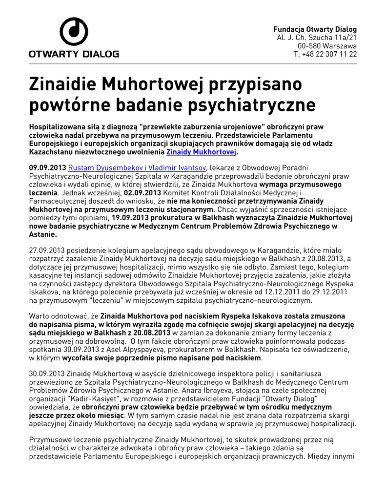 Fundacja Otwarty Dialog Al. J. Ch. Szucha 11a/21 00-580 Warszawa T: +48 22 307 11 22 Zinaidie Muhortowej przypisano powtórne badanie psychiatryczne Hospitalizowana siłą z diagnozą "przewlekłe zaburzenia urojeniowe" obrończyni praw człowieka nadal przebywa na przymusowym leczeniu. Przedstawiciele Parlamentu Europejskiego i europejskich organizacji skupiających prawników domagają się od władz Kazachstanu niezwłocznego uwolnienia Zinaidy Mukhortovej. 09.09.2013 Rustam Dyusembekov i Vladimir Ivantsov, lekarze z Obwodowej Poradni Psychiatryczno-Neurologicznej Szpitala w Karagandzie przeprowadzili badanie obrończyni praw człowieka i wydali opinię, w której stwierdzili, że Zinaida Mukhortova wymaga przymusowego leczenia. Jednak wcześniej, 02.09.2013 Komitet Kontroli Działalności Medycznej i Farmaceutycznej doszedł do wniosku, że nie ma konieczności przetrzymywania Zinaidy Mukhortovej na przymusowym leczeniu stacjonarnym. Chcąc wyjaśnić sprzeczności istniejące pomiędzy tymi opiniami, 19.09.2013 prokuratura w Balkhash wyznaczyła Zinaidzie Mukhortovej nowe badanie psychiatryczne w Medycznym Centrum Problemów Zdrowia Psychicznego w Astanie. 27.09.2013 posiedzenie kolegium apelacyjnego sądu obwodowego w Karagandzie, które miało rozpatrzyć zażalenie Zinaidy Mukhortovej na decyzję sądu miejskiego w Balkhash z 20.08.2013, a dotyczące jej przymusowej hospitalizacji, mimo wszystko się nie odbyło. Zamiast tego, kolegium kasacyjne tej instancji sądowej odmówiło Zinaidzie Mukhortovej przyjęcia zażalenia, jakie złożyła na czynności zastępcy dyrektora Obwodowego Szpitala Psychiatryczno-Neurologicznego Ryspeka Iskakova, na którego polecenie przebywała już wcześniej w okresie od 12.12.2011 do 29.12.2011 na przymusowym "leczeniu" w miejscowym szpitalu psychiatryczno-neurologicznym. Warto odnotować, że Zinaida Mukhortova pod naciskiem Ryspeka Iskakova została zmuszona do napisania pisma, w którym wyraziła zgodę ma cofnięcie swojej skargi apelacyjnej na decyzję sądu miejskiego w Balkhash z 20.08.2013 w zamian za dokonanie zmiany formy leczenia z przymusowej na dobrowolną. O tym fakcie obrończyni praw człowieka poinformowała podczas spotkania 30.09.2013 z Asel Alpyspayevą, prokuratorem w Balkhash. Napisała też oświadczenie, w którym wycofała swoje poprzednie pismo napisane pod naciskiem. 30.09.2013 Zinaidę Mukhortovą w asyście dzielnicowego inspektora policji i sanitariusza przewieziono ze Szpitala Psychiatryczno-Neurologicznego w Balkhash do Medycznego Centrum Problemów Zdrowia Psychicznego w Astanie. Anara Ibrayeva, stojąca na czele społecznej organizacji "Kadir-Kasiyet", w rozmowie z przedstawicielem Fundacji "Otwarty Dialog" powiedziała, że obrończyni praw człowieka będzie przebywać w tym ośrodku medycznym jeszcze przez około miesiąc. W tym samym czasie nadal nie jest znana data rozpatrzenia skargi apelacyjnej Zinaidy Mukhortovej na decyzję sądu wydaną w sprawie jej przymusowej hospitalizacji. Przymusowe leczenie psychiatryczne Zinaidy Mukhortovej, to skutek prowadzonej przez nią działalności w charakterze adwokata i obrońcy praw człowieka – takiego zdania są przedstawiciele Parlamentu Europejskiego i europejskich organizacji prawniczych. Między innymi Christiane Féral-Schuhl, Niccolò Rinaldi, a także Evangelos Tsouroulisw swoich pismach skierowanych do oficjalnych przedstawicieli kazachstańskich władz apelują o podjęcie natychmiastowych i skutecznych działań w celu uchylenia decyzji o przymusowym psychiatrycznym leczeniu Zinaidy Mukhortovej. Co więcej, domagają się od władz Kazachstanu gwarancji dla wszystkich obrońców praw człowieka w kraju, aby mogli legalnie prowadzić swoją działalność, nie obawiając się represji i ograniczeń, w tym ścigania przez sąd. Ze swojej strony Fundacja "Otwarty Dialog" nalega, aby niezwłocznie i bez jakichkolwiek warunków uwolniono adwokata i obrończynię praw człowieka Zinaidę Mukhortovą. Uważamy, iż prześladowanie Zinaidy Mukhrtovej rozpoczęło się wtedy, gdy oskarżyła ona deputowanego izby niższej parlamentu Yerlana Nigmatulina o wykorzystywanie przez niego swojego wysokiego stanowiska służbowego do wywierania nacisku na sąd, aby ten podjął korzystne dla niego decyzje. Zgodnie z artykułami 16 i 17 "Podstawowych zasad dotyczących roli prawników" ONZ, kazachstańskie władze są zobowiązane do zapewnienia Zinaidzie Mukhortovej właściwej obrony przed ściganiem za działania dokonane zgodnie z uznanymi obowiązkami zawodowymi. Apelujemy również do władz Kazachstanu o pociągnięcie do odpowiedzialności zastępcy dyrektora Obwodowego Psychiatryczno-Neurologicznego Szpitala w Balkhash Ryspeka Iskakova, który być może jest winny dokonania bezprawnej i przymusowej hospitalizacji Zinaidy Mukhortovej oraz poddania jej długotrwałemu i przymusowemu leczeniu. Takie działania osoby zajmującej stanowisko w państwowej placówce medycznej pozostają w sprzeczności z międzynarodowymi zobowiązaniami Kazachstanu w sferze gwarantowania praw obywatelskich i politycznych, bowiem naruszają między innymi artykuły 7 i 9 Międzynarodowego Paktu o prawach obywatelskich i politycznych. Ponadto rekomendujemy odwołanie opinii wydanej 09.09.2013 przez Komisję Obwodowej Poradni PsychiatrycznoNeurolgicznej Szpitala w Karagandzie, dotyczącej stanu zdrowia psychicznego Zinaidy Mukhortovej jako nieobiektywnej i stronniczej, gdyż sporządzonej przez pracowników placówki, w której przetrzymywana jest obrończyni praw człowieka. Zwracamy się do przedstawicielstwa OBWE, ONZ i UE w Republice Kazachstanu z prośbą o: wnikliwe i całościowe śledzenie sytuacji w zakresie przestrzegania rzetelności prowadzenia postępowań przez sąd; wyrażenie oficjalnego stanowiska na temat coraz częściej stosowanej praktyki polegającej na wykorzystywaniu psychiatrii represyjnej jako metody w walce z odmiennymi poglądami w kraju; domaganie się od wła