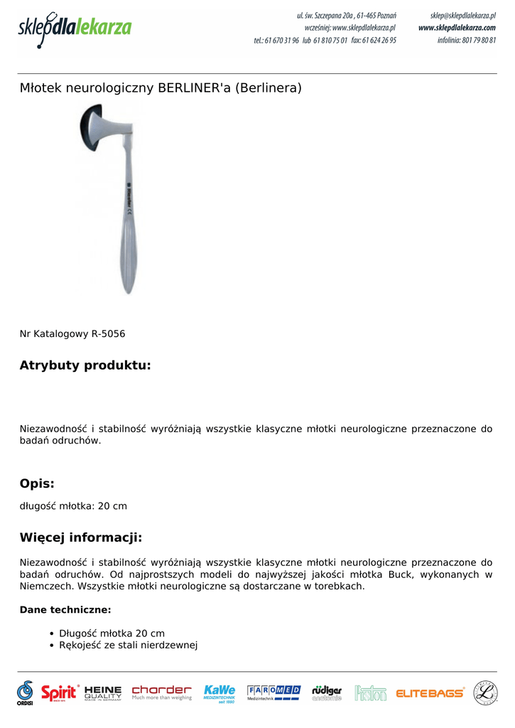 Młotek neurologiczny BERLINER'a (Berlinera) Nr Katalogowy R-5056 Atrybuty produktu: Niezawodność i stabilność wyróżniają wszystkie klasyczne młotki neurologiczne przeznaczone do badań odruchów. Opis: długość młotka: 20 cm Więcej informacji: Niezawodność i stabilność wyróżniają wszystkie klasyczne młotki neurologiczne przeznaczone do badań odruchów. Od najprostszych modeli do najwyższej jakości młotka Buck, wykonanych w Niemczech. Wszystkie młotki neurologiczne są dostarczane w torebkach. Dane techniczne: Długość młotka 20 cm Rękojeść ze stali nierdzewnej Powered by TCPDF (www.tcpdf.org)