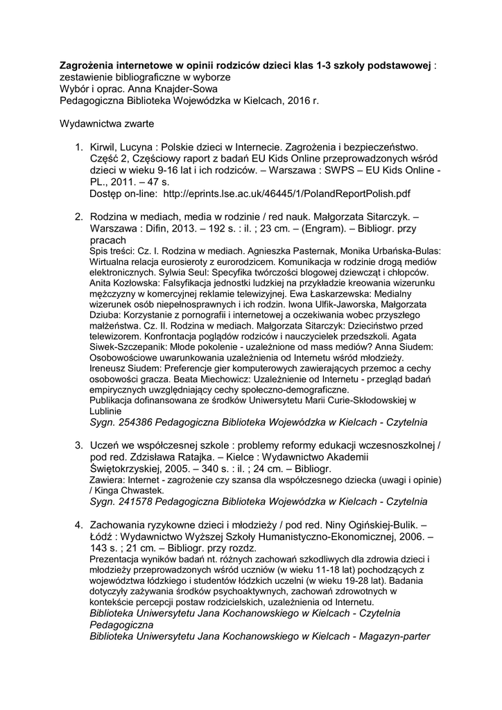 Zagrożenia internetowe w opinii rodziców dzieci klas 1-3 szkoły podstawowej : zestawienie bibliograficzne w wyborze Wybór i oprac. Anna Knajder-Sowa Pedagogiczna Biblioteka Wojewódzka w Kielcach, 2016 r. Wydawnictwa zwarte 1. Kirwil, Lucyna : Polskie dzieci w Internecie. Zagrożenia i bezpieczeństwo. Część 2, Częściowy raport z badań EU Kids Online przeprowadzonych wśród dzieci w wieku 9-16 lat i ich rodziców. – Warszawa : SWPS – EU Kids Online PL., 2011. – 47 s. Dostęp on-line: http://eprints.lse.ac.uk/46445/1/PolandReportPolish.pdf 2. Rodzina w mediach, media w rodzinie / red nauk. Małgorzata Sitarczyk. – Warszawa : Difin, 2013. – 192 s. : il. ; 23 cm. – (Engram). – Bibliogr. przy pracach Spis treści: Cz. I. Rodzina w mediach. Agnieszka Pasternak, Monika Urbańska-Bulas: Wirtualna relacja eurosieroty z eurorodzicem. Komunikacja w rodzinie drogą mediów elektronicznych. Sylwia Seul: Specyfika twórczości blogowej dziewcząt i chłopców. Anita Kozłowska: Falsyfikacja jednostki ludzkiej na przykładzie kreowania wizerunku mężczyzny w komercyjnej reklamie telewizyjnej. Ewa Łaskarzewska: Medialny wizerunek osób niepełnosprawnych i ich rodzin. Iwona Ulfik-Jaworska, Małgorzata Dziuba: Korzystanie z pornografii i internetowej a oczekiwania wobec przyszłego małżeństwa. Cz. II. Rodzina w mediach. Małgorzata Sitarczyk: Dzieciństwo przed telewizorem. Konfrontacja poglądów rodziców i nauczycielek przedszkoli. Agata Siwek-Szczepanik: Młode pokolenie - uzależnione od mass mediów? Anna Siudem: Osobowościowe uwarunkowania uzależnienia od Internetu wśród młodzieży. Ireneusz Siudem: Preferencje gier komputerowych zawierających przemoc a cechy osobowości gracza. Beata Miechowicz: Uzależnienie od Internetu - przegląd badań empirycznych uwzględniający cechy społeczno-demograficzne. Publikacja dofinansowana ze środków Uniwersytetu Marii Curie-Skłodowskiej w Lublinie Sygn. 254386 Pedagogiczna Biblioteka Wojewódzka w Kielcach - Czytelnia 3. Uczeń we współczesnej szkole : problemy reformy edukacji wczesnoszkolnej / pod red. Zdzisława Ratajka. – Kielce : Wydawnictwo Akademii Świętokrzyskiej, 2005. – 340 s. : il. ; 24 cm. – Bibliogr. Zawiera: Internet - zagrożenie czy szansa dla współczesnego dziecka (uwagi i opinie) / Kinga Chwastek. Sygn. 241578 Pedagogiczna Biblioteka Wojewódzka w Kielcach - Czytelnia 4. Zachowania ryzykowne dzieci i młodzieży / pod red. Niny Ogińskiej-Bulik. – Łódź : Wydawnictwo Wyższej Szkoły Humanistyczno-Ekonomicznej, 2006. – 143 s. ; 21 cm. – Bibliogr. przy rozdz. Prezentacja wyników badań nt. różnych zachowań szkodliwych dla zdrowia dzieci i młodzieży przeprowadzonych wśród uczniów (w wieku 11-18 lat) pochodzących z województwa łódzkiego i studentów łódzkich uczelni (w wieku 19-28 lat). Badania dotyczyły zażywania środków psychoaktywnych, zachowań zdrowotnych w kontekście percepcji postaw rodzicielskich, uzależnienia od Internetu. Biblioteka Uniwersytetu Jana Kochanowskiego w Kielcach - Czytelnia Pedagogiczna Biblioteka Uniwersytetu Jana Kochanowskiego w Kielcach - Magazyn-parter Wydawnictwa ciągłe 5. Bukrejewska, Iwona Bożena : Środki medialne w opinii dzieci i ich rodziców. W: Wychowanie na Co Dzień. – 2008, nr 4/5, s. 11-16 Środki masowego przekazu - socjologia - badanie - Polska - 21 w. Czas wolny od pracy ucznia - badanie - Polska - 21 w. Uczniowie szkół podstawowych - socjologia - badanie - Polska - 21 w. Czas wolny od pracy - badanie - Polska - 21 w. Rodzice - socjologia - badanie - Polska - 21 w. Edukacja medialna Pedagogiczna Biblioteka Wojewódzka w Kielcach – Czytelnia 6. Delmanowicz, Grzegorz : Internet a życie rodzinne. W: Wychowawca. – 2009, nr 9, s. 20-24 Wychowanie do dojrzałego korzystania z Interetu. Zagrożenia w sieci. Pedagogiczna Biblioteka Wojewódzka w Kielcach – Czytelnia 7. Knol-Michałowska, Kamila : Rola rodziny w interwencji i profilaktyce zagrożeń w Internecie. W: Studia Edukacyjne. – 2012, nr 23, s. [301]-327 Przegląd badań podejmujących kwestię wykorzystywania Internetu przez dzieci i młodzież oraz dorosłych, postrzegania korzyści i zagrożeń z tym związanych oraz podejmowanych przez dorosłych działań na rzecz zapewnienia dzieciom bezpieczeństwa. Przegląd wybranych inicjatyw, realizowanych w Polsce przez organizacje i instytucje zajmujące się problemem bezpieczeństwa w Sieci, skierowanych do rodziców/opiekunów. Przeanalizowano między innymi, jakiego rodzaju treści i materiały dedykowane są tej grupie docelowej oddziaływań edukacyjnych. Dogłębnej analizie poddano wskazówki udzielane dorosłym, dotyczące sposobu postępowania z dziećmi korzystającymi z Internetu. Podjęto próbę wskazania obszarów potrzeb edukacyjnych rodziny i modelowego zakresu tematycznego przedsięwzięć dedykowanych rodzicom i opiekunom. Dostęp on-line: https://repozytorium.amu.edu.pl/bitstream/10593/5913/1/studia_eduk_23_s_3 01-328.pdf 8. Kowalczuk, Piotr : Posługuję się myszą i klawiaturą. W: Wychowawca. – 2009, nr 9, s. 25 Czy podstawa programowa nadąża za uczniem ? Umieszczone w podstawie treści dla edukacji wczesnoszkolnej nie odpowiadają faktycznej znajomości komputera przez dzieci. Refleksje autora na podstawie raportów z badań: "Rodzice wobec zagrożeń dzieci w Internecie" oraz badań przeprowadzonych w ramach działalności Fundacji "Dzieci niczyje" dotyczących zagrożeń w sieci. Pedagogiczna Biblioteka Wojewódzka w Kielcach – Czytelnia 9. Kroker, Natalia : O zagrożeniach w sieci. W: Problemy OpiekuńczoWychowawcze. – 2015, nr 10, s. 33-37 Internet jako źródło informacji, komunikacji oraz miejsce zagrożeń. Przykłady zagrożeń (m.in. cyberprzemoc, seksting). Edukowanie rodziców jako sposób na zwiększenie bezpieczeństwa dzieci i młodzieży. Pedagogiczna Biblioteka Wojewódzka w Kielcach – Czytelnia 10. Krzyżak-Szymańska, Ewa : Wychowanie dzieci do korzystania 