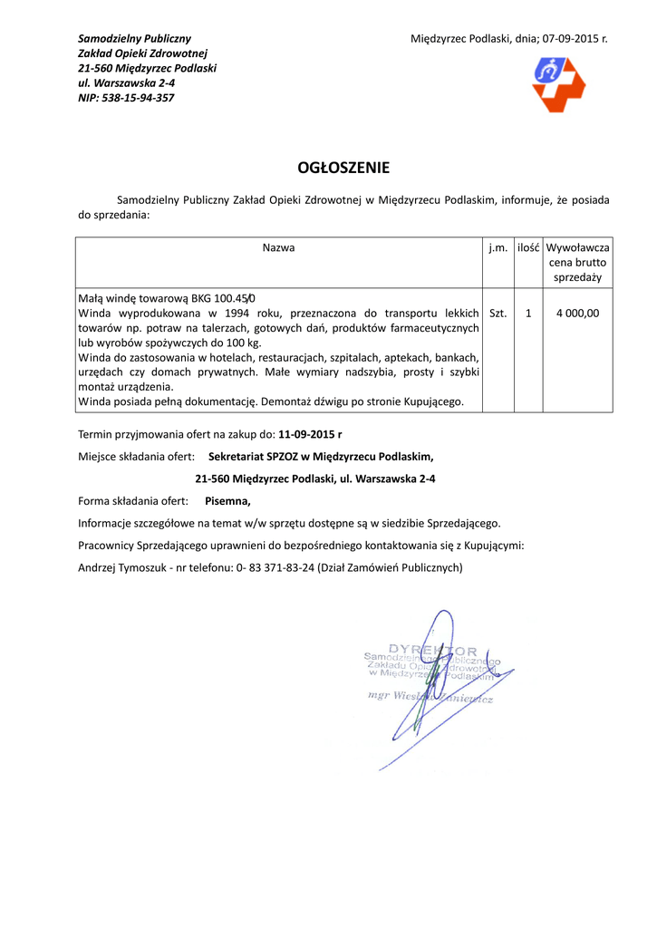 sprzedaż windy 2015 - Samodzielny Publiczny Zakład Opieki