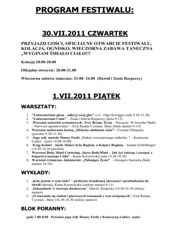 PROGRAM FESTIWALU: 30.VII.2011 CZWARTEK PRZYJAZD GOŚCI, OFICJALNE OTWARCIE FESTIWALU, KOLACJA, OGNISKO, WIECZORNA ZABAWA TANECZNA „WYGINAM ŚMIAŁO CIAŁO!!! Kolacja 18.00-20.00 Oficjalne otwarcie: 20.00-21.00 Wieczorna zabawa taneczna: 21.00- 24.00 (Dawid i Zosia Rzepeccy) 1.VII.2011 PIĄTEK WARSZTATY: 1. "Laboratorium głosu - odkryj swój głos" cz.I - Olga Szwajger (sala 9.30-13.30) 2. "Laboratorium Ciała" – Zosia i Dawid Rzepeccy (jurta 9-13) 3. Warsztat ustawień systemowych: Trzy Bramy Życia – Poczęcie- W brzuchu Matki – Pierwsze ugruntowanie” - Ewa Renata Cyzman- Bany (biały namiot 9-13) 4. Warsztat malowania henną „Mistyka zdobienia ciała”- Urszula Chłopicka (pawilon 9.30-13.30) 5. Joga wdł. metody Donny Farhi „Piękno wewnętrznego oddechu..” – Katarzyna Lubicz (jurta 14.00-18.00) 6. Krąg Kobiet – kiedy Słońce było Bogiem, a Księżyc Boginią – Joanna Eichelberger (14.30-18.30 pawilon) 7. Warsztat Body Mind Centering „Serce BodyMind – Jak żyć tańcząc i czerpać z bogactwa naszego Ciała” - Kama Korytowska (sala 14.30-18.30) 8. Warsztat rytmiczno -bębniarski: „Pulsujące Życie” – Grzegorz Surówka (biały namiot 14-18) WYKŁADY: 1. „Kim jestem w tym ciele? – praktyka świadomej obecności i przebudzenia do chwili obecnej, Kama Korytowska (zielony namiot 9-11) 2. „Seksualność w rozwoju duchowym”, Dawid Rzepecki (14.30-16.30 zielony namiot) 3. „O stawaniu się ciałem i pierwszych traumach z tym związanych”, Ewa Renata Cyzman - Bany (16.30-18.30 zielony namiot) BLOK PORANNY: godz 7.00-8.00 Poranna joga wdł. Donny Farhi z Katarzyną Lubicz (sala) WYDARZENIA WIECZORNE: Godz. 19.30- 21.30 Wykład „Symbolika malowania ciała henną w oparciu o tradycję indyjską, perską i arabską” oraz pokaz malowania henną ze slajdami i na żywo (Urszula Chłopicka) Godz. 21.30 DUŻA IMPREZA TANECZNA Z BĘBNAMI I WSPÓLNYM MYZYKOWANIEM (Grzegorz Surówka SURYA + przyjaciele) PROPOZYCJE DODATKOWE – SESJE INDYWIDUALNE: 1. 2. 3. 4. 5. 6. 7. 8. Body Mind Centering - Kama Korytowska Ustawienia rodzinne – Kama Korytowska Psychologia Somatyczna –Kama Korytowska Wewnętrzny Dialog – Kama Korytowska Masaże (klasyczny, holistyczny, chinski) – Anna Romanowska Masaż dźwiękiem mis - Kuba Dorosz Ustawienia systemowe – Ewa Renata Cyzman – Bany Malowanie ciała henną – Urszula Chlopicka 2.VII.2011 SOBOTA WARSZTATY: 1. "Laboratorium głosu - Odkryj swój głos" cz.II - Olga Szwajger (9-13 sala) 2. Joga wdł. metody Donny Farhi „Piękno wewnętrznego oddechu..” – Katarzyna Lubicz (pawilon 9.30-13.30) 3. Warsztat pracy z ciałem „Od stóp do głów” – Agata Głowacka (9.30-13.30 jurta) 4. Mini warsztat /prezentacja "Kobieta i mężczyzna w poszukiwaniu harmonii życia. Fizyczne, psychiczne i duchowe aspekty naszego zdrowia" dr Preeti Agrawal ( bialy namiot 10-12 ) 5. Warsztat ustawień systemowych Trzy Bramy Życia – Narodziny i traumy okołopoorodowe - Ewa Cyzman (zielony namiot 9-13) 6. Holistyczne podejście do zdrowia kobiety – dr Preeti Agrawal ( sala 14-18) 7. Warsztat pracy z rytmem i ciałem „Poprzez rytm i ciszę – poszerzanie percepcji ciała”– Grzegorz Surówka (jurta 14.30-18.30) 8. „Od obecności do oparcia w sobie – zarządzanie energią życiową w stresie metodą 8xO” – Bronisław Świątkowski (15-19 biały namiot ) 9. Warsztat Dance Movement Therapy „Zapomniane biodra- odkryj źródło swojej mocy” Izabela Dominko (pawilon 14.30-18.30) WYKŁADY: 1. „Zarządzanie energią życiową w stresie metodą 8xO” – Bronisław Świątkowski (12-14 biały namiot) 2. „Twoje ciało, Twoim nauczycielem” – Agata Głowacka (15-17 zielony namiot) 3. wykład/prezentacja „Laboratorium głosu”, Olga Szwajgier 18-19.30 (sala) 4. Ustawienia systemowe: To co z Matki i Ojca w nas samych – jak to przyjąć i zagospodarować dla siebie”, - Ewa Renata Cyman- Bany (17-19 zielony namiot) BLOK PORANNY: Godz. 7.00-8.00 Medytacja poranna – ciało jako medytacja (Kama Korytowska, sala) WYDARZENIE WIECZORNE: godz. 20.00 -23.00: Debata „Ciało –naturalne piękno czy dyktatura piękna XX i XXI wieku” z udziałem: Wojciech Eichelberger, Olga Szwajgier, Preeti Agrawal, Olga Haller, prof. Magdalena Środa i inni goście PROPOZYCJE DODATKOWE – SESJE INDYWIDUALNE: 1. 2. 3. 4. 5. 6. 7. 8. 9. Konsultacje medyczne z dr Preete Agrawal Body Mind Centering - Kama Korytowska Ustawienia rodzinne – Kama Korytowska Psychologia Somatyczna –Kama Korytowska Wewnętrzny Dialog – Kama Korytowska Masaże (klasyczny, holistyczny, chiński) – Anna Romanowska Masaż dźwiękiem mis – Kuba Dorosz Ustawienia systemowe – Ewa Renata Cyzman – Bany Malowanie ciała henną – Urszula Chlopicka 3.VII.2011 NIEDZIELA WARSZTATY: 1. 2. 3. 4. „Umysł i ciało” Wojciech Eichelberger (14-17 sala ) "Laboratorium głosu - Odkryj swój głos" cz.I - Olga Szwajgier (9-13 sala) „Dialog z ciałem - spotkanie z sobą” – Olga Haller, cz.I. (9-13 pawilon ) „Świadome wejście w kobiecą dojrzałość – czyli jak oswoić przemijanie” – dr Preeti Agrawal (9-13 jurta) 5. „Od obecności do oddechu - zarządzanie energią życiową w stresie metodą 8xO” – Bronisław Świątkowski ( 9.30-13.30 biały namiot) 6. Warsztat pracy z ciałem „Rozwiń skrzydła” – Agata Głowacka (17.15– 21.45 sala, przerwa na lekką kolację 19-19.30) 7. "Duchowość Seksu" – Zosia i Dawid Rzepeccy ( jurta., 17.15– 21.45, przerwa na lekką kolację 19-19.30) 8. Warsztat Dance Movement Therapy „W poszukiwaniu mojego tańca, czyli moich korzeni i skrzydeł” - Izabela Dominko (17.15– 21.45 przerwa na lekką kolację 19-19.30, pawilon) 9. Warsztat rytmiczno- bębniarski: „Pozytywne uziemienie poprzez Rytm”Grzegorz Surówka 17.15- 21.45 (zielony namiot lub weranda, przerwa na lekką kolację 19-19.30) WYKŁADY: 1. Zastosowanie metod Terapii Tańcem i Ruchem jako praktyk leczniczych i rozwojowy