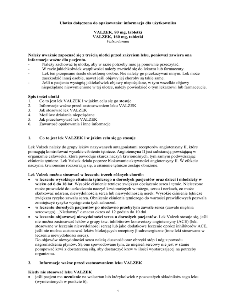 Ulotka dołączona do opakowania: informacja dla użytkownika VALZEK, 80 mg, tabletki VALZEK, 160 mg, tabletki Valsartanum Należy uważnie zapoznać się z treścią ulotki przed zażyciem leku, ponieważ zawiera ona informacje ważne dla pacjenta. Należy zachować tę ulotkę, aby w razie potrzeby móc ją ponownie przeczytać. W razie jakichkolwiek wątpliwości należy zwrócić się do lekarza lub farmaceuty. Lek ten przepisano ściśle określonej osobie. Nie należy go przekazywać innym. Lek może zaszkodzić innej osobie, nawet jeśli objawy jej choroby są takie same. Jeśli u pacjenta wystąpią jakiekolwiek objawy niepożądane, w tym wszelkie objawy niepożądane niewymienione w tej ulotce, należy powiedzieć o tym lekarzowi lub farmaceucie. Spis treści ulotki 1. Co to jest lek VALZEK i w jakim celu się go stosuje 2. Informacje ważne przed zastosowaniem leku VALZEK 3. Jak stosować lek VALZEK 4. Możliwe działania niepożądane 5. Jak przechowywać lek VALZEK 6. Zawartość opakowania i inne informacje 1. Co to jest lek VALZEK i w jakim celu się go stosuje Lek Valzek należy do grupy leków nazywanych antagonistami receptorów angiotensyny II, które pomagają kontrolować wysokie ciśnienie tętnicze. Angiotensyna II jest substancją powstającą w organizmie człowieka, która powoduje skurcz naczyń krwionośnych, tym samym podwyższając ciśnienie tętnicze. Lek Valzek działa poprzez blokowanie aktywności angiotensyny II. W efekcie naczynia krwionośne rozszerzają się, a ciśnienie tętnicze zostaje obniżone. Lek Valzek można stosować w leczeniu trzech różnych chorób: w leczeniu wysokiego ciśnienia tętniczego u dorosłych pacjentów oraz dzieci i młodzieży w wieku od 6 do 18 lat. Wysokie ciśnienie tętnicze zwiększa obciążenie serca i tętnic. Nieleczone może prowadzić do uszkodzenia naczyń krwionośnych w mózgu, sercu i nerkach, co może skutkować udarem, niewydolnością serca lub niewydolnością nerek. Wysokie ciśnienie tętnicze zwiększa ryzyko zawału serca. Obniżenie ciśnienia tętniczego do wartości prawidłowych pozwala zmniejszyć ryzyko wystąpienia tych zaburzeń. w leczeniu dorosłych pacjentów po niedawno przebytym zawale serca (zawale mięśnia sercowego). „Niedawny” oznacza okres od 12 godzin do 10 dni. w leczeniu objawowej niewydolności serca u dorosłych pacjentów. Lek Valzek stosuje się, jeśli nie można zastosować leków z grupy tzw. inhibitorów konwertazy angiotensyny (ACE) (leki stosowane w leczeniu niewydolności serca) lub jako dodatkowe leczenie oprócz inhibitorów ACE, jeśli nie można zastosować leków blokujących receptory β-adrenergiczne (inne leki stosowane w leczeniu niewydolności serca). Do objawów niewydolności serca należą duszność oraz obrzęki stóp i nóg z powodu nagromadzenia płynów. Są one spowodowane tym, że mięsień sercowy nie jest w stanie pompować krwi z dostateczną siłą, aby dostarczyć krew w ilości wystarczającej na potrzeby organizmu. 2. Informacje ważne przed zastosowaniem leku VALZEK Kiedy nie stosować leku VALZEK jeśli pacjent ma uczulenie na walsartan lub którykolwiek z pozostałych składników tego leku (wymienionych w punkcie 6); 1 jeśli u pacjenta występuje ciężka choroba wątroby; jeśli pacjentka jest w ciąży powyżej 3. miesiąca (nie zaleca się również stosowania leku Valzek we wczesnym okresie ciąży – patrz punkt „Ciąża i karmienie piersią”); jeśli pacjent ma cukrzycę lub zaburzenia czynności nerek i jest leczony lekiem obniżającym ciśnienie tętnicze, zawierającym aliskiren. Jeśli którykolwiek z powyższych stanów dotyczy pacjenta, nie wolno stosować leku Valzek. Ostrzeżenia i środki ostrożności Przed rozpoczęciem stosowania leku Valzek należy omówić to z lekarzem lub farmaceutą: jeśli u pacjenta występuje choroba wątroby; jeśli stwierdzono ciężką chorobę nerek lub jeśli pacjent poddawany jest dializoterapii; w przypadku zwężenia tętnicy nerkowej; jeśli pacjentowi przeszczepiono niedawno nerkę (pacjent otrzymał nową nerkę); u pacjentów po zawale serca lub pacjentów z niewydolnością serca, lekarz może kontrolować czynność nerek; jeśli stwierdzono ciężką chorobę serca, inną niż niewydolność serca lub zawał serca; jeśli u pacjenta kiedykolwiek wystąpił obrzęk języka i twarzy spowodowany reakcją alergiczną, nazywaną obrzękiem naczynioruchowym po przyjęciu innego leku (w tym inhibitora ACE), należy powiedzieć o tym lekarzowi. Jeśli takie objawy wystąpią podczas stosowania leku Valzek, należy natychmiast przerwać jego przyjmowanie i nigdy więcej go nie stosować - patrz także punkt 4; jeśli pacjent stosuje leki, które zwiększają stężenie potasu we krwi. Są to suplementy potasu lub substytuty soli kuchennej zawierające potas, leki oszczędzające potas i heparyny. Konieczna może być regularna kontrola stężenia potasu we krwi; jeśli pacjent jest w wieku poniżej 18 lat i przyjmuje lek Valzek w skojarzeniu z innymi lekami blokującymi układ renina-angiotensyna-aldosteron (lekami zmniejszającymi ciśnienie tętnicze), lekarz będzie regularnie kontrolował czynność nerek i stężenie potasu we krwi; jeśli u pacjenta stwierdzono hiperaldosteronizm (chorobę, w której nadnercza wytwarzają zbyt duże ilości hormonu o nazwie aldosteron) - w takim przypadku nie zaleca się stosowania leku Valzek; w przypadku znacznej utraty płynów (odwodnienie) w wyniku biegunki, wymiotów lub stosowania dużych dawek leków moczopędnych (diuretyków); należy powiedzieć lekarzowi o ciąży, podejrzeniu lub planowaniu ciąży - nie zaleca się stosowania leku Valzek we wczesnym okresie ciąży i nie wolno go stosować po 3. miesiącu ciąży, ponieważ może on poważnie zaszkodzić dziecku, jeśli zostanie zastosowany w tym okresie (patrz punkt „Ciąża i karmienie piersią”). jeśli pacjent przyjmuje którykolwiek z następujących leków, stoso